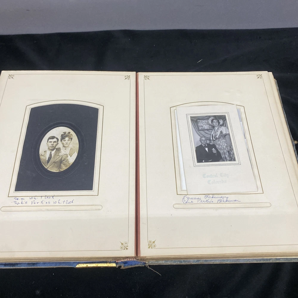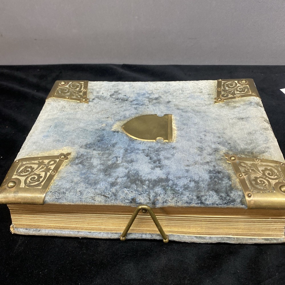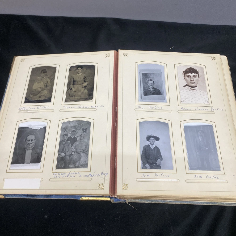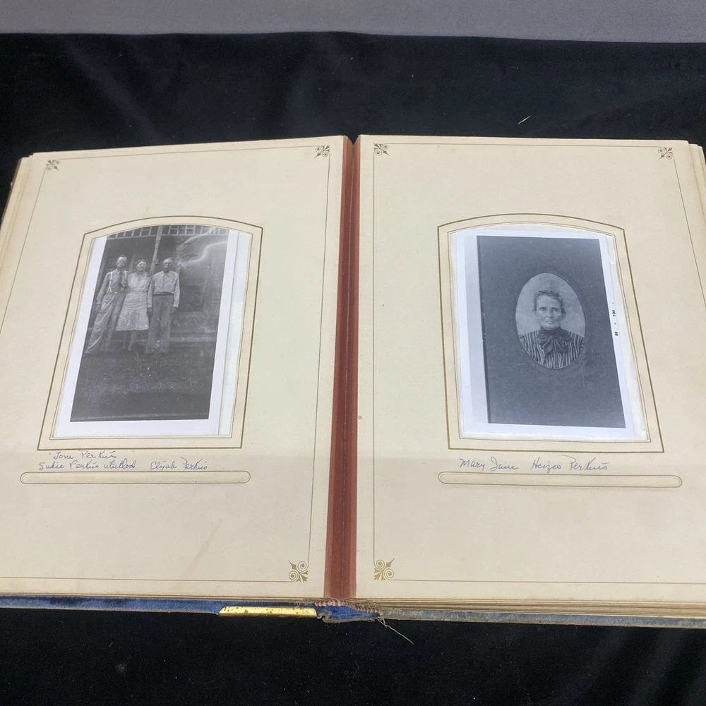 This antique blue velvet family album from the late 1890s to early and mid 1900s is a unique piece of Americana with brass accents and a latch closure. Filled with sepia-toned photographs of women, men, and families, this one-of-a-kind (OOAK) album is a vintage treasure originating from the United States. Measuring 12x9x3 inches, this fabric and cardboard album offers a glimpse into the past and would make a valuable addition to any collection of photographic images. In good shape. Some wear and discoloration to the fabric. Some Tarnish on the brass Some pages have damage and small tears. Mostly pics of the Blakeman,Perkins ,Hudson,Whitlock,Families from Kentucky Names written on photos and on pages. Has an index. Some other loose photos included