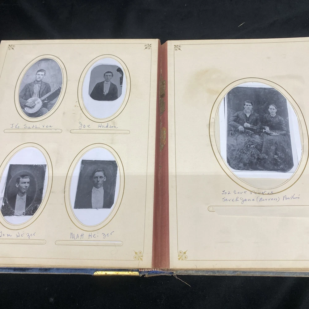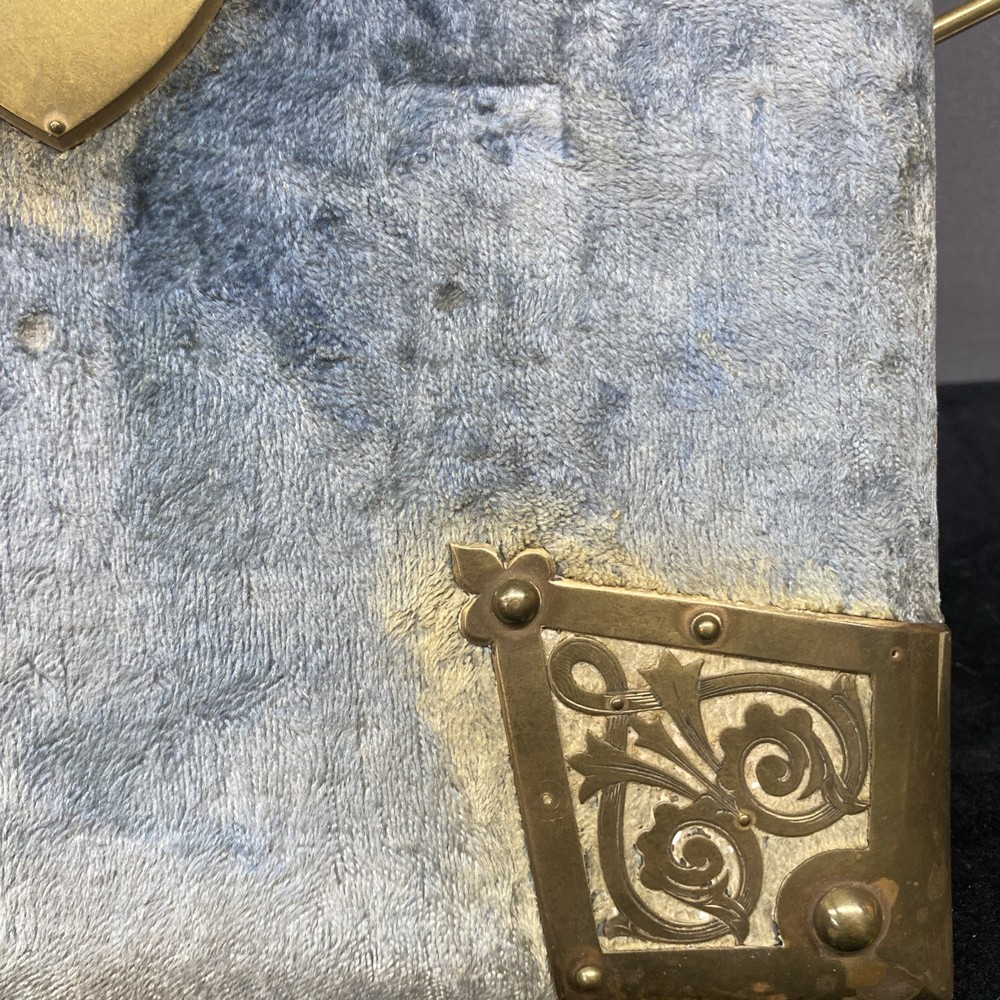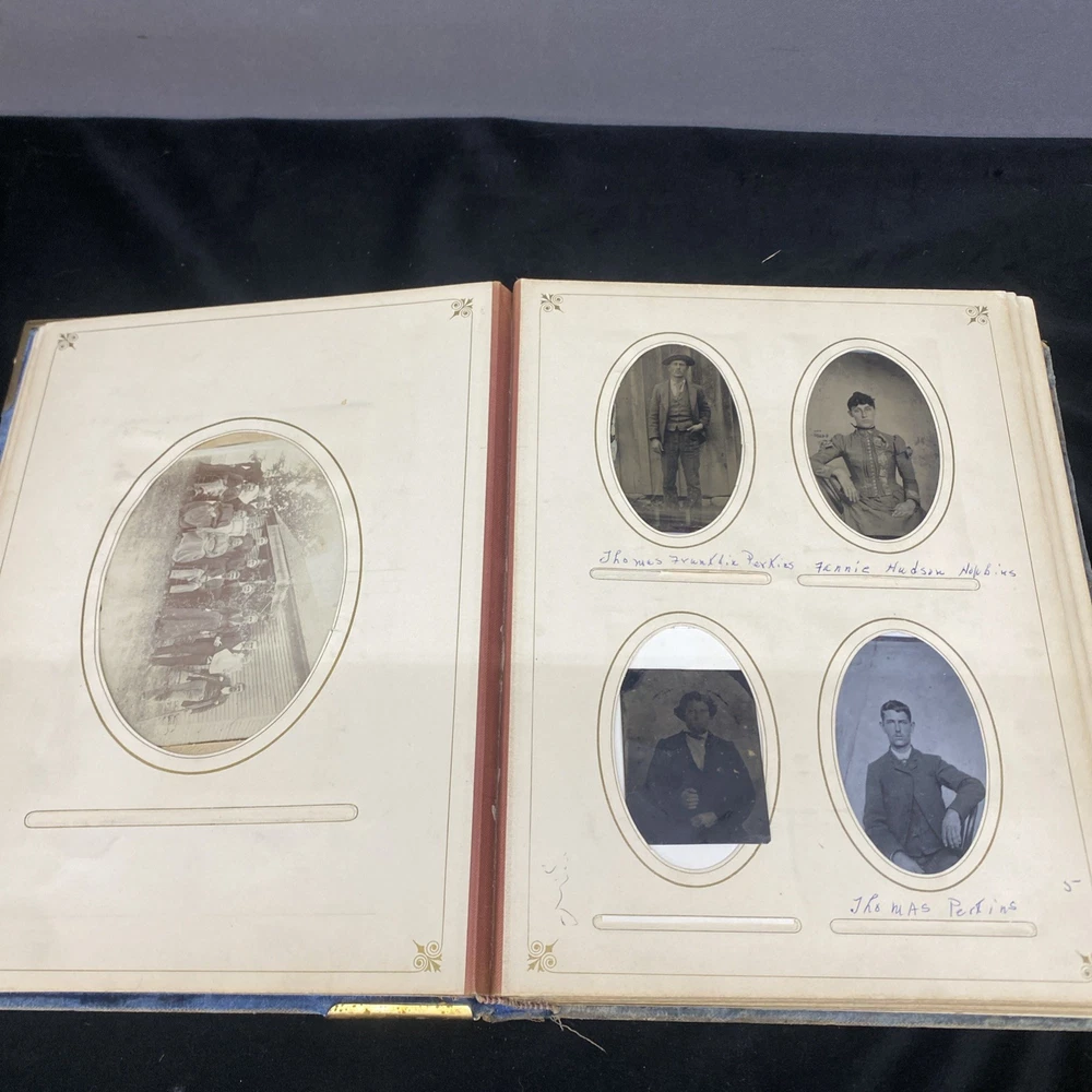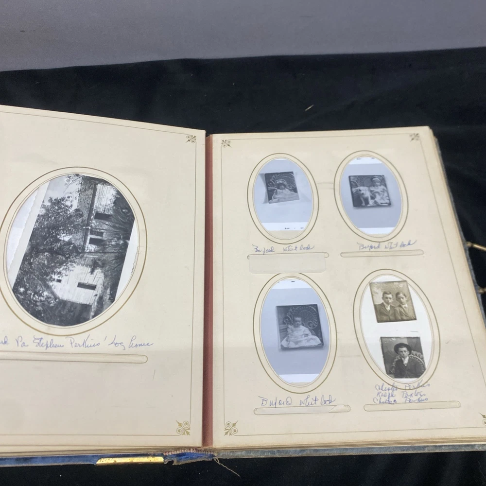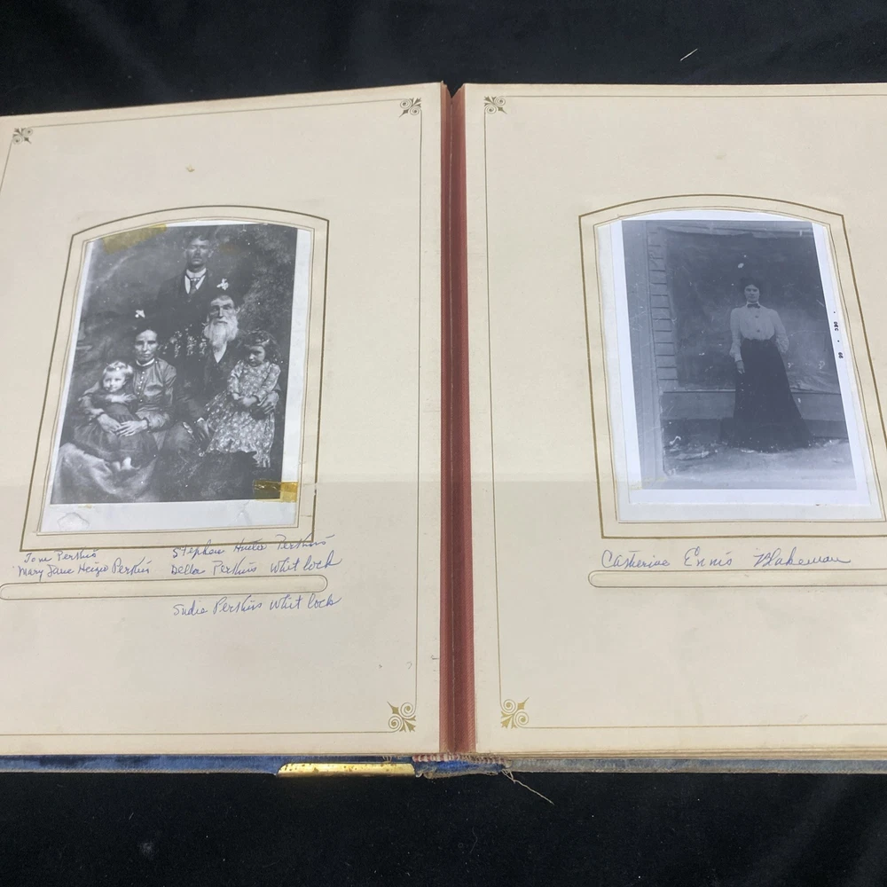 This antique blue velvet family album from the late 1890s to early and mid 1900s is a unique piece of Americana with brass accents and a latch closure. Filled with sepia-toned photographs of women, men, and families, this one-of-a-kind (OOAK) album is a vintage treasure originating from the United States. Measuring 12x9x3 inches, this fabric and cardboard album offers a glimpse into the past and would make a valuable addition to any collection of photographic images. In good shape. Some wear and discoloration to the fabric. Some Tarnish on the brass Some pages have damage and small tears. Mostly pics of the Blakeman,Perkins ,Hudson,Whitlock,Families from Kentucky Names written on photos and on pages. Has an index. Some other loose photos included