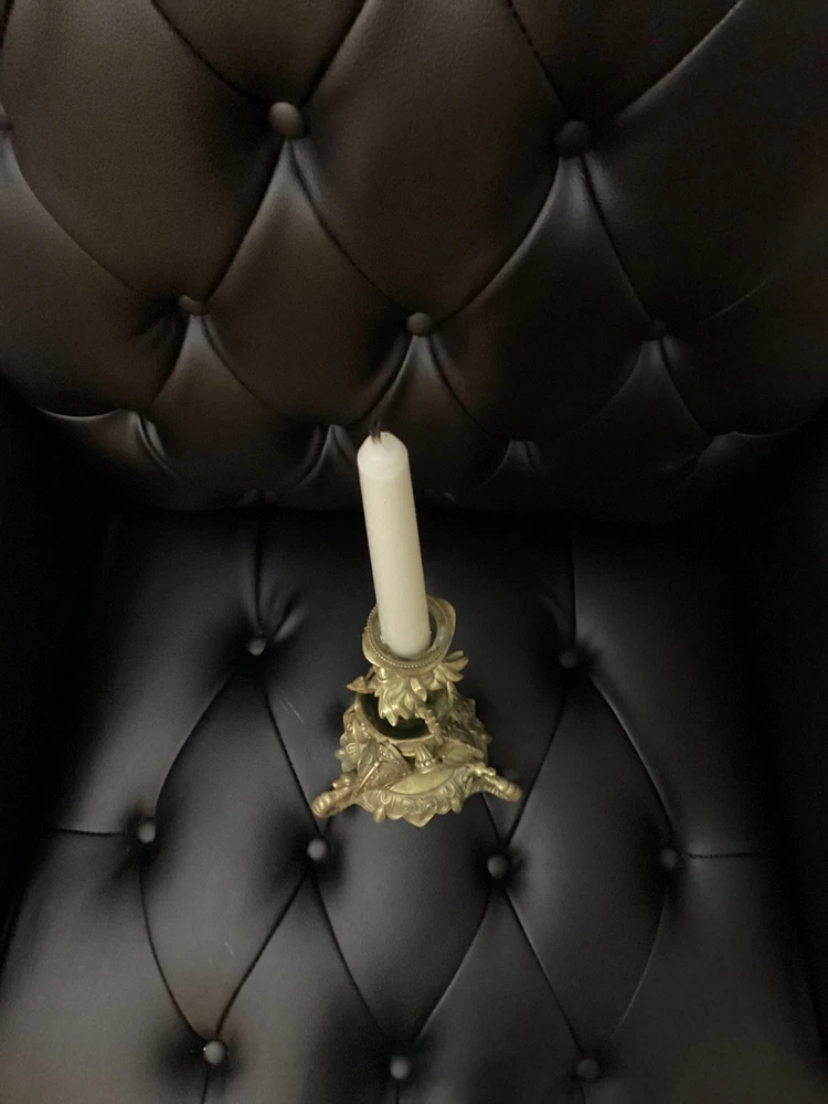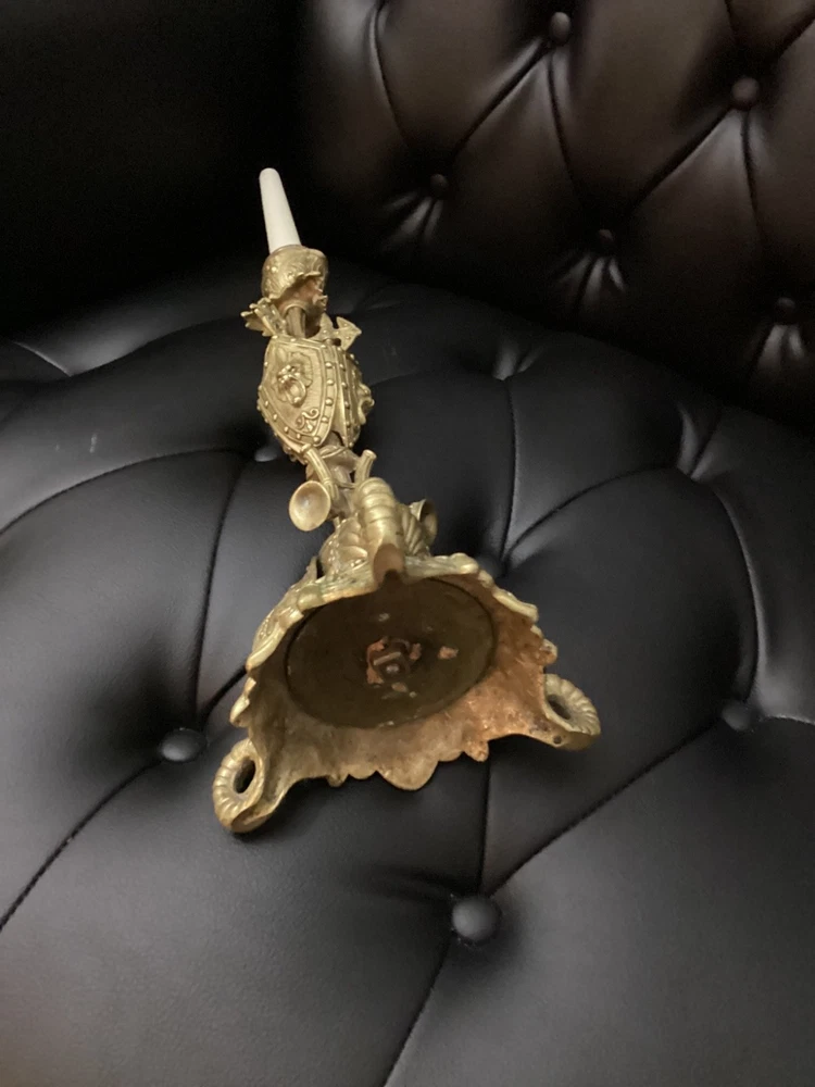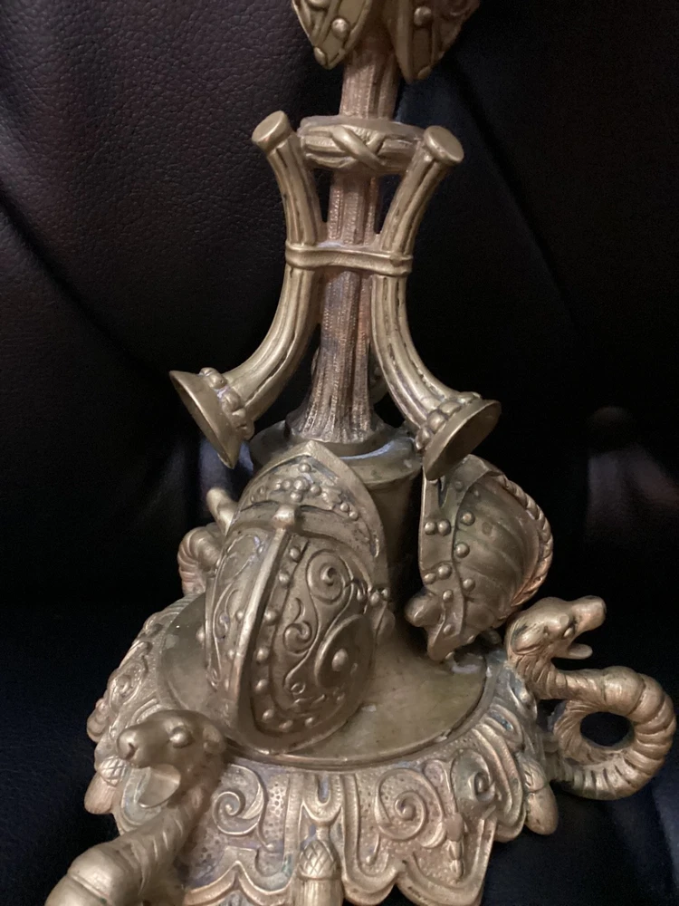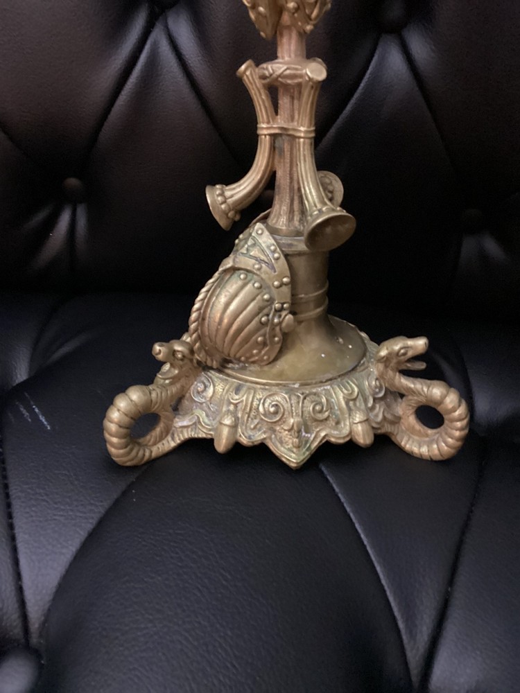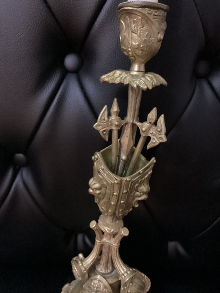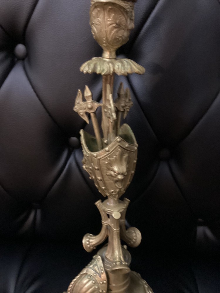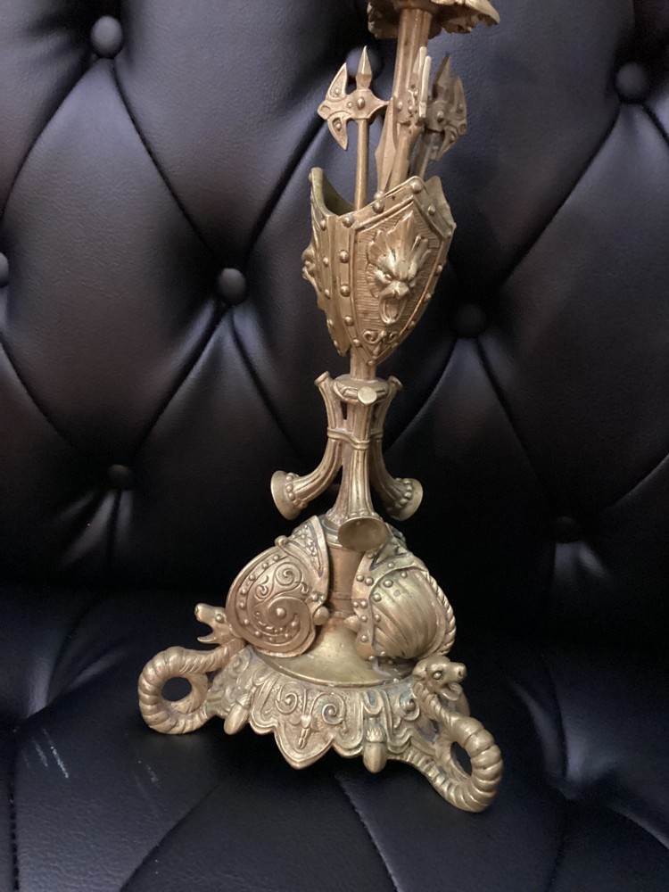 Antique Brass Ornate Candlestick Holder – Gothic Revival Style – Decorative Shield & Weapon Motif Description: This striking antique brass candlestick holder features an elaborate design with shield, armor, and weapon motifs, reflecting a Gothic Revival or Medieval-inspired style. It sits on a sturdy ornate base with intricate scrollwork and detailing, making it a unique piece for collectors or as a dramatic décor accent. Material: Solid brass (heavyweight) Style: Gothic Revival / Medieval Features: Shield, armor, weapon, and scroll motifs Height: Approx. [measure and insert, likely 12–15" without candle] Condition: Pre-owned, very good antique condition. Patina consistent with age. No major damage. Perfect for antique décor lovers, collectors, or as a centerpiece on a mantle or dining table.