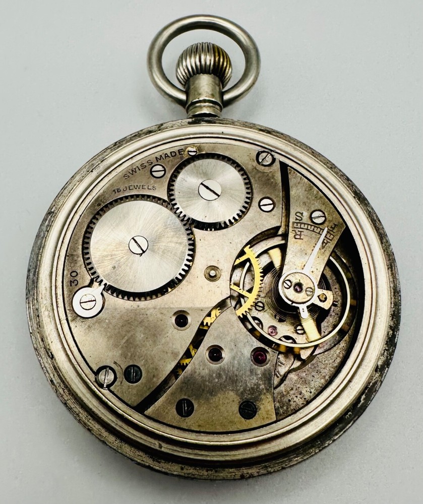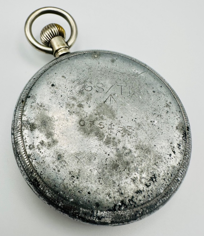 A Piece of History: Authentic British Military General Service (GSTP) Pocket Watch Presenting a genuine antique Swiss-made pocket watch, rich with military history. This timepiece is explicitly marked on its rear case with the distinctive "GS/TP" designation and the Broad Arrow (pheon) mark , identifying it as an official British General Service Time Piece . These watches were widely issued to military personnel across various branches, including the Army and Royal Air Force, for essential timekeeping during the mid-20th century, particularly throughout World War II. The watch is powered by a 15-jewel, stem-wound Swiss-made mechanical movement and is currently in working condition . It features a classic white/cream dial with bold Arabic numerals and a sub-seconds dial at 6 o'clock. The case is a robust base metal, consistent with military-issued timepieces of the era. This is an exceptional opportunity for collectors of military memorabilia or antique watches to acquire a piece with tangible historical provenance. Key Features: Authentic British Military Issue: Clearly marked "GS/TP" with the Broad Arrow, confirming its status as a British General Service Time Piece, issued to military personnel. Swiss Made Movement: Features a reliable 15-jewel, stem-wound mechanical movement. Working Condition: The watch is fully functional. Classic Military Design: A clean, legible dial with Arabic numerals and a sub-seconds indication. Historical Significance: A tangible connection to British military history from the mid-20th century. Condition: This antique military pocket watch is in good working order . Cosmetically, the case, particularly the rear, shows noticeable wear, tarnishing, and some pitting/surface corrosion , which is common and expected for a military-issued item of its age and use. The dial exhibits some natural patina and discoloration consistent with age. Please refer to the detailed photographs carefully, as they form an integral part of the description and best illustrate the watch's exact condition and character gained through decades of service. Markings: Rear Case: "GS/TP" with Broad Arrow, and "075183" (serial/issue number). Inner Case: "3330280" (case number). Movement: "SWISS MADE", "15 JEWELS". Dimensions: Case Diameter: 51.8mm (approximately 2.04 inches). Don't miss this chance to own a piece of military horological history! As usual, this item will be packaged carefully and dispatched with tracking. International shipping is available upon request.