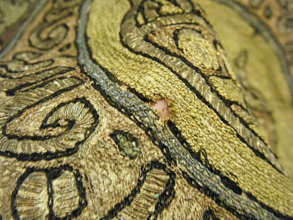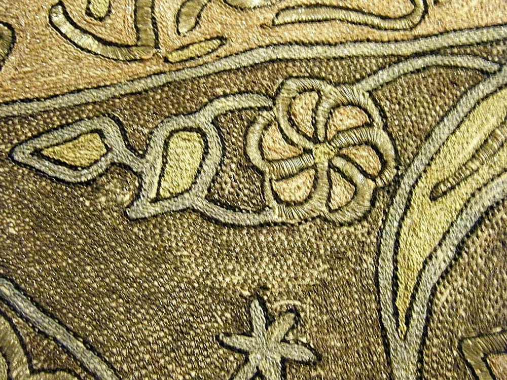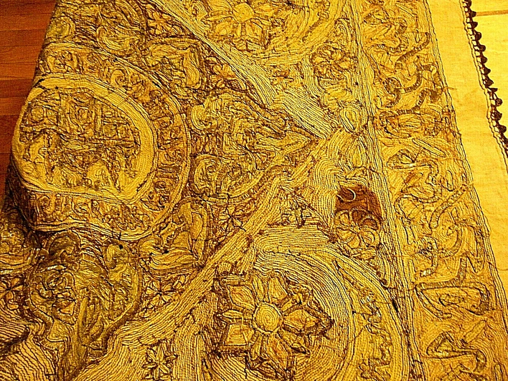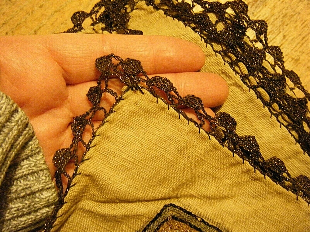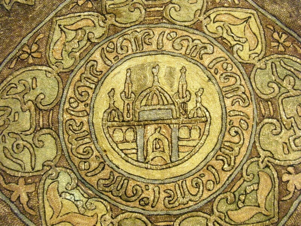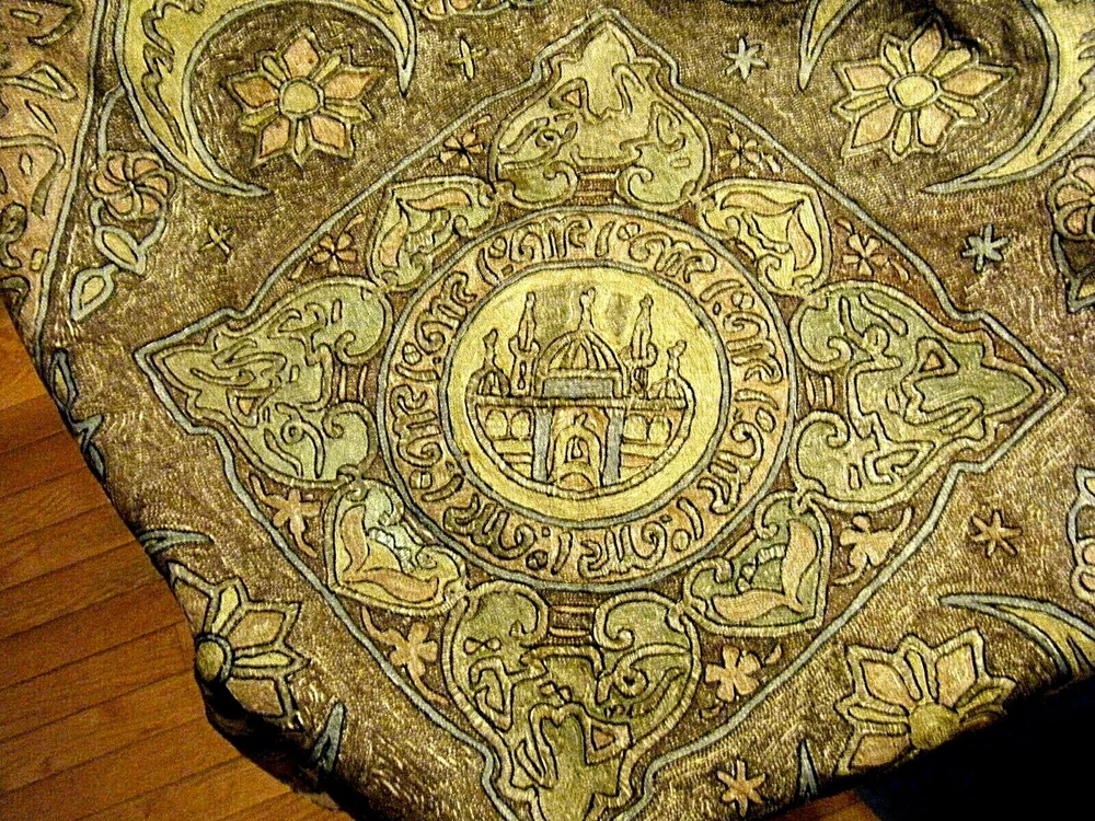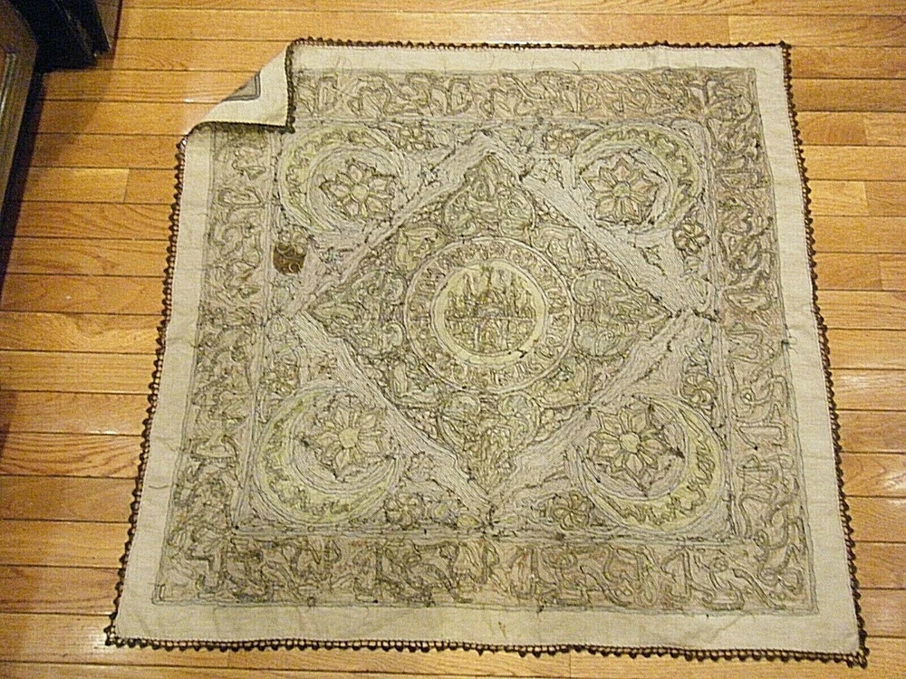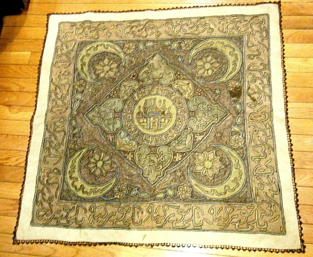 Turkish / middle eastern / Persian origin. Beautiful 36" x 36" large antique elaborate embroidered wall tapestry. Gold and silver bullion threads, mosque center, moon and star elements. One stain and one small hole as shown on the last two photos. SHIPPING IN THE USA $11.50 THANKS