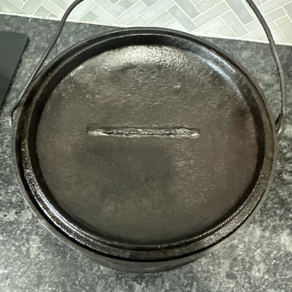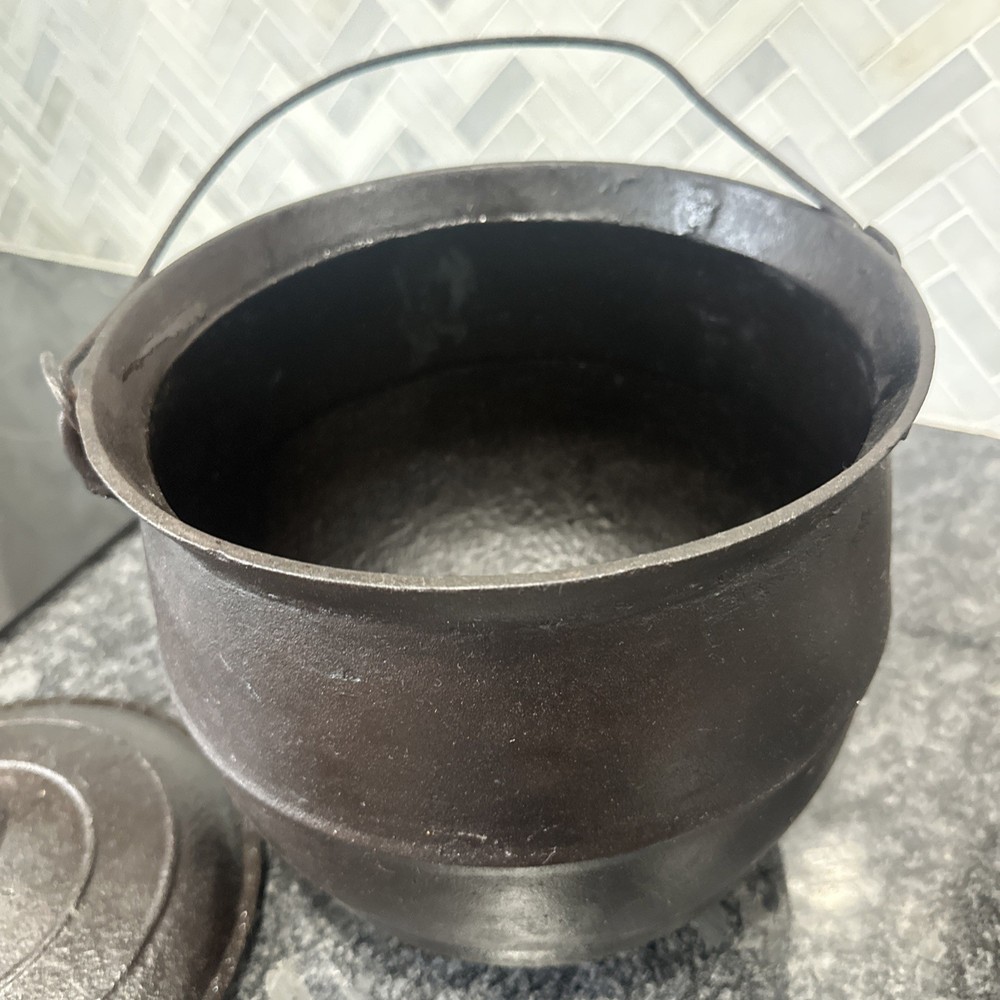 This antique cast iron bean pot is a vintage collectible piece that is perfect for any kitchen or home decor. This round cauldron pot features a classic design with a sturdy handle and a matching lid, making it a functional and stylish addition to any cooking space. Made of cast iron and with a black color, this original piece is compatible with gas stoves and is sure to add a touch of nostalgia to your cooking routine.