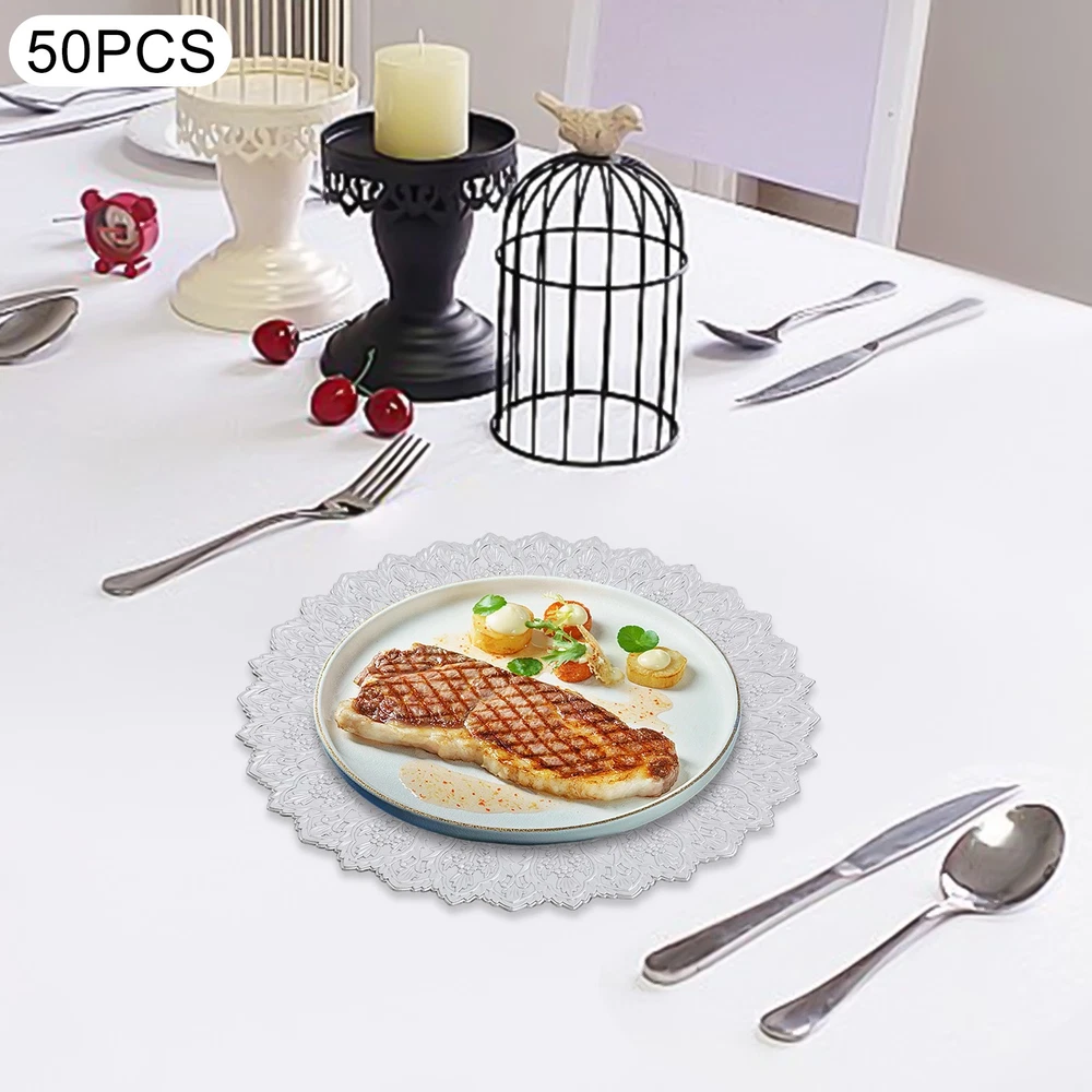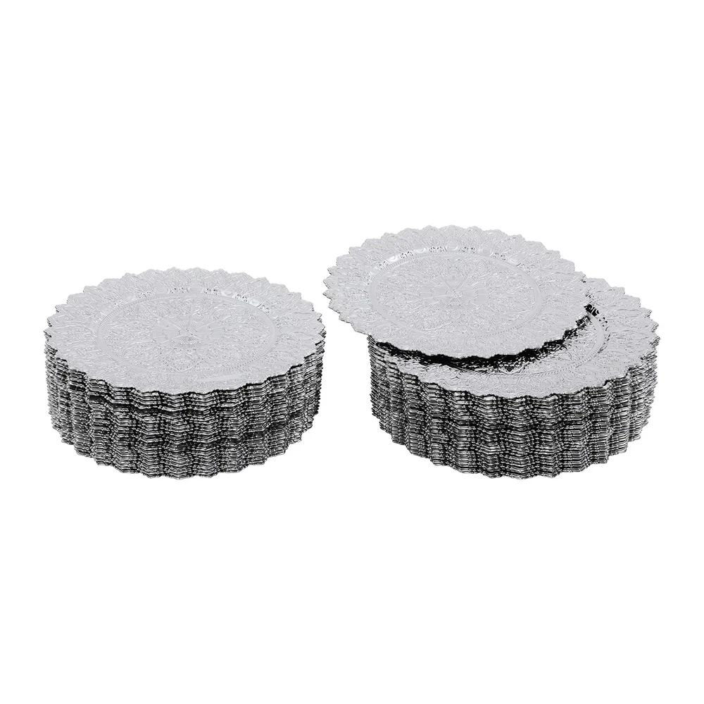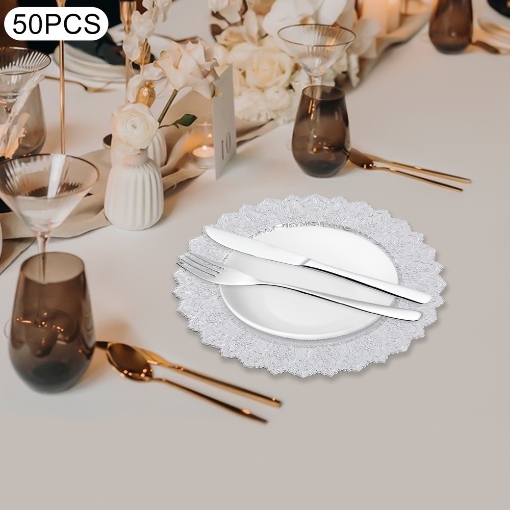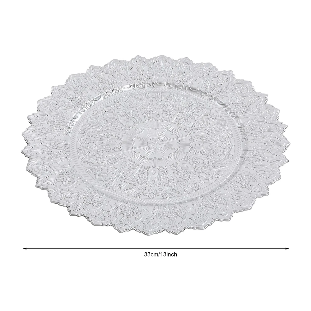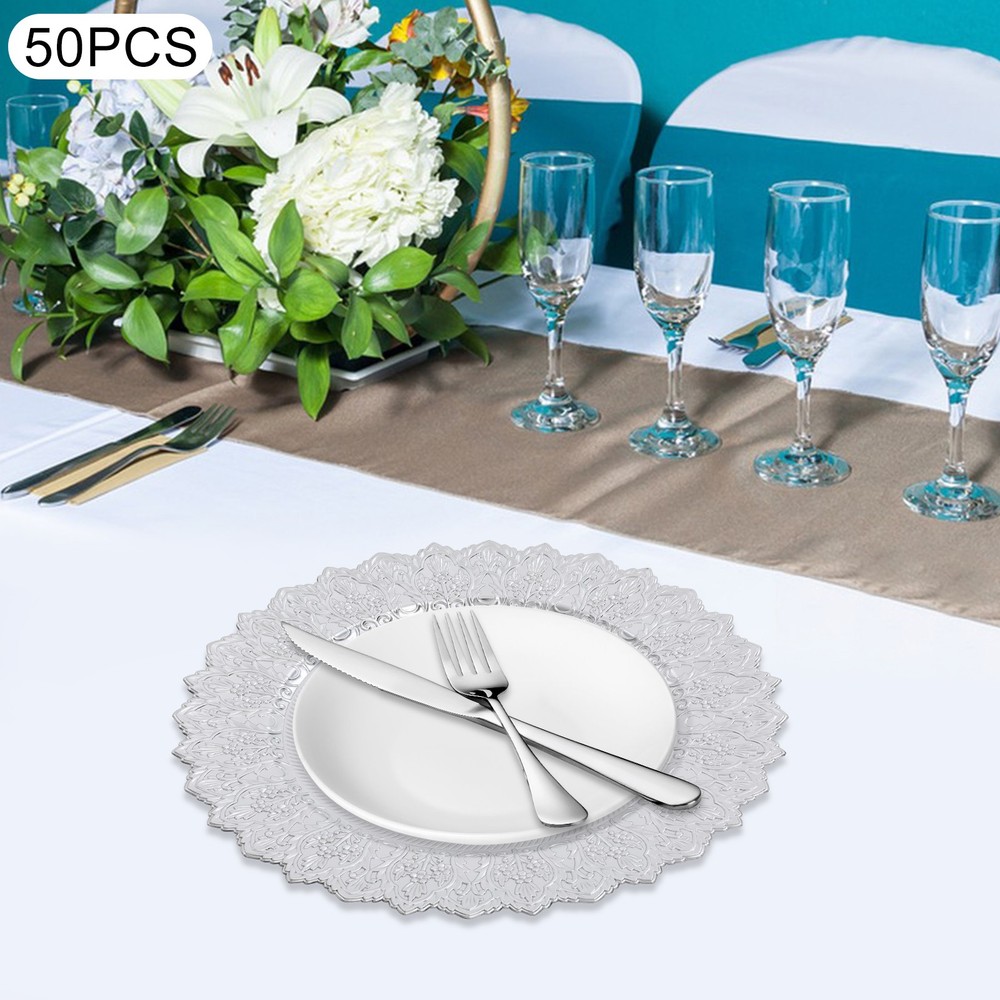 Application This product is suitable for parties, weddings, banquets, restaurants, hotels, camping, picnics, barbecues, or other events. Specification Color: Silver Shape: Round Style: Vintage Material: PP Process: Spray Painting Mounting Type: Tabletop Number of Pieces: 50 Each Product Diameter: 33cm/13in Package Size: 36*36*29cm/14.17*14.17*11.42in Gross Weight: 16kg/35.27lbs Net Weight: 15.2kg/33.51lbs Antique Charger Plates Dinner Charger Plates Charger Plates for Wedding Party Description Description Our charger plates bring a refined touch to most dining occasions while serving as a stunning backdrop for your culinary masterpieces. With their exquisite design and craftsmanship, they elevate table settings, creating a memorable impression for both formal events and intimate family gatherings. Key Features Crafted for Endurance: Crafted from premiu m PP wit h a spray painting process, this product withstands wear, cracks, and fading for long-term use. Elegant & Artistic: The round shape, attractive color, and exquisite texture patterns give this piece a classic, elegant look that enhances your table setting and creates a delightful dining experience. Reasonable Size: With a diameter of 13 inches, each piece ideally accommodates salad bowls and soup bowls (not included) while adding a stylish, functional touch to your table setting. 50 Pieces a Set: Our package includes 50 plates, which are not only suitable for home use but also for parties, hotels, restaurants, and other commercial venues. Easy Storage: These plates can be stacked when not in use for convenient storage in your cabinet with less space occupation. Details Sunken Bottom: It provides a proper place for placing salad bowls, soup bowls, and main dish plates(not included), to prevent accidental spills and keep the table clean. Smooth Edges: The smooth edges enhance the beauty of the product and better care for your skin when using and cleaning it. Application This product is suitable for parties, weddings, banquets, restaurants, hotels, camping, picnics, barbecues, or other events. Specification Color: Silver Shape: Round Style: Vintage Material: PP Process: Spray Painting Mounting Type: Tabletop Number of Pieces: 50 Each Product Diameter: 33cm/13in Package Size: 36*36*29cm/14.17*14.17*11.42in Gross Weight: 16kg/35.27lbs Net Weight: 15.2kg/33.51lbs Package Included 50* Charger Plates Notes Please ensure that the size of this product is suitable for your needs before purchasing. Please note that this product cannot be directly used to hold food. Please note that this product has only undergone a spray painting treatment process on a single surface. Please ensure that you do not mind this before purchasing. Please allow the slight color difference caused by the shooting light and the 1-3 cm error due to manual measurement, and make sure you do not mind before ordering. Payment Delivery details Terms of sales About us Contact us Payment We accept ebay payment 。 Fees such as import duties, taxes are not included in the item price or shipping costs. These charges are the buyer's responsibility. Delivery details Shipping: 2-9 working days to: USA Terms of sales We maintain high standards of excellence and strive for hundred percent customer satisfaction. Feedback is very important to us. We hope that you contact us immediately before you give neutral or negative feedback, so that we can address your concerns. It is impossible to address issues if we do not know about them! About us Your satis faction is our ultimate goal. We work hard to earn your trust and future business. Our certified technicians have tested each item before shipping. The unit comes with 1 year limited warranty on all manufacturing defects. a) If you receive a defective item, you may return it or ask for a discount. Please contact us within 14 days after you receive the package. b) What you returned must be intact and in its original packaging as re? u. Customer is responsible for shipping costs of the returned item. c) We will cover the cost of shipping back t with the shipping rate indicated in the registration page. We will send you a new unit or refund the full payment you paid. Thank you. Contact us Business Hour Business Hour: Monday To Friday: 8:30 AM to 5:00 PM (Beijing China time) Due to time zones, our reply to your questions may not be immediately. But within above working time, we will reply your email within 24 hours. If it's non-workdays, please kindly be patient and wait till Monday. Please contact us with ebay message. Please feel free to contact us if you have any questions. Monday To Friday: 8:30 AM to 5:00 PM (Beijing China time) Due to time zones, our reply to your questions may not be immediately. But within above working time, we will reply your email within 24 hours. If it's non-workdays, please kindly be patient and wait till Monday. Please contact us with ebay message. Please feel free to contact us if you have any questions.