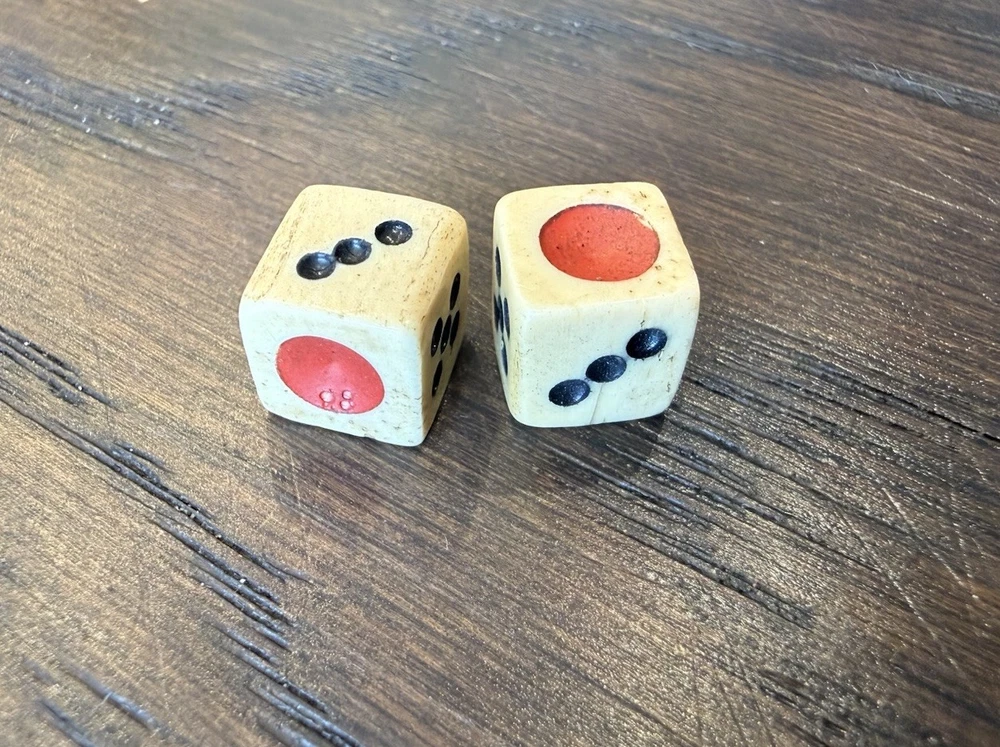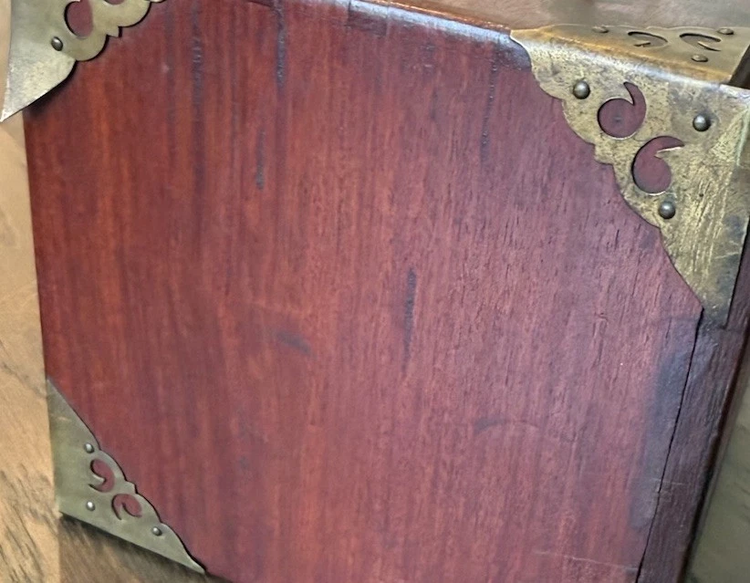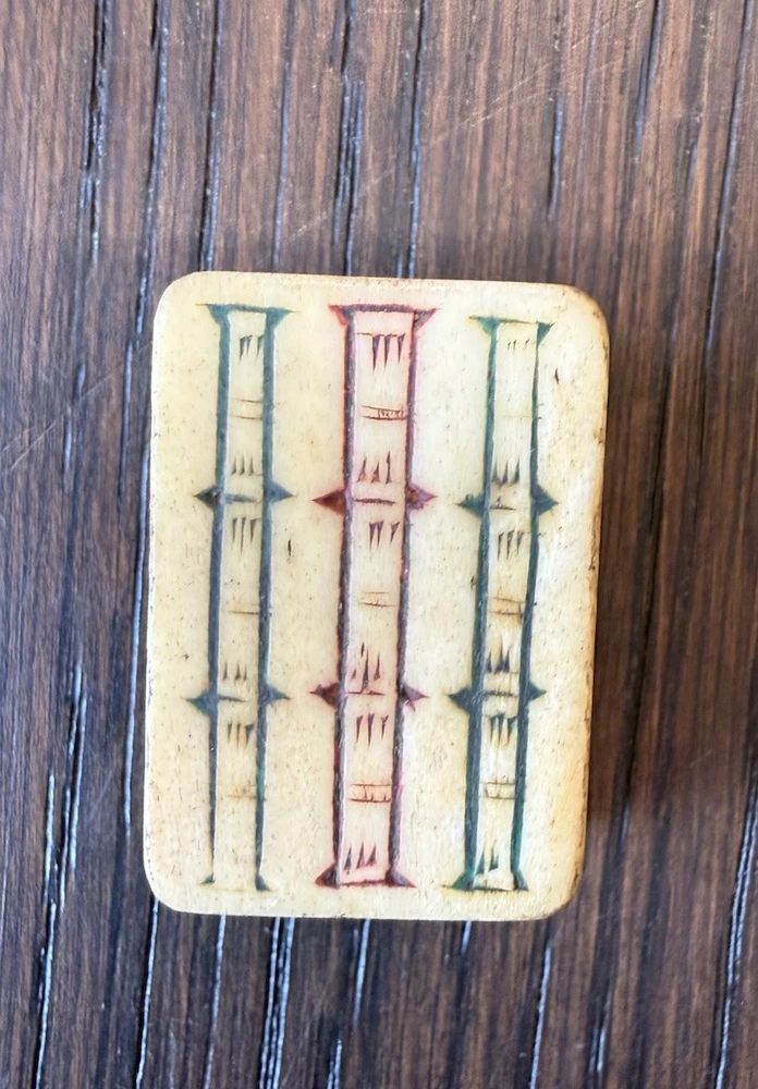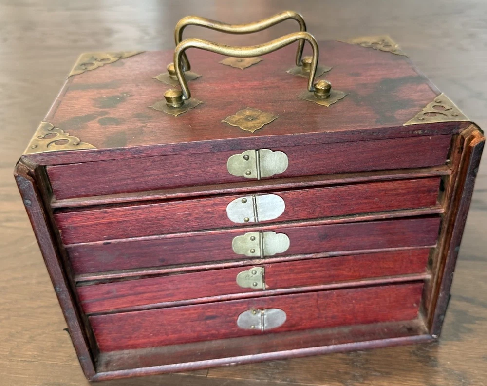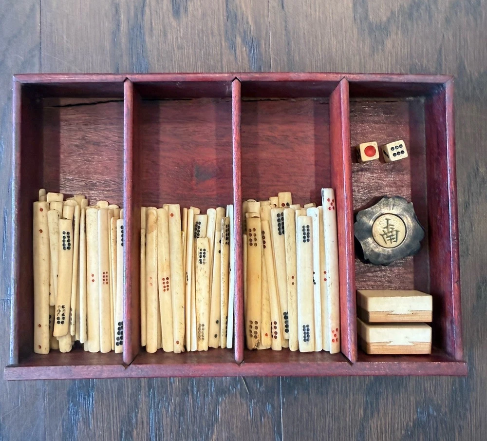 Complete antique Chinese mahjong set in original 5-drawer hardwood carrying case. Tiles are hand-carved and hand-painted, believed to be bone over bamboo — traditional construction. All 144 tiles present, drawers full. Includes bone scoring/betting sticks, 2 bone dice with red pip accents, brass wind indicator, and wooden tile racks. Case measures 9.25”W x 6.5”D x 6.25”H. Features brass corner mounts, cloud-form brass carrying handle, and individual brass drawer pulls. Rich red lacquer finish with beautiful natural patina. One drawer pull has a piece broken off due to natural age and use — drawer still functions fully. Sold as-is. Buyer to verify materials. Minor cosmetic wear consistent with age — tiles intact, no cracks, no missing hardware. A genuinely complete set; these are increasingly hard to find this way. Ships fully insured and carefully packed. Additional photos available on request. Measurements: 9.25”W x 6.5”D x 6.25”H