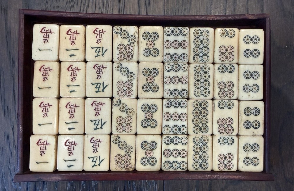 Antique Chinese Bone & Bamboo Mahjong Set Complete Brass Fitted Hardwood Case