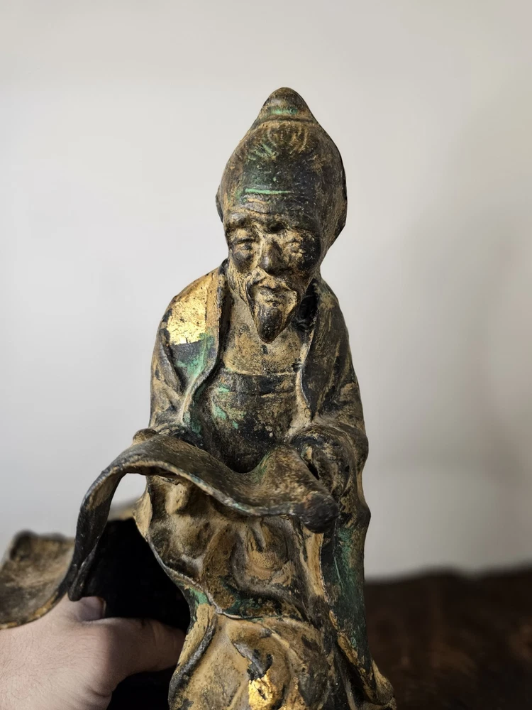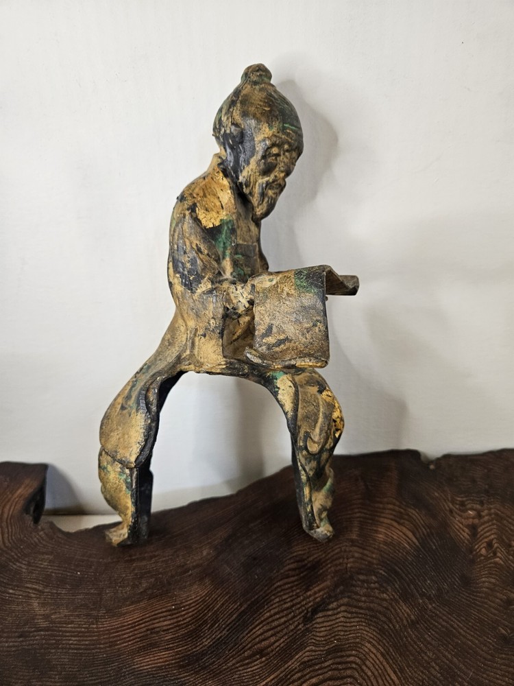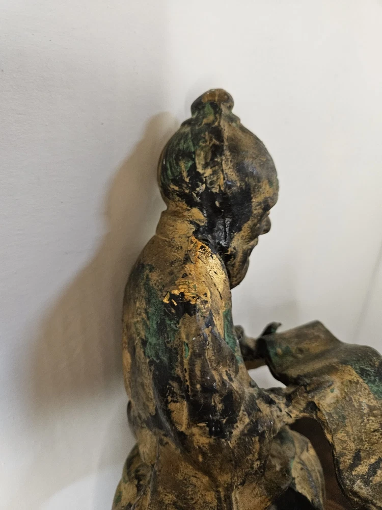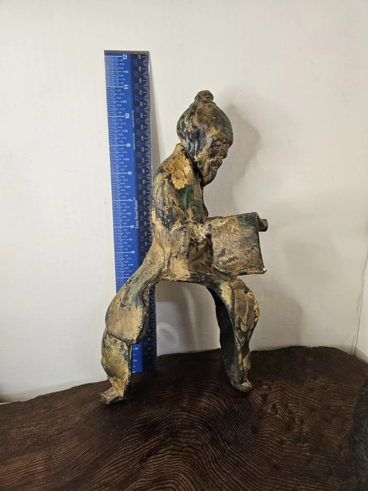 This antique cast iron Chinese roof tile features an old man reading a scroll, making it a rare and unique addition to any collection. The scroll pattern and Chinese style add to its decorative appeal. The material is cast iron, and the finish is antique. In addition to being a collectible, this piece can also be used as a decorative sculpture or figurine. The details on the old man's face and clothing, as well as the design, are sure to impress. Overall, this item is a great find for those interested in Chinese art and culture, and will make a wonderful addition to any home or collection.