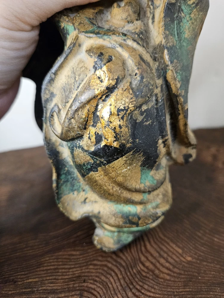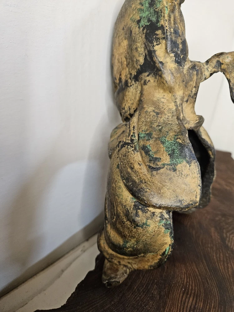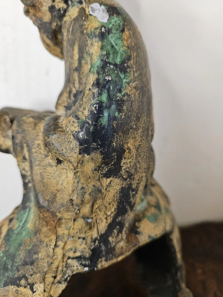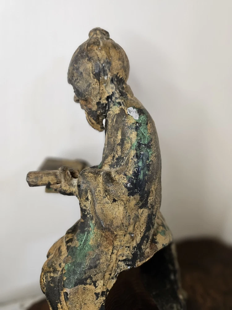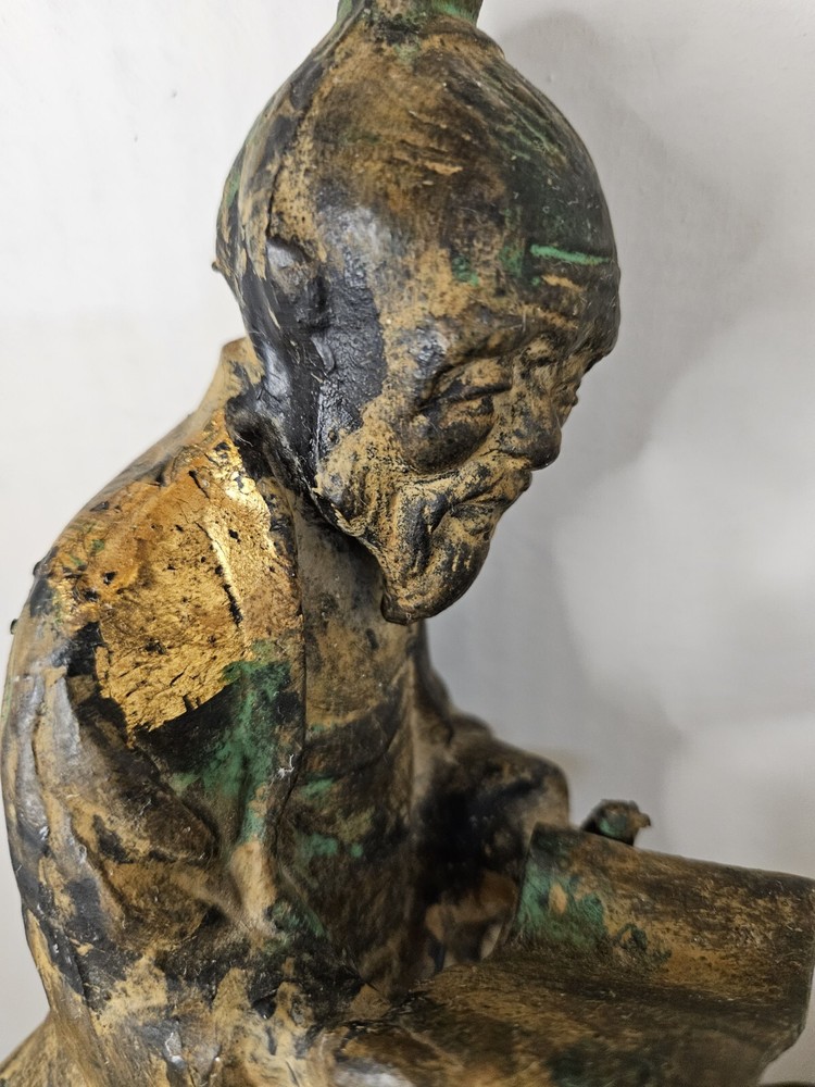 This antique cast iron Chinese roof tile features an old man reading a scroll, making it a rare and unique addition to any collection. The scroll pattern and Chinese style add to its decorative appeal. The material is cast iron, and the finish is antique. In addition to being a collectible, this piece can also be used as a decorative sculpture or figurine. The details on the old man's face and clothing, as well as the design, are sure to impress. Overall, this item is a great find for those interested in Chinese art and culture, and will make a wonderful addition to any home or collection.