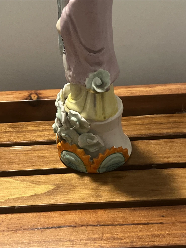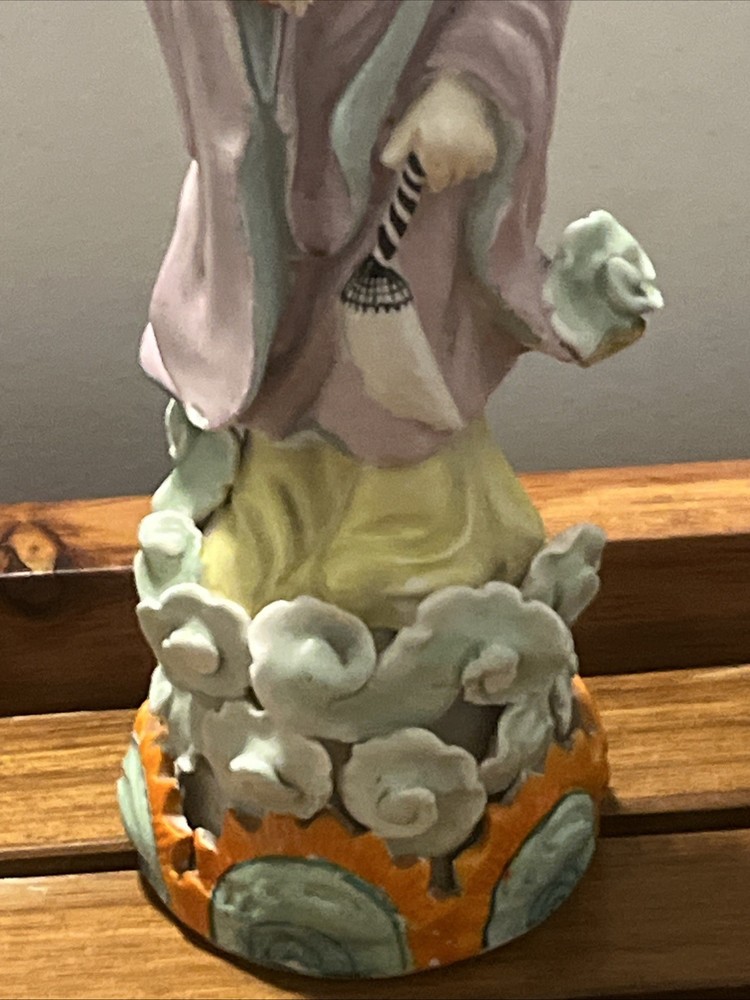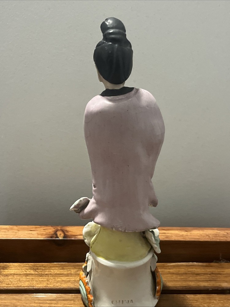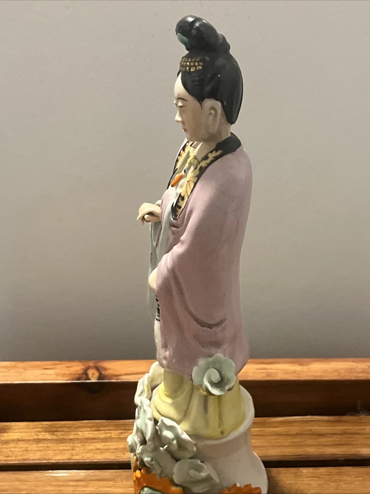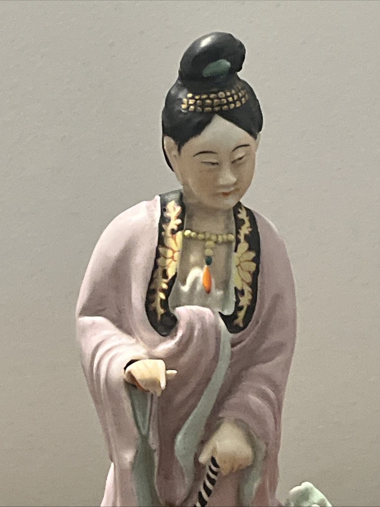 This Antique Chinese Gilt with Famille Rose Porcelain Guanyin Statue stands at 12 inches tall, showcasing intricate handpainted details and being signed by the Chinese Scholar Artist who created it. The statue depicts the theme of Kwan-yin, originating from China during the Republic / PRoC period. With a rich multi-color palette and being an antique original piece from the early 20th century, this Guanyin statue is a beautiful and culturally significant collectible for those interested in Asian antiques.