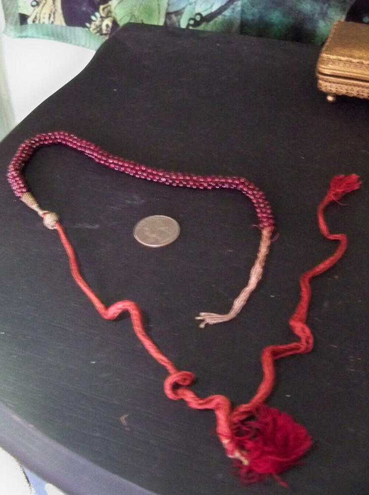This antique garnet prayer bead necklace is a stunning piece with rich character—perfect for collectors or creative upcycling. The aged silk cord and intricate beads give it a beautiful boho charm. Though sold as-is, its unique Eastern design makes it a treasure for DIY projects, doll adornment, or jewelry restoration. The deep red garnets and vintage vibe add an exotic touch. A true find for lovers of old-world craftsmanship!