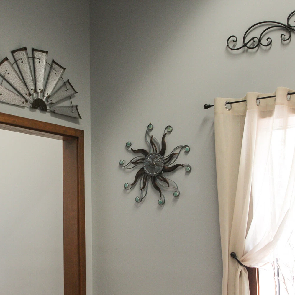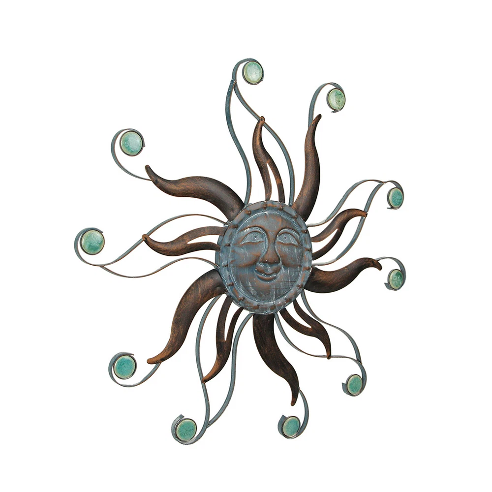 Generous Dimensions - This sun face wall decor boasts a substantial 22-inch diameter and 0.5-inch depth, making it a captivating centerpiece for any wall in your home. Robust Craftsmanship - Crafted from sturdy metal, this piece ensures years of indoor or outdoor display, embodying both durability and style for your living spaces. Artistic Finish - Its antiqued copper finish, combined with intricate ceramic bead accents, infuses vibrant colors, adding a touch of elegance to any wall it graces. Our eBay Store About Us Add to Favorite Sellers Antique Copper Finish Metal Sun Face Wall Decor Hanging: A Stunning 22-Inch Diameter Indoor/Outdoor Artwork Adorned with Intricate Ceramic Bead Accents Generous Dimensions - This sun face wall decor boasts a substantial 22-inch diameter and 0.5-inch depth, making it a captivating centerpiece for any wall in your home. Robust Craftsmanship - Crafted from sturdy metal, this piece ensures years of indoor or outdoor display, embodying both durability and style for your living spaces. Artistic Finish - Its antiqued copper finish, combined with intricate ceramic bead accents, infuses vibrant colors, adding a touch of elegance to any wall it graces. Effortless Installation - Designed for convenience, a built-in keyhole hanger on the back allows for quick and easy hanging, transforming your space with minimal effort. Perfect Gift - Whether for yourself or your loved ones, this sun face wall decor serves as an ideal gift idea. Its artistic allure and enduring quality make it a thoughtful and captivating present, elevating any space it adorns. Embrace the warmth of the sun with our exquisite aged copper finish metal smiling sun face wall hanging, a charming addition to your indoor or outdoor decor. Measuring 22 inches in diameter and 0.5 inches deep, this artwork exudes personality, showcasing intricate open and closed work metal rays, along with oxidized verdigris blue-gray embellishments and mottled blue-green ceramic bead accents. This delightful sun face wall hanging becomes an instant focal point, radiating charm on any wall it graces, whether in your home, kitchen, patio, or garden. Its versatile design effortlessly blends with various decor styles, adding a touch of artistic elegance to your space. Hung indoors, it becomes an accent piece, enhancing the ambiance of your living areas. Outdoors, it elevates your patio or garden, infusing nature's charm into your surroundings. Not just a decoration, it is a statement piece, reflecting the artistry of your home. Its large size and intricate detailing make it an exceptional housewarming gift, sure to bring smiles to the faces of your loved ones. Welcome the sun into your home and gift an exquisite piece of art that brightens every corner it graces. Product Details Color Blue Height 22 Length 20.5 Weight 1.85 LB