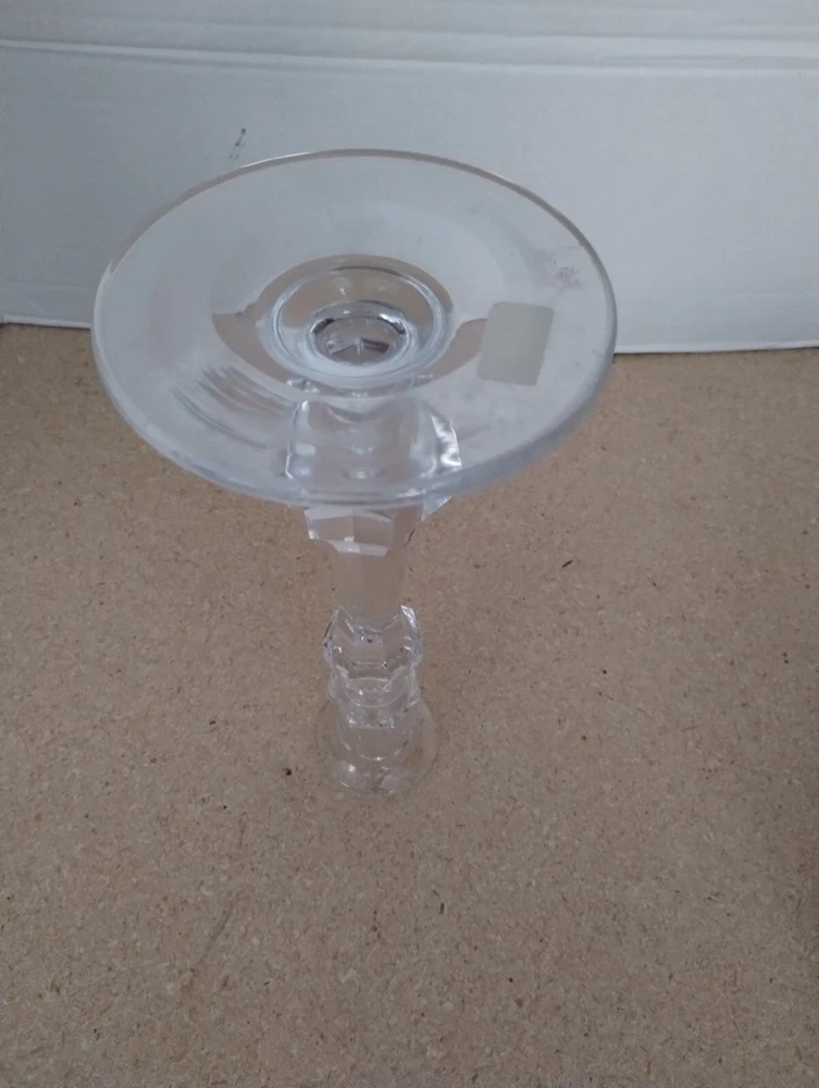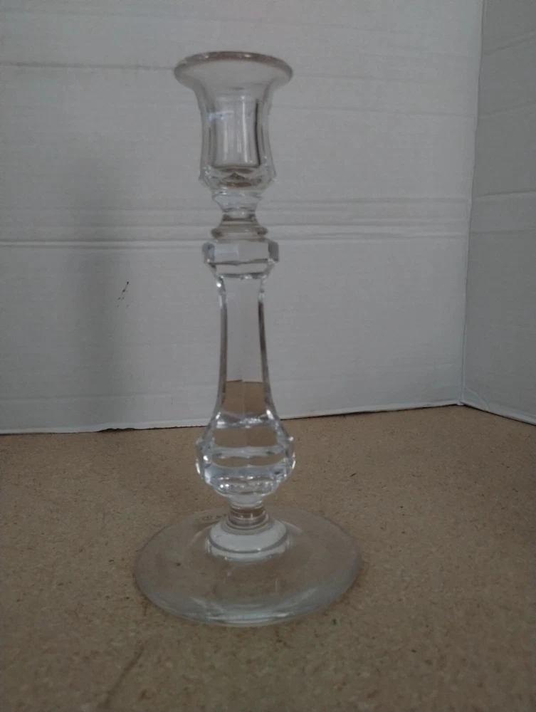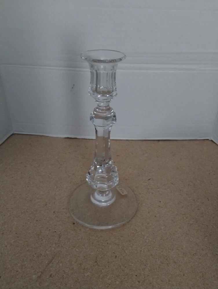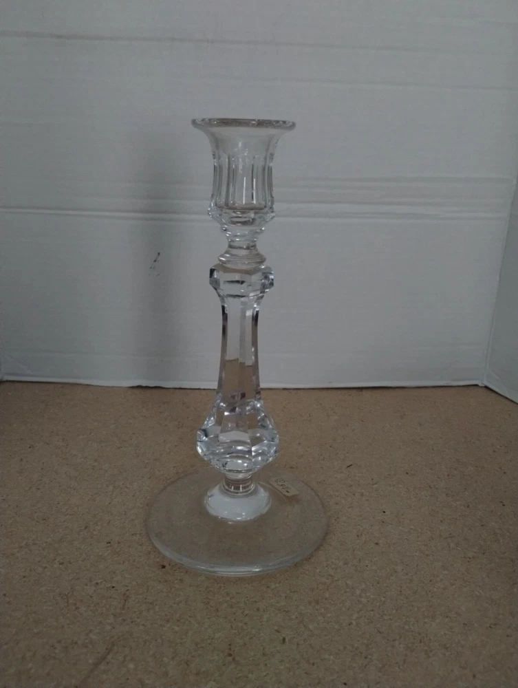 Enhance any living space with this antique crystal glass candlestick holder. Its elegant design adds a touch of sophistication to home decor. Measuring 9 7/8 inches tall, it is crafted from high-quality crystal, offering both beauty and durability. Ideal for adding a classic ambiance to any room. • Elegant crystal design • Sturdy round base • 9 7/8 inches tall • Suitable for taper candles • Classic home decor piece