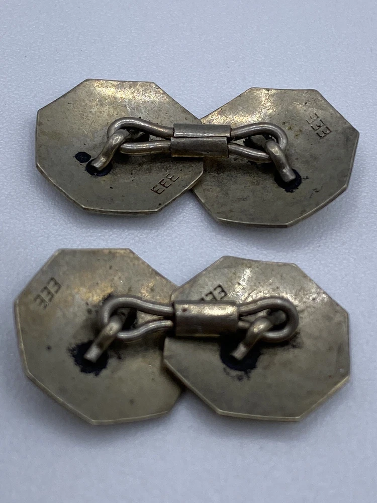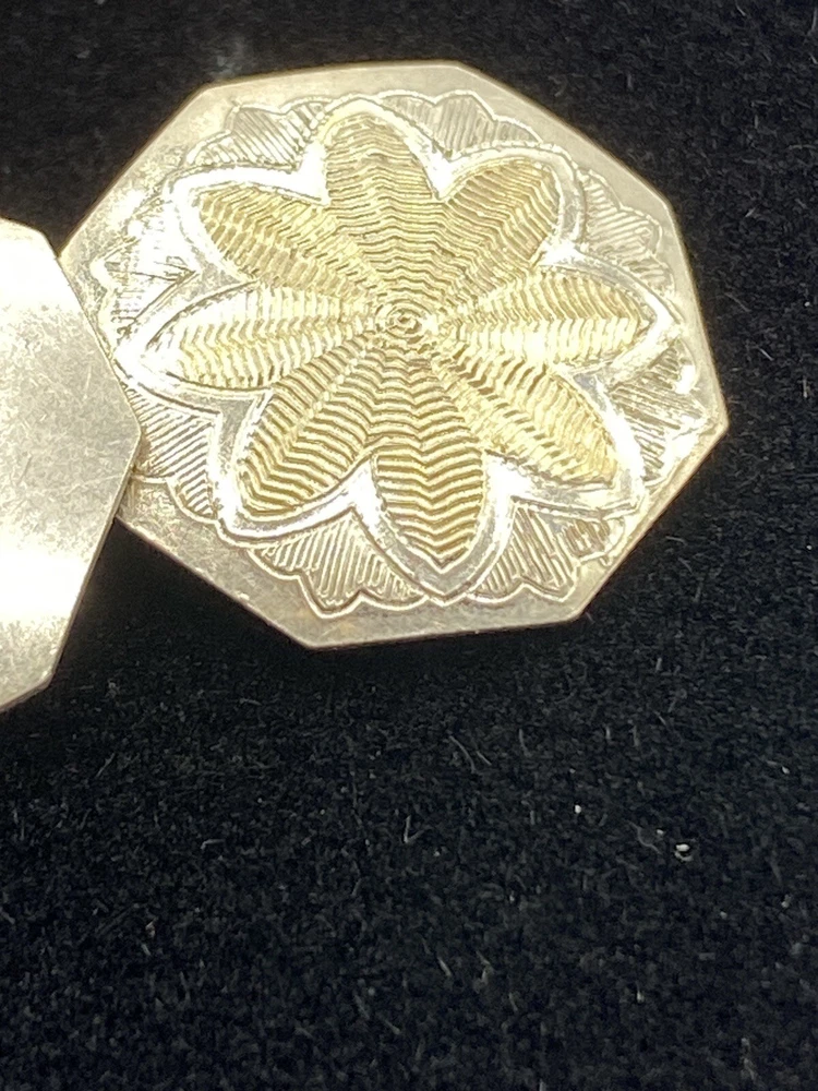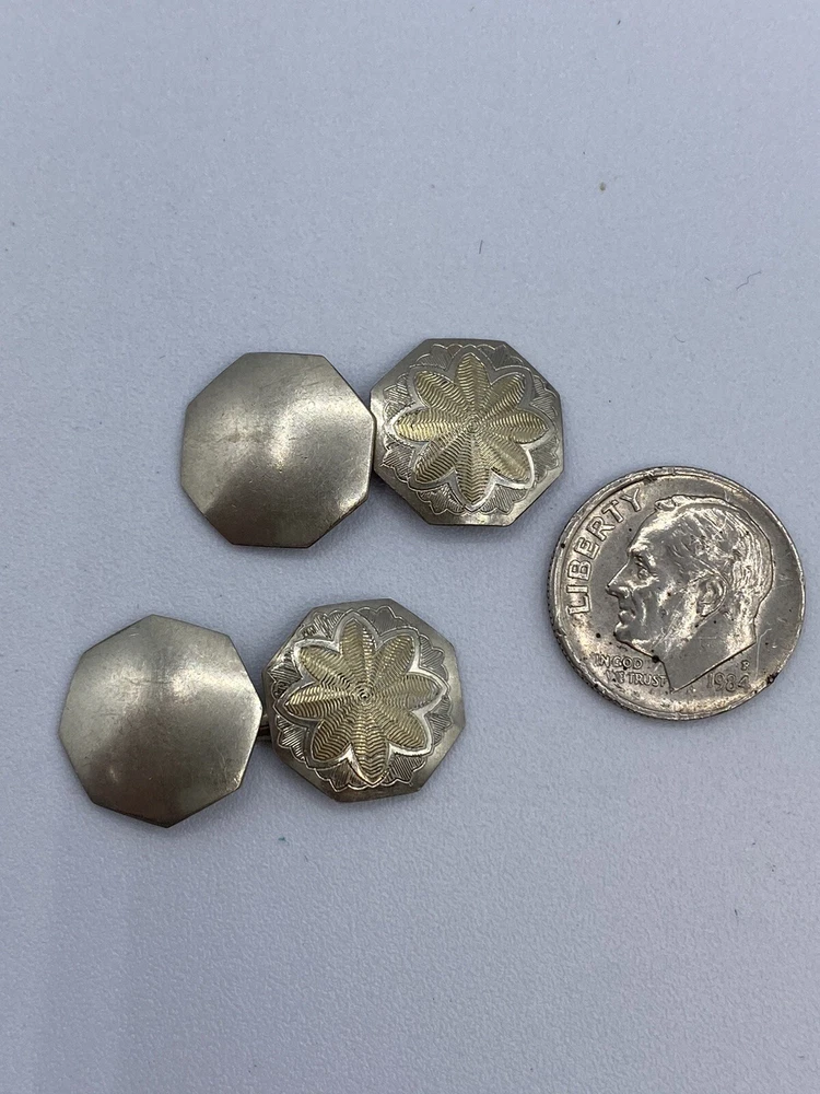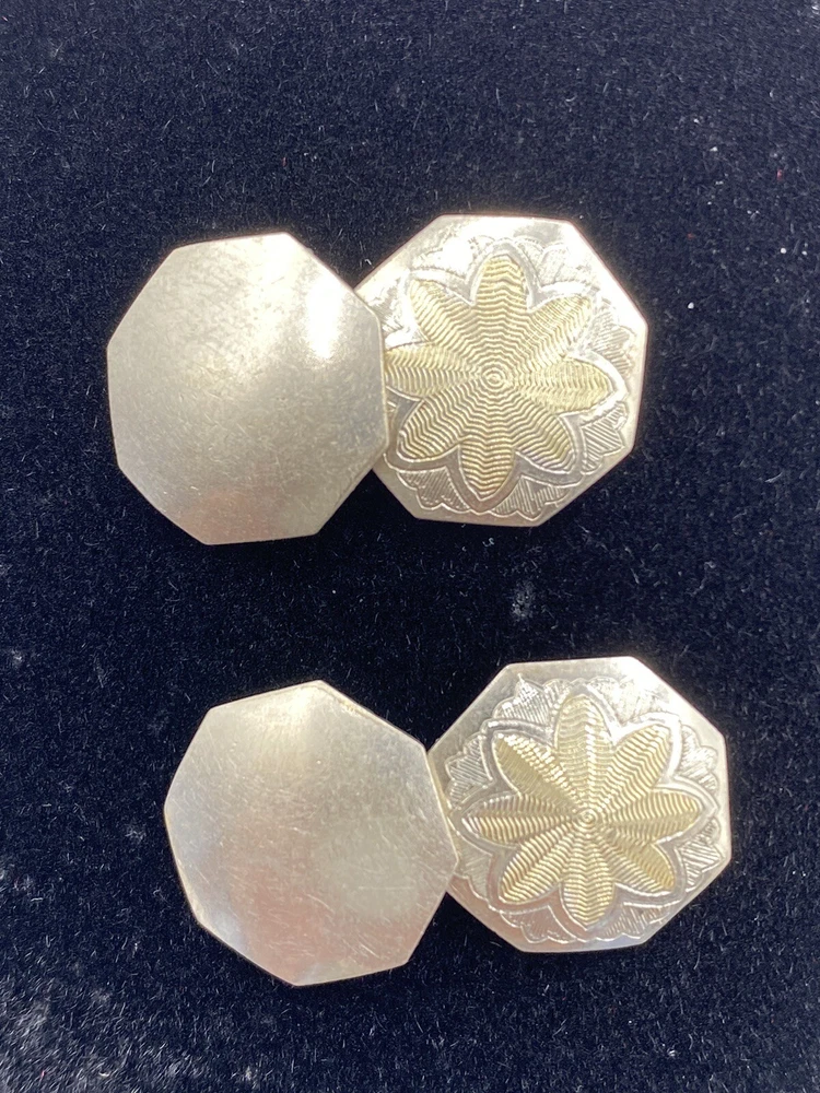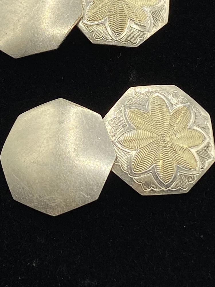 Very beautiful cufflinks. Each stamped on the back with the maker mark EEE. They have a gold starburst type design on one side and are plain silver on the second side. Really pretty. Shipped USPS