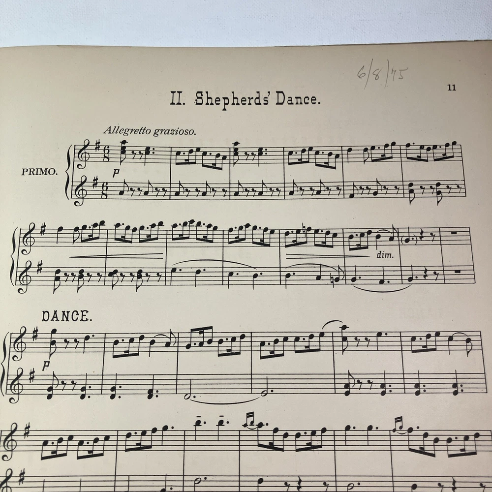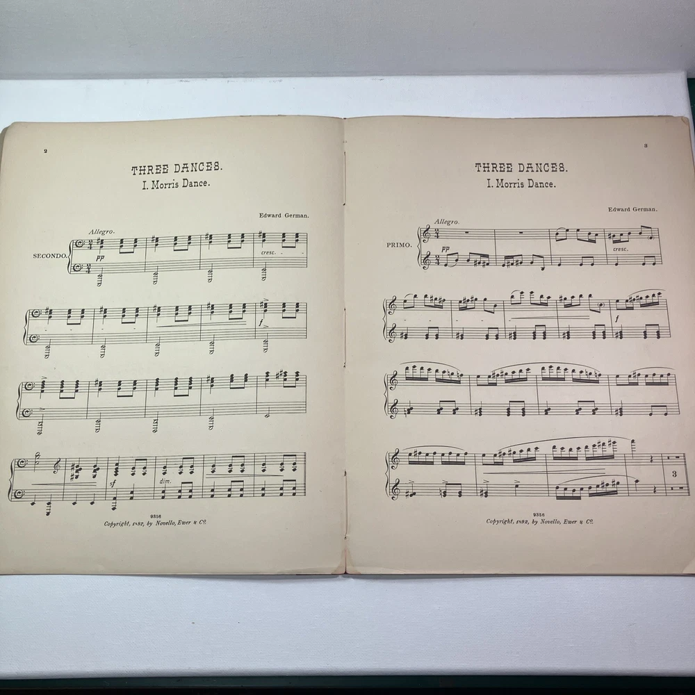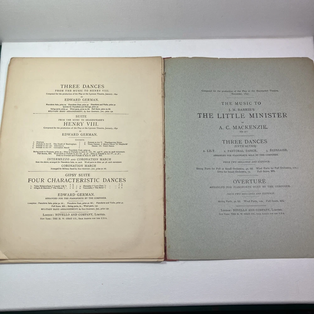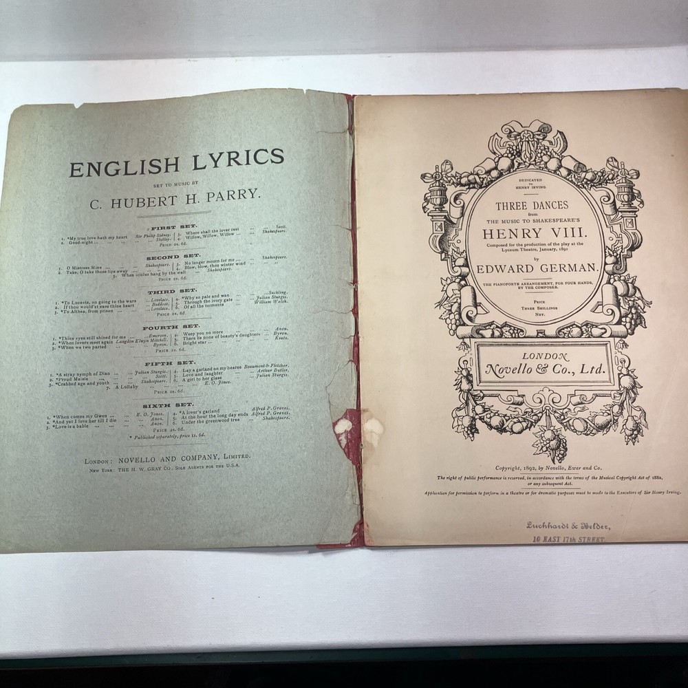 This listing is for Three Dances from The Music of Shakespear’s Henry VIII. This antique is from 1892 published by Novello & Co in London. There is some numerical notes written on several of the pages, as well as someone’s name written on the front cover of the book. Pages 15 & 16 (same sheet of paper) is loose, but in great shape and still within the correct order of the book. We offer free returns on all of our items that we have listed up for sale. We offer combined shipping on multiple orders.