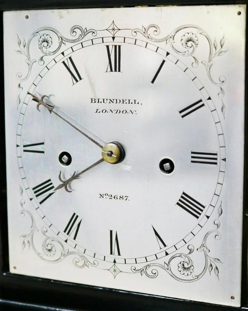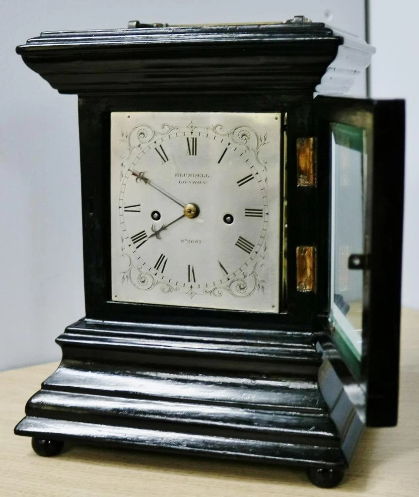 Description Beautiful very rare twin fusee library bracket clock with stunning patina and colour to the wonderful ebonised finish The case is made of solid wood with this stunning patina ebonised finish which gives this absolutely amazing display finish The clock has a classic library clock design with the glass panels on all sides and top with a hinged front and back door, all glass panes are thick bevelled edged panes and all in excellent condition Case is in excellent original condition for age and looks stunning on display with a good age patina Silvered dial with engraved spandrels to the corners, signed by the maker Blundell of London Serial No. 2687 who dates from the early -mid 19th century Engraved Roman numerals and original steel hands Dial is in excellent original condition and looks fantastic Rare English 8 day twin fusee gong striking movement with original platform escapement The movement strikes the bell the amount of hours on each hour Original platform escapement and a new brass winding key Extremely high quality has can be expected and is also signed by the maker Blundell of London Movement is in full working order keeping good time and striking as it should The clock has small proportions and measures 12 inches high x 8 inches wide x 6 inches deep Antique English 8 Day Ebonised Twin Fusee 5 Glass Library Bracket Carriage Clock Antique English 8 Day Ebonised Twin Fusee 5 Glass Library Bracket Carriage Clock Description Main reasons why you should purchase your antique clock from Times & Chimes Ltd !!! We understand buying an antique clock is a big decision and we are very well experienced in current market's as well as fully trained and experienced horologists. We have many years experience in buying and selling original antique clocks which are carefully sourced and many from private collections and we know exactly what buyers expect when purchasing such a prized possession and a future investment. Here are some of the main reasons why you should buy your antique clocks from us for complete piece of mind 1 - We offer the very best customer service before, during and after the sale 2 - Fully trained and hugely experienced horologists 3 - Six month return to base warranty on mechanisms 4 - All our original antique clocks are of high quality and carefully sourced 5 - Every clock we sell are tested for a minimum of 1 week before being offered for sale 6 - We have earned a consistently excellent track record of sales with 100% Feedback 7 - All our items are professionally packed and dispatched promptly 8 - All clocks are sent with world leading couriers on a priority service with full online tracking PLEASE NOTE: I have just received some excellent quality bracket clocks from a private collection all of which have been well looked after all of which will be listed over the next few weeks. Some excellent quality bracket clocks please keep your eyes open over the next few months Description Beautiful very rare twin fusee library bracket clock with stunning patina and colour to the wonderful ebonised finish The case is made of solid wood with this stunning patina ebonised finish which gives this absolutely amazing display finish The clock has a classic library clock design with the glass panels on all sides and top with a hinged front and back door, all glass panes are thick bevelled edged panes and all in excellent condition Case is in excellent original condition for age and looks stunning on display with a good age patina Silvered dial with engraved spandrels to the corners, signed by the maker Blundell of London Serial No. 2687 who dates from the early -mid 19th century Engraved Roman numerals and original steel hands Dial is in excellent original condition and looks fantastic Rare English 8 day twin fusee gong striking movement with original platform escapement The movement strikes the bell the amount of hours on each hour Original platform escapement and a new brass winding key Extremely high quality has can be expected and movement is also signed by the maker Blundell of London Movement is in full working order keeping good time and striking as it should The clock has great proportions and measures 12 inches high x 8 inches wide x 6 inches deep Summary This is a perfect investment clock and a beautiful display piece. Looks absolutely fantastic wherever it is displayed and a true talking point of any room. Exceptional clock which will only grow in value and one of the best ones i have ever had the pleasure to offer for sale and you wont find one quite like this for a while Important Please Read: ALL antique clocks after transport no matter how well they have been looked after or serviced may require setting up, adjustments and setting into beat when you receive them and i always recommend a professional or an experienced clock person to do this correctly for you. Unfortunately with some clocks it is not a matter of unpacking them, putting the pendulum on and away they go, some clocks will need the extra adjustments and setting into beat so please remember you may require a professional for initial setup before bidding. Most clocks will be ok and will not need any additional adjustments but please bear in mind this may not be the case. Any clocks returned because of setting up issues or adjustments needed after transit then a fee will be applicable. For your piece of mind we test all our clocks here before they are sent out and any issues are either sorted or described in the add, the clock will not have any problems unless stated in the add as they are tested vigorously before sending. Please read my full terms and conditions by clicking on the returns tab above. Good luck and happy bidding Click images to enlarge Payment PayPal Cheque Bank Transfer Cash on collection You are more than welcome to personally collect any item free of charge Shipping All my items will be packed professionally Shipping prices include professional packaging materials, boxes, and priority ser