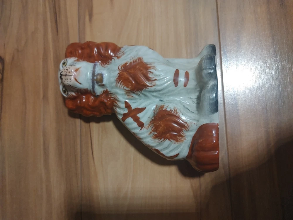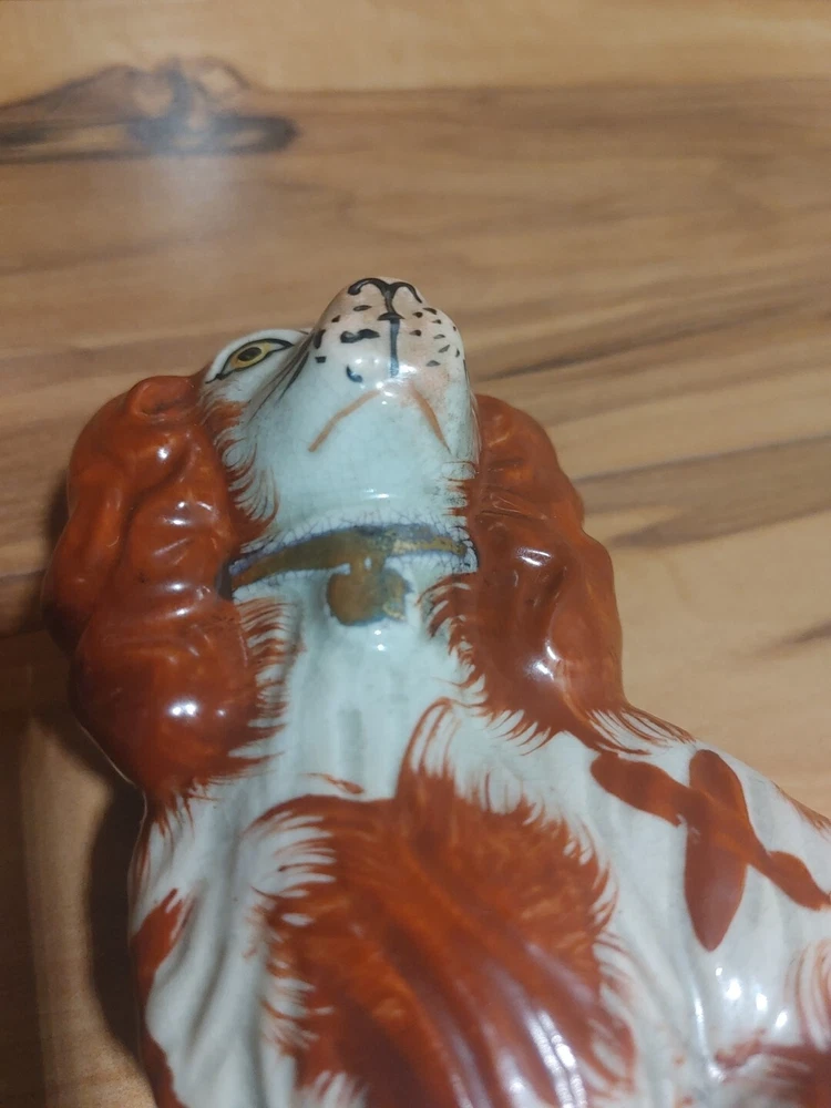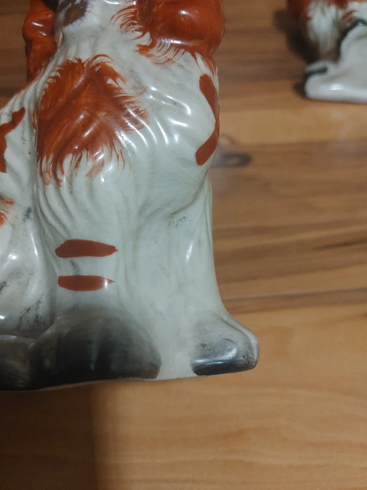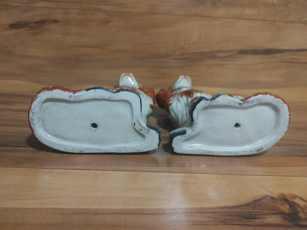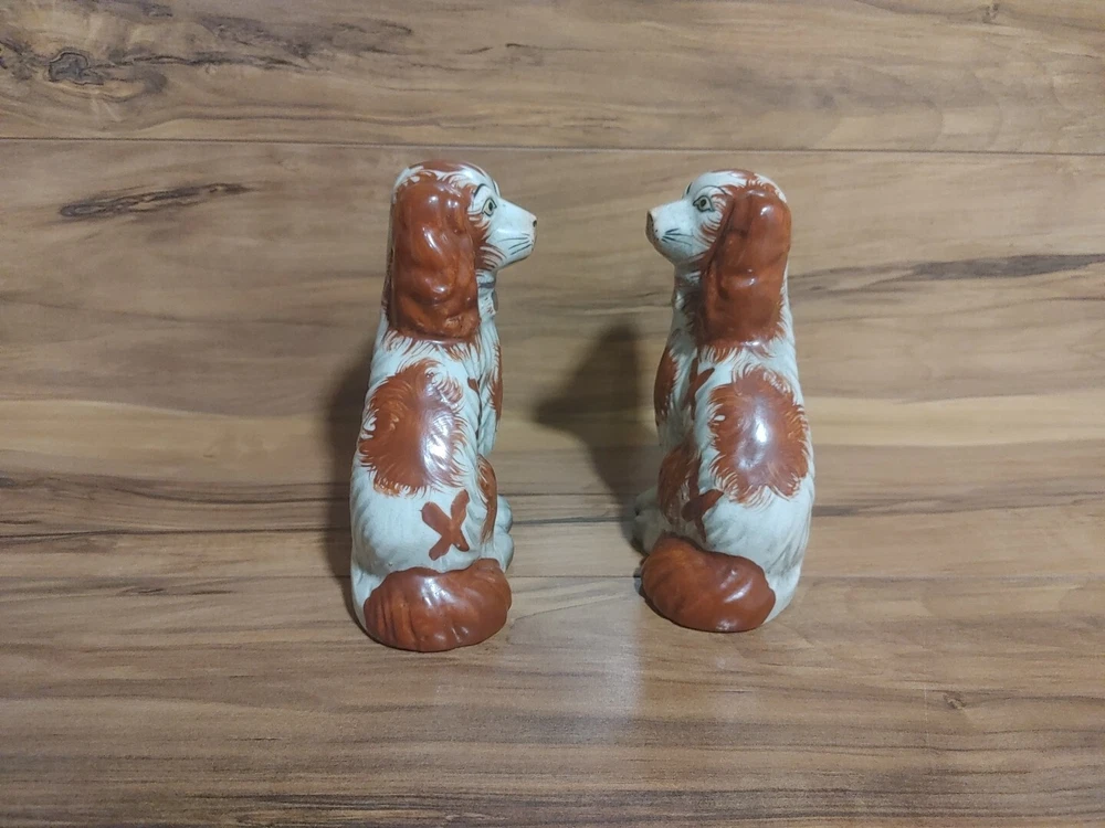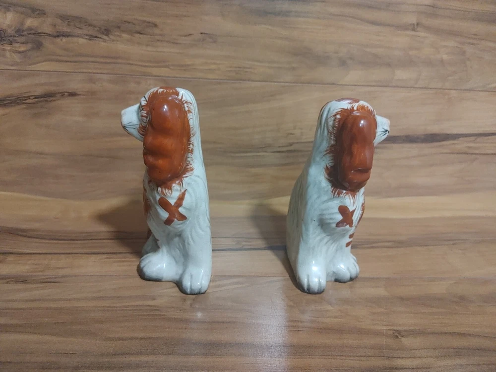 These antique figurines of King Charles Spaniel Dogs are a rare find for collectors of English Staffordshire memorabilia. Standing at 5 inches tall, 4 inches wide and about 2.25 inches deep each these figurines depict two charming dogs that are sure to add character to any collection. They are in great condition. They do not have any damage (chips, cracks, repairs). They do have crazing throughout. There is some minor paint loss. Please inspect photo(s) carefully. Pictures should be considered part of the description. Please ask any questions BEFORE purchasing.