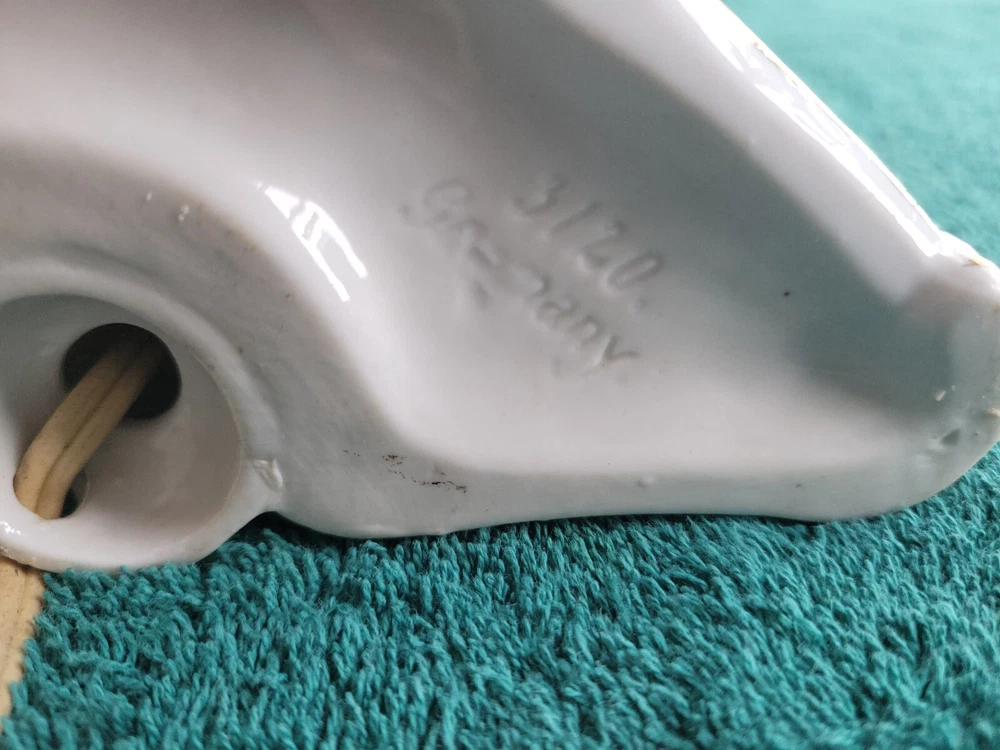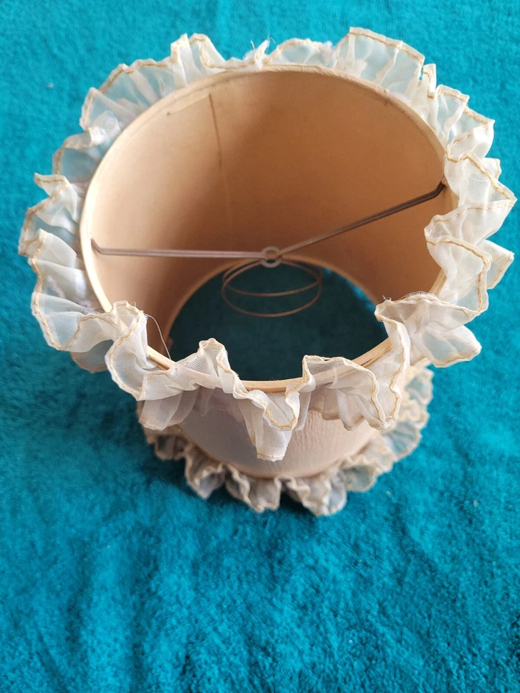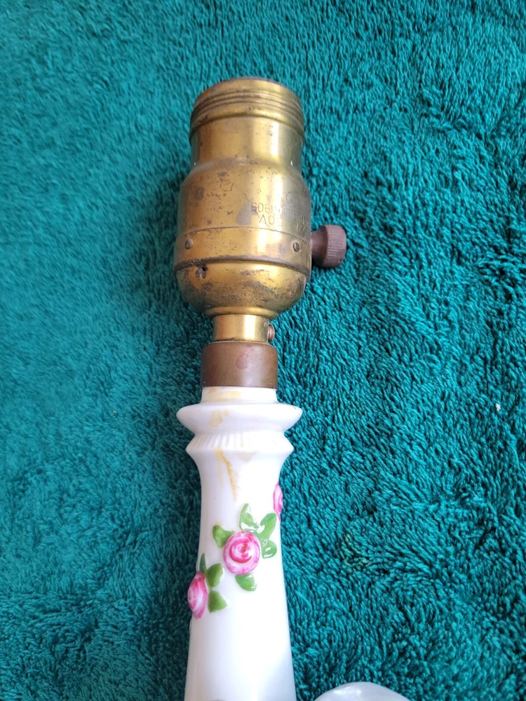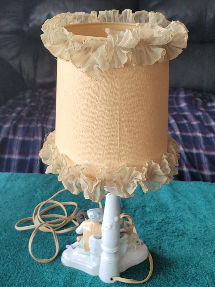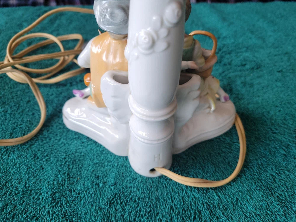 Antique/vintage victorian porcelain boudoir lamp with shade. In original condition, featuring a young couple with a lamb. The lamp is handpainted with a Germany 3120 backstamp. There is also an H at the rear of the lamp. The light has been tested and works. Does not include the light bulb. The lamp without the shade measures 11"H. The lamp base is 6" x 3.5". There is yellowing on the porcelain at the top and where the socket meets the lamp and a small crack. The end of the young girl's foot is missin. See photos. The clamp-on shade is drum style with frills. Measures 7.75"H x 5.75 across. Both the lamp and shade could use cleaning. This is an antique/vintage item and sold as is. Refer to the photos and enlarge for condition. Requests for additional information or photos may be emailed.