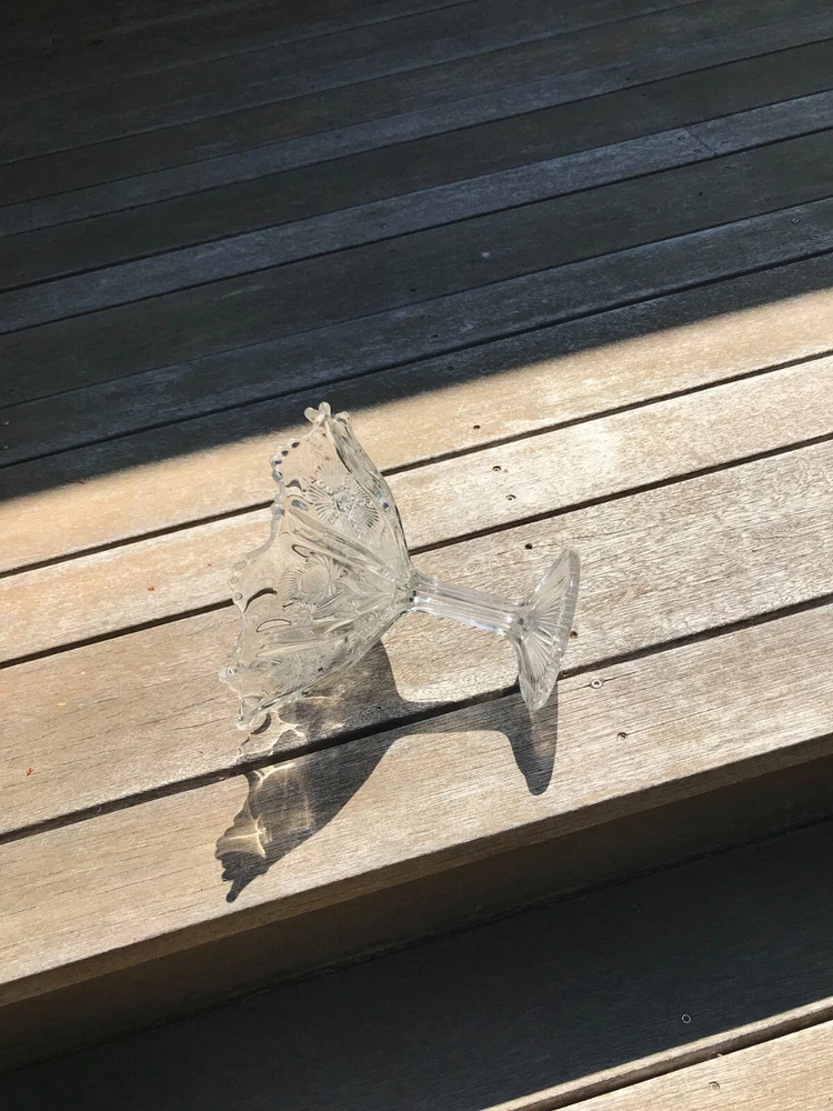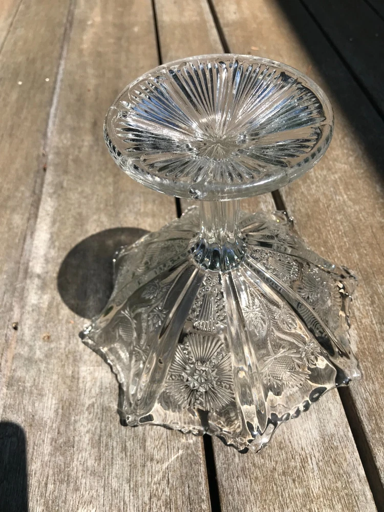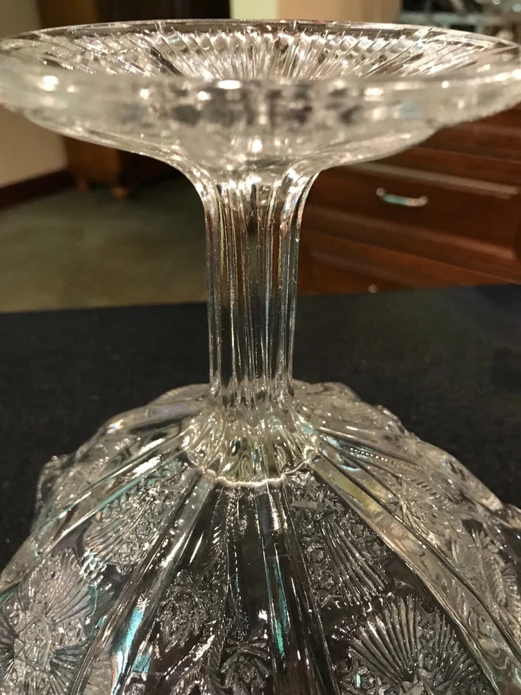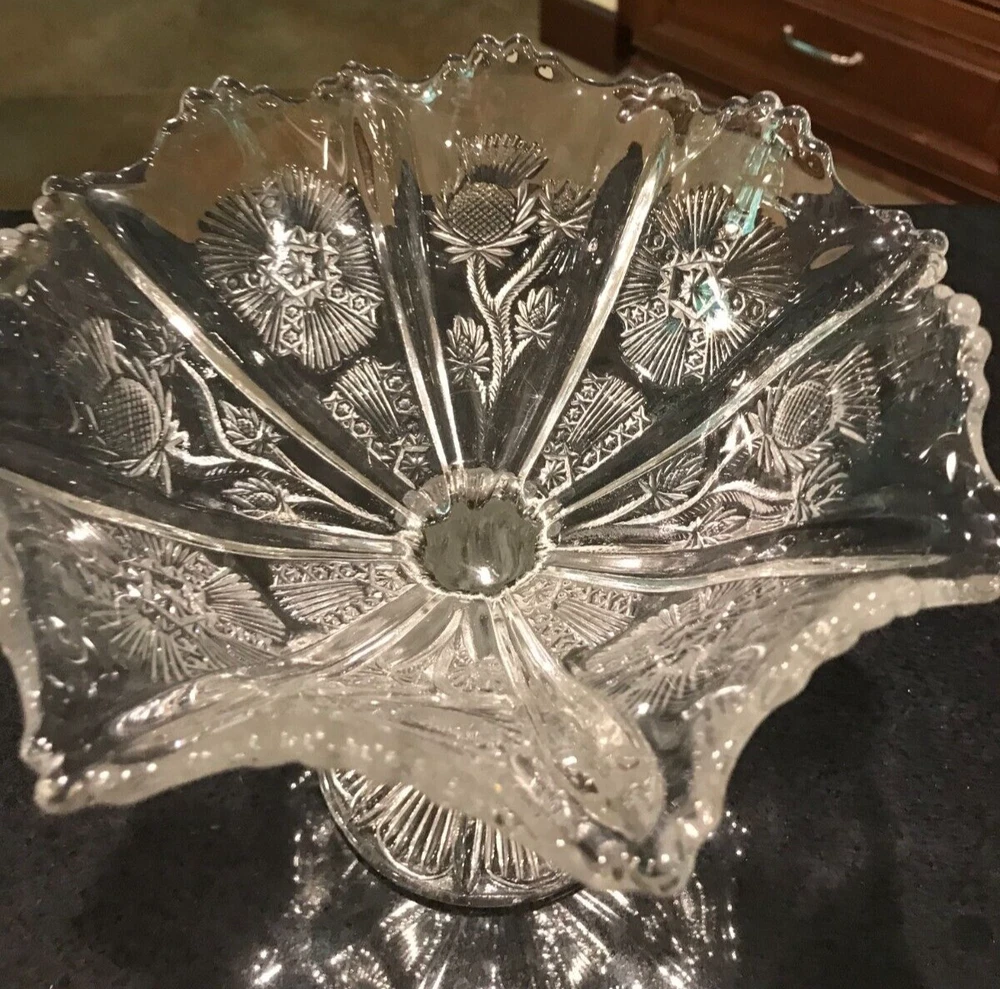 Glowing Gorgeous Antique Paneled Thistle/Delta HIGBEE Eight Paneled Pedestal Bowl. 7 1/" tall, rim 7 1/4" diameter, base 3 3/4". Unmarked. The base and the sawtooth scalloped rim glow, as well as the thick panel separators. There is, what seems to be a production flaw on 1 of the thick panel separators. It does not take away the beauty of this piece. Please refer to my photos. Panels extend to the base.