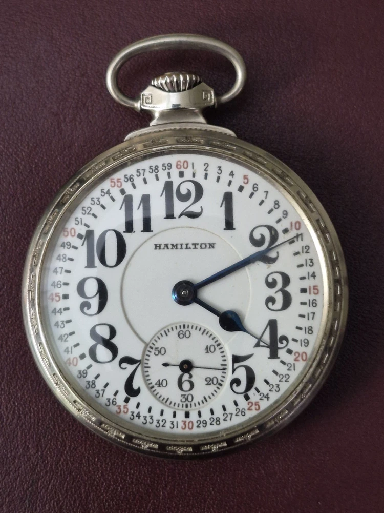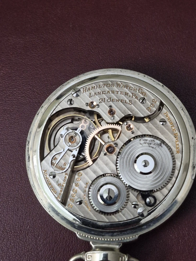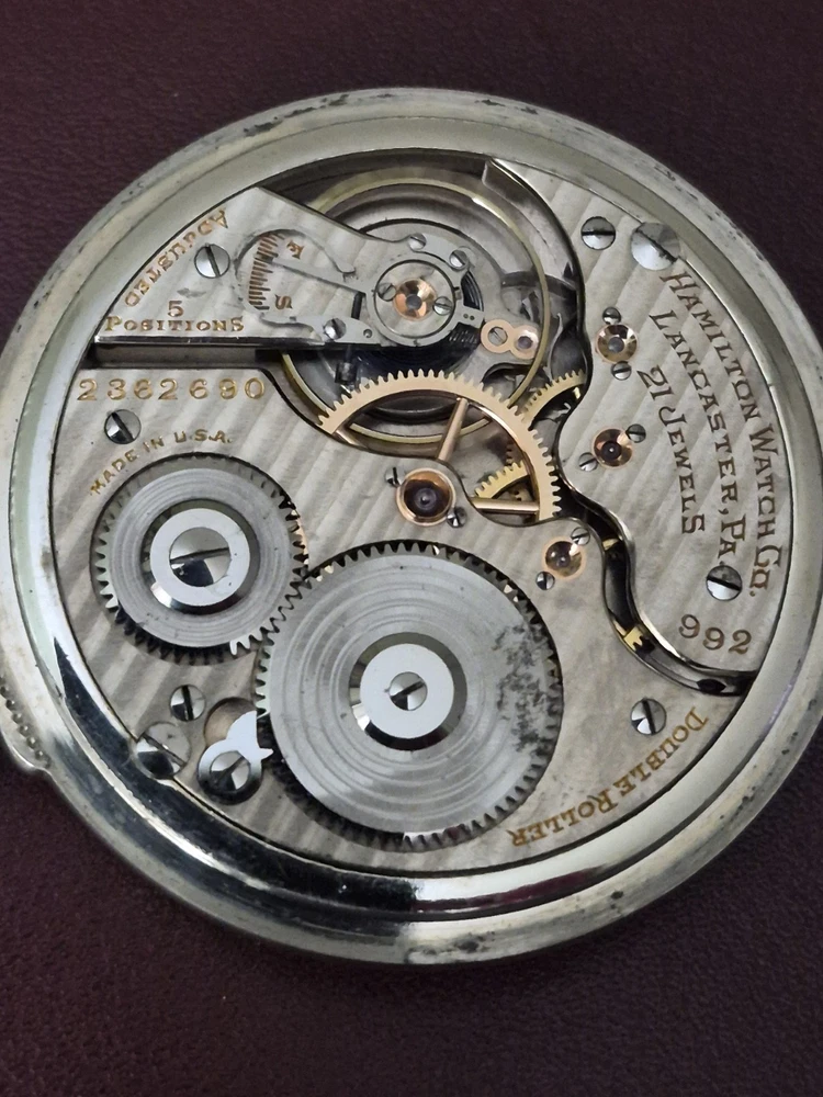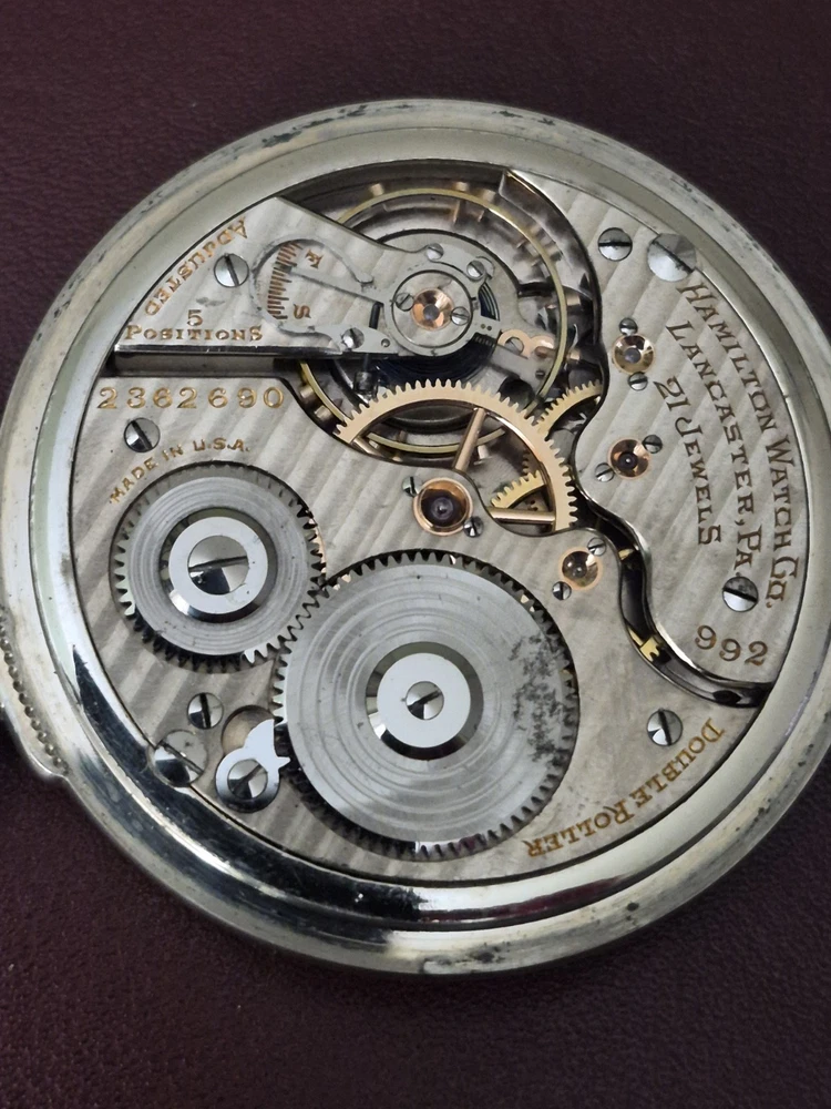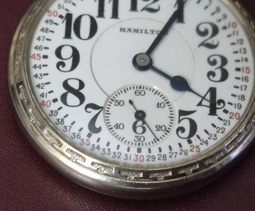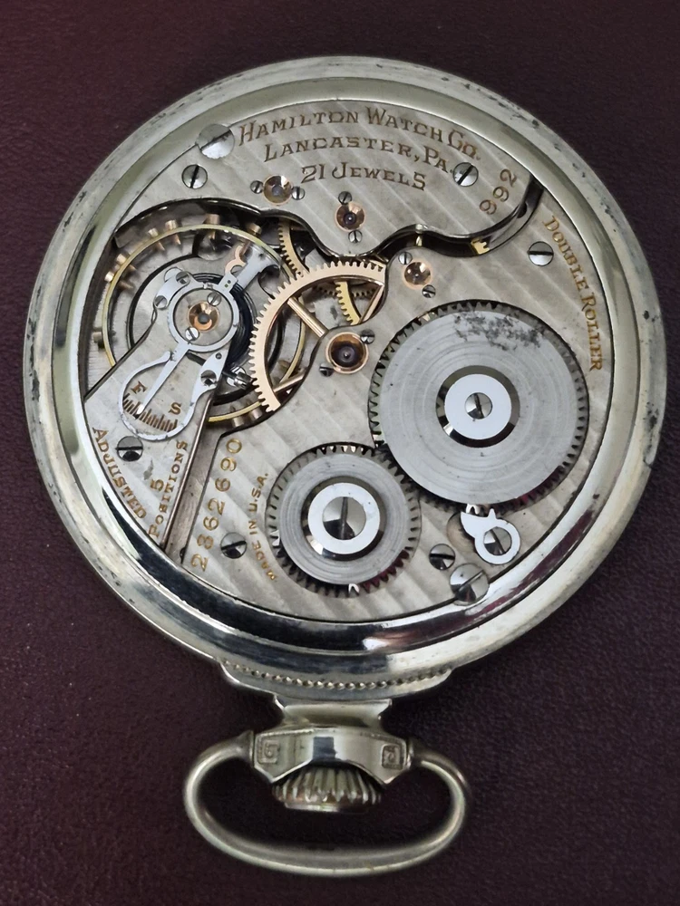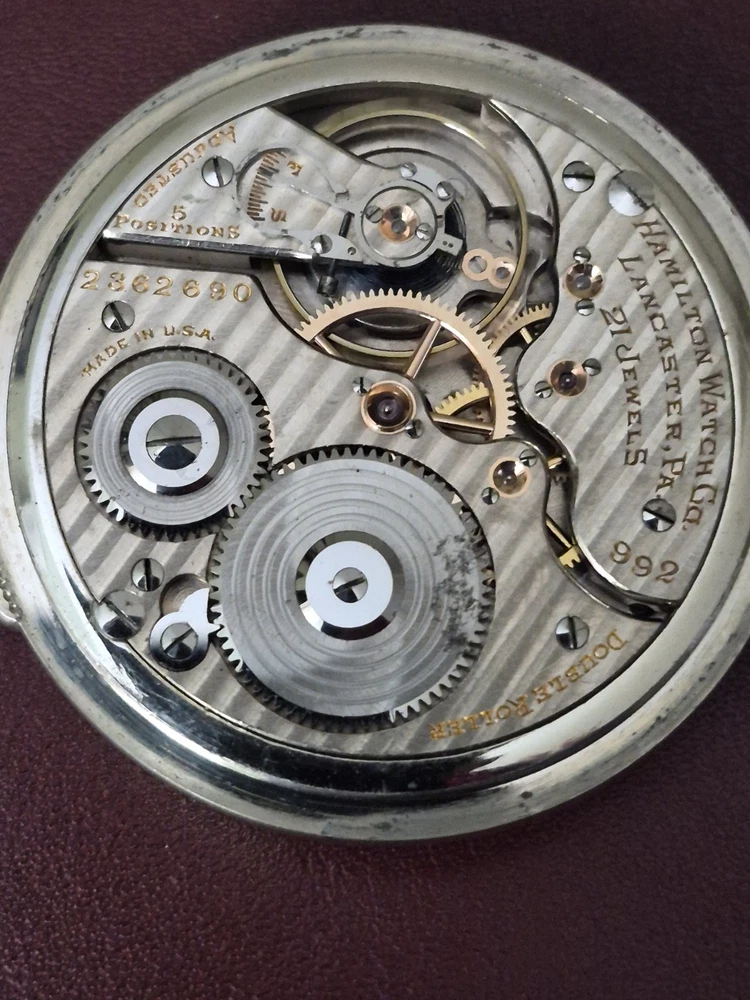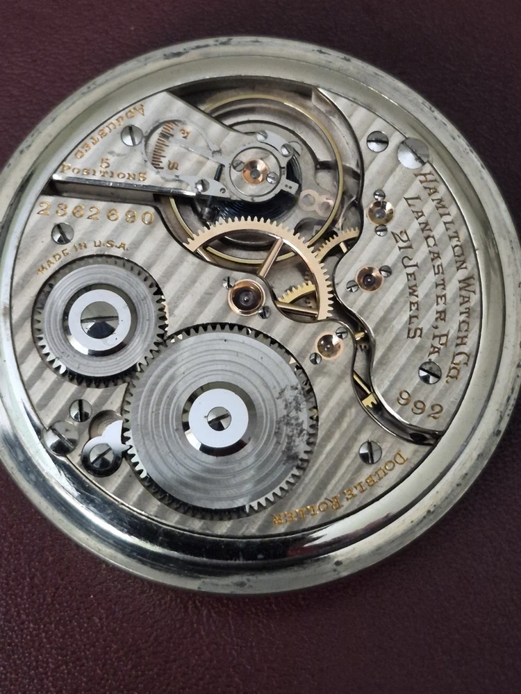 The Antique Hamilton 1926c 14kt WHITE GF 992 Railroad Grade Model 2, Gold Center Wheel and settings. This 100yr old pocket watch is a highly sought after timepiece with a rich history. Featuring a classic open face closure, 21 jewels of Sapphires and Rubies, Arabic numerals, and a lever escapement type. The 14kt WHITE Gold case with a polished finish, Greek Style boarder and screwback caseback adds to its timeless appeal. With its Railroad Grade style and features like Montgomery, this Hamilton pocket watch captures the nostalgia of a bygone era in the United States. Any questions you have, I respond within 24hrs. Thank you and God bless