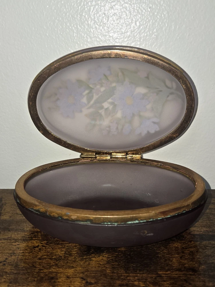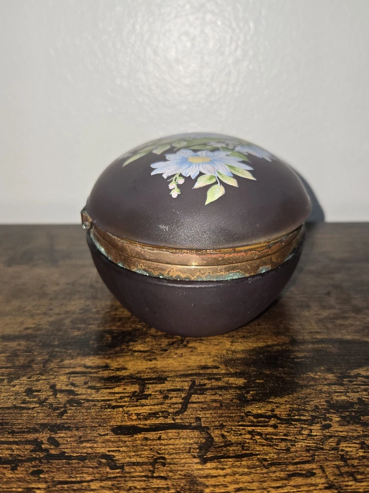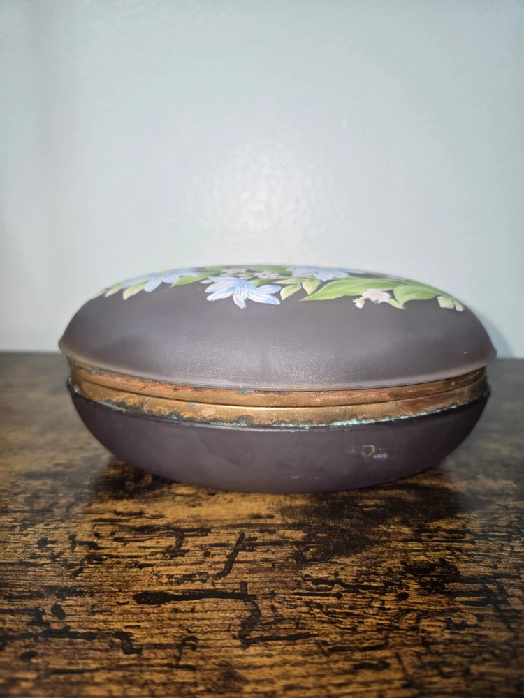 This exquisite trinket box is a must-have for collectors and admirers of Victorian style. The oval, hand-painted box is made of enamel, glass, and metal, with a beautiful floral pattern that exudes an antique charm. It is perfect for storing your precious jewels and keepsakes, and can be placed in any room to add a touch of elegance. The box is in excellent condition, with no signs of wear and tear. It is an original piece from the early 20th century, and comes with care instructions for cleaning with a damp cloth. This unique and rare item is a one-of-a-kind addition to any collection, and will surely catch the eye of anyone who sees it.