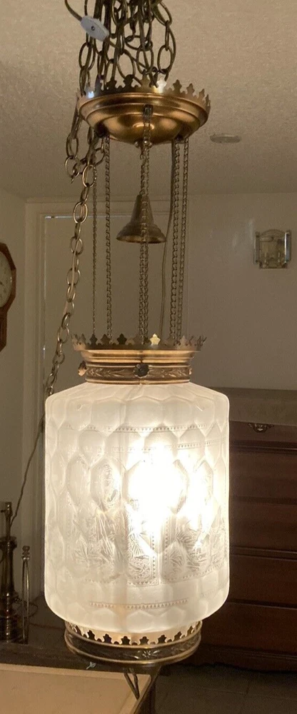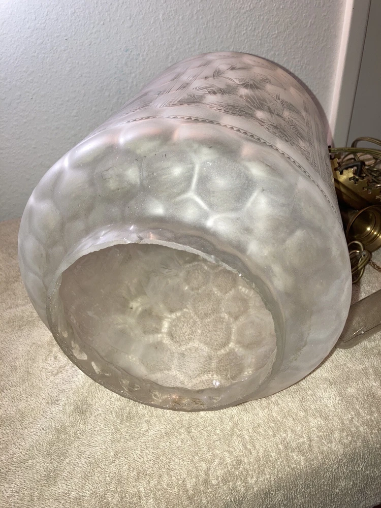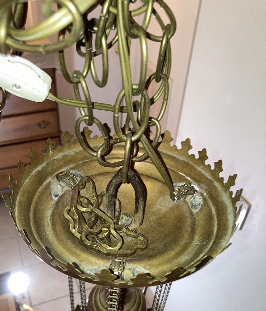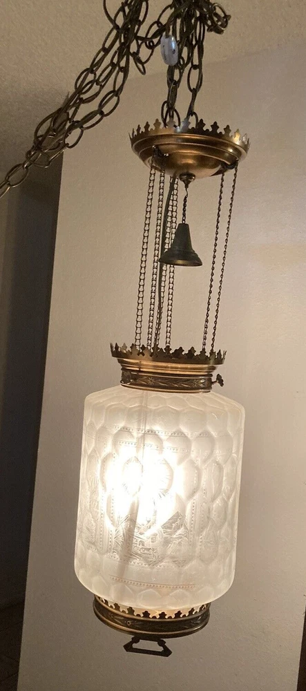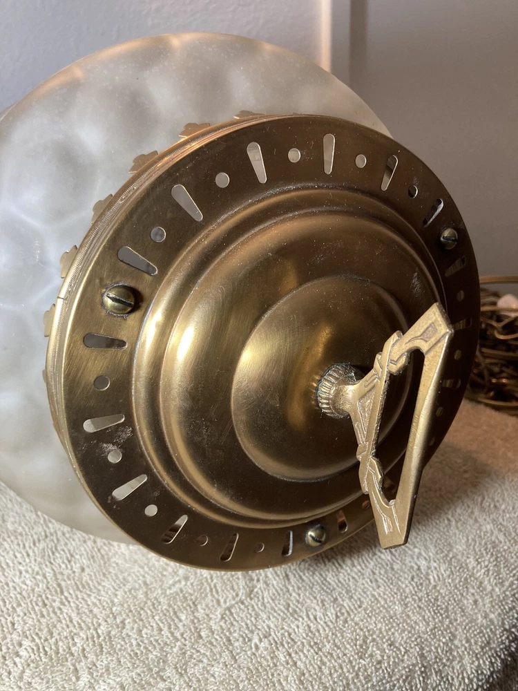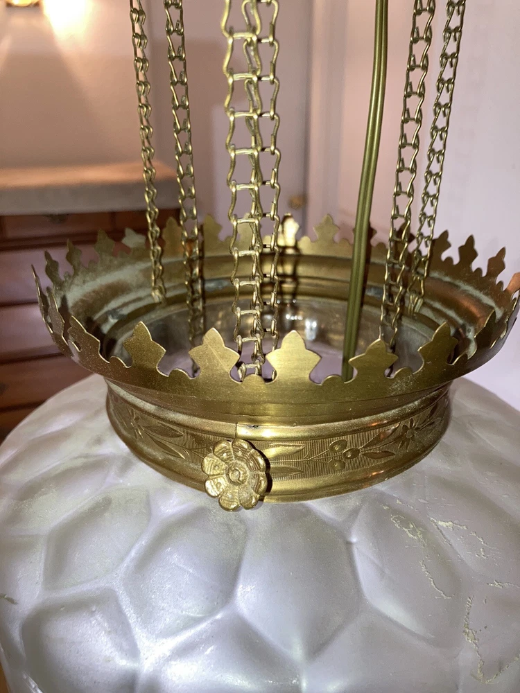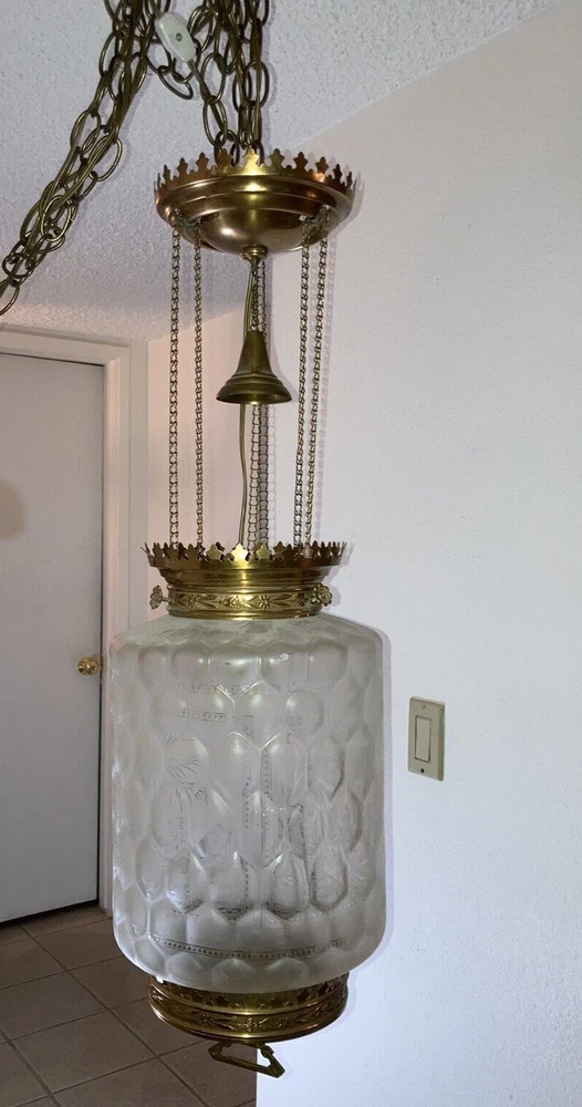 **No original pieces of this lamp have been altered for the "conversion" to accept electric. Cord was simply fed through an existing hole. Antique Hanging Oil Hall Lamp, Brass with Finger Lamp, Etched Shade with non-intrusive electric conversion. Brass is a beautiful floral design (tulips?) with flower shaped finger screws to complete. Brass has no peeling or rust and the rise & fall does work. Electrified without any structural modification to lamp that can easily be reversed. (Original 8 in chain still present too.) Chain/cord approximately 20' long total with inline switch. Frosted shade has BB sized hole on top with local 1" hairline crack. Etching of sphinx, pyramid, woman repeats once around glass. Shade itself is 8 inches wide and 10 1/2 in (showing) tall. Clear glass finger oil lamp has no chips or cracks and has an Eagle Burner (takes 3" chimney not included) / "P&A Mfg Co Waterbury CONN Made In U.S.A." on dial that works as it should. Elongated bulb included but longevity unpredictable. Glass will be removed for safe shipping...3 boxes inside of one. No international orders. Please review all actual item pictures to further describe condition and to show any other imperfections. Comes from a smoke free, pet free home. Along with "recycling" items of yesteryear, I emphasize the importance of environmental safety and not abusing our Earth's natural resources. Recycled materials may be used when packing merchandise and will not compromise the integrity of safe delivery. 16#23x22x15