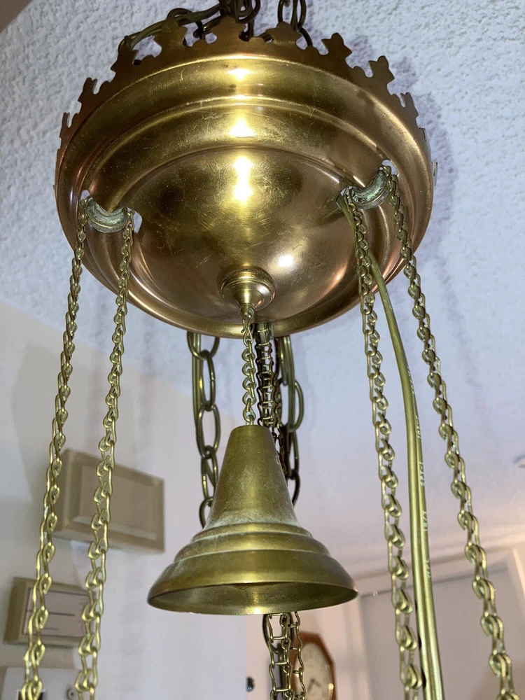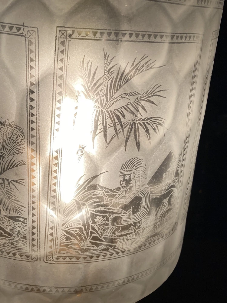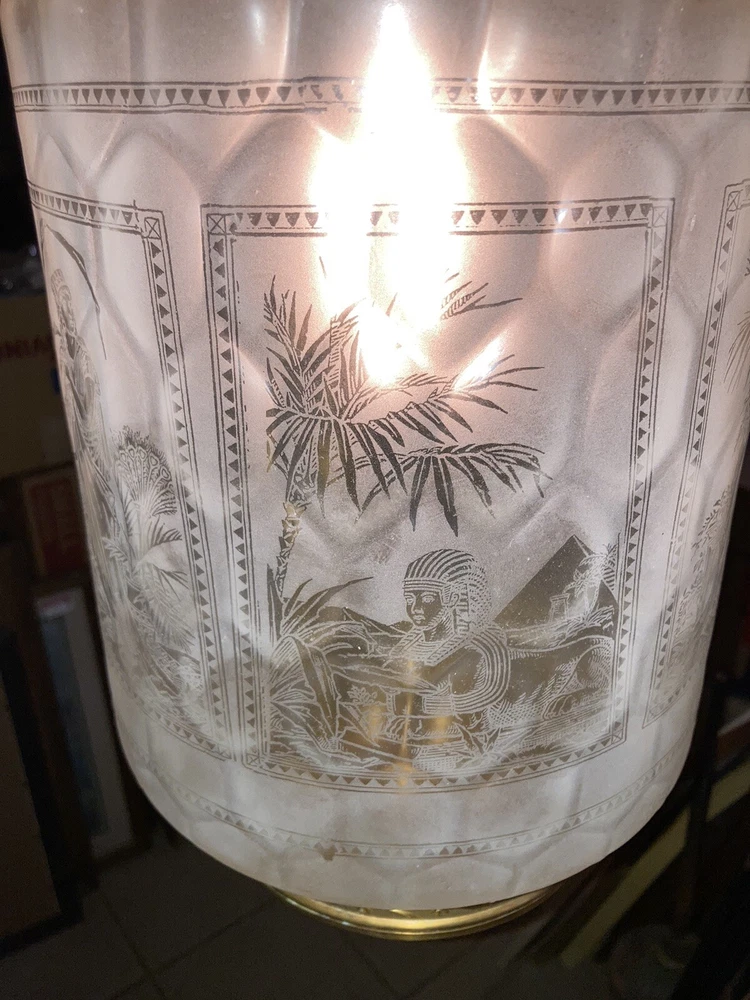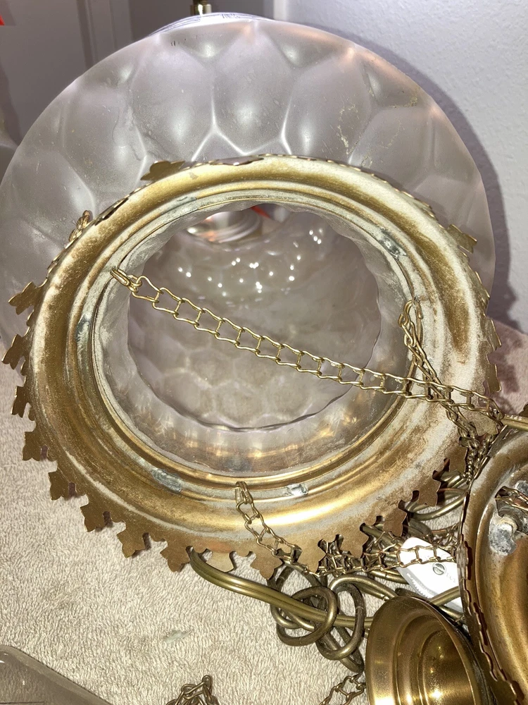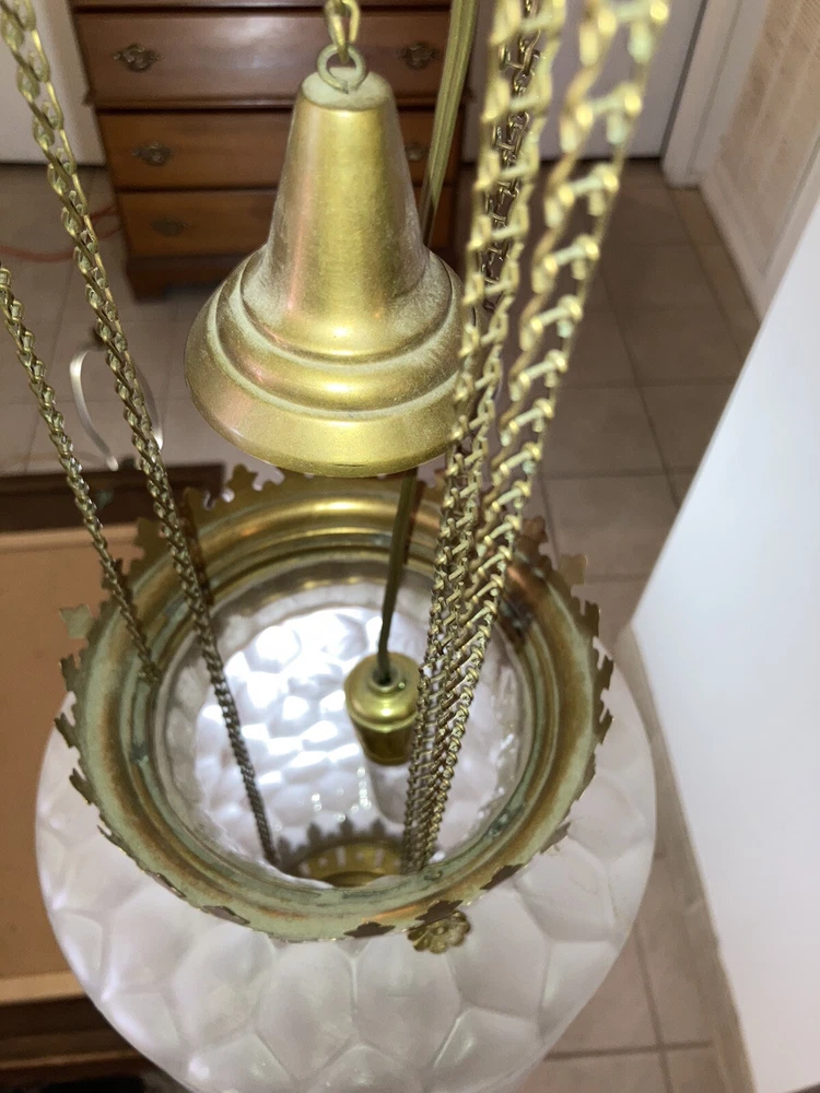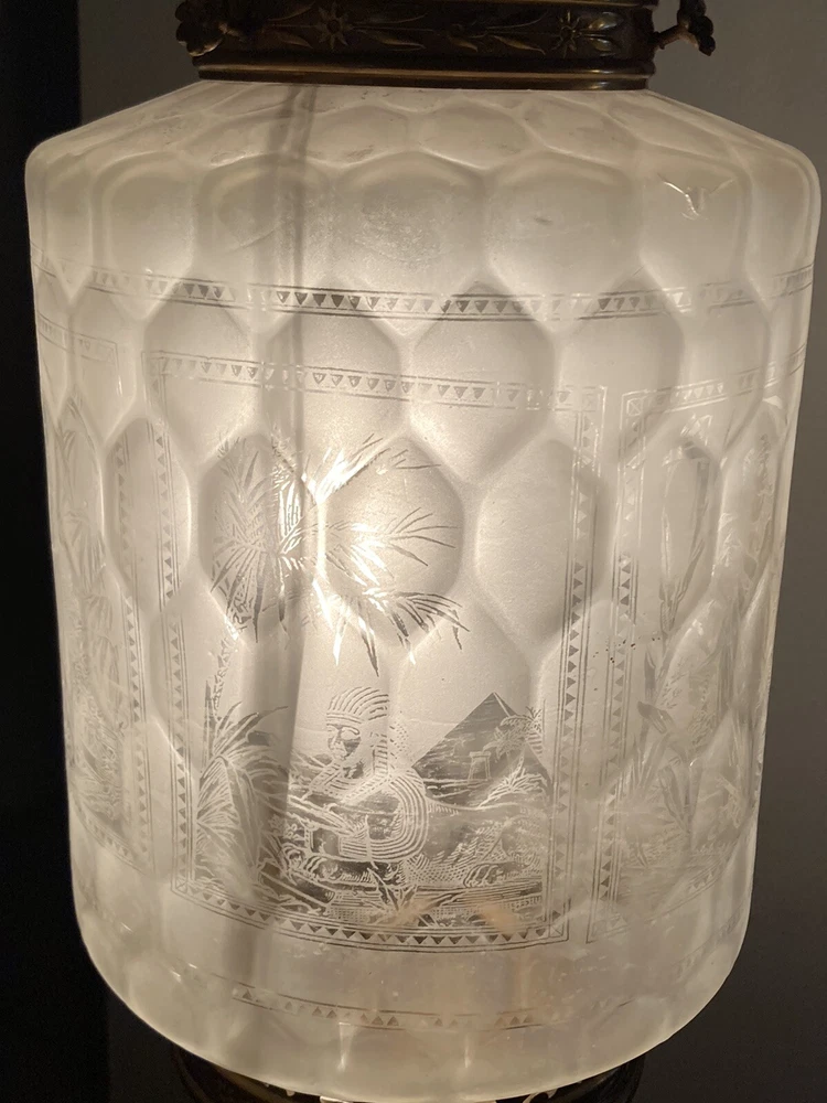 **No original pieces of this lamp have been altered for the "conversion" to accept electric. Cord was simply fed through an existing hole. Antique Hanging Oil Hall Lamp, Brass with Finger Lamp, Etched Shade with non-intrusive electric conversion. Brass is a beautiful floral design (tulips?) with flower shaped finger screws to complete. Brass has no peeling or rust and the rise & fall does work. Electrified without any structural modification to lamp that can easily be reversed. (Original 8 in chain still present too.) Chain/cord approximately 20' long total with inline switch. Frosted shade has BB sized hole on top with local 1" hairline crack. Etching of sphinx, pyramid, woman repeats once around glass. Shade itself is 8 inches wide and 10 1/2 in (showing) tall. Clear glass finger oil lamp has no chips or cracks and has an Eagle Burner (takes 3" chimney not included) / "P&A Mfg Co Waterbury CONN Made In U.S.A." on dial that works as it should. Elongated bulb included but longevity unpredictable. Glass will be removed for safe shipping...3 boxes inside of one. No international orders. Please review all actual item pictures to further describe condition and to show any other imperfections. Comes from a smoke free, pet free home. Along with "recycling" items of yesteryear, I emphasize the importance of environmental safety and not abusing our Earth's natural resources. Recycled materials may be used when packing merchandise and will not compromise the integrity of safe delivery. 16#23x22x15