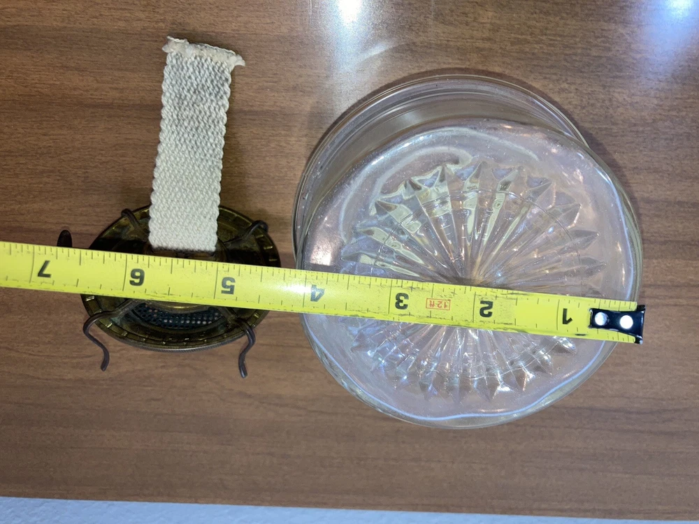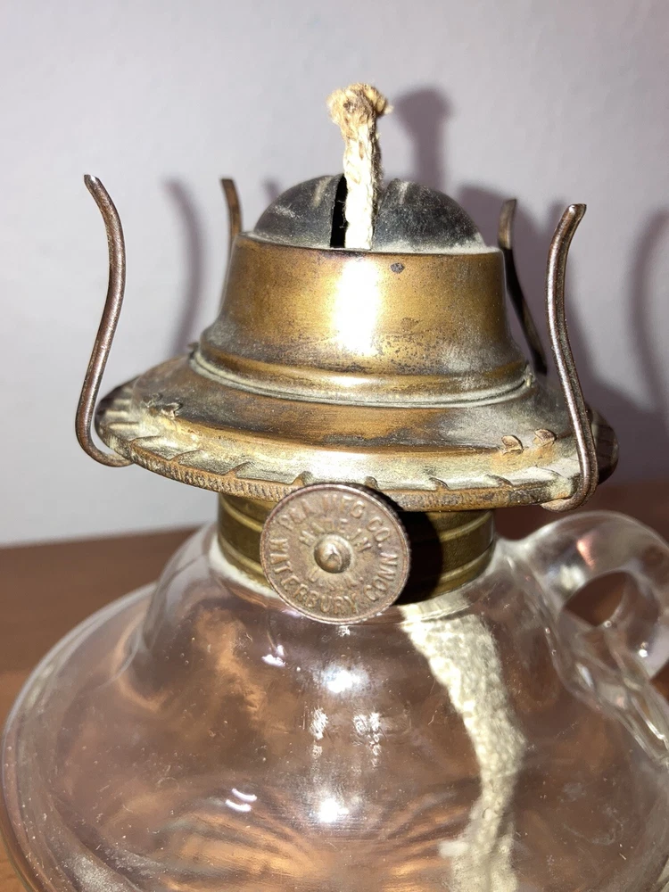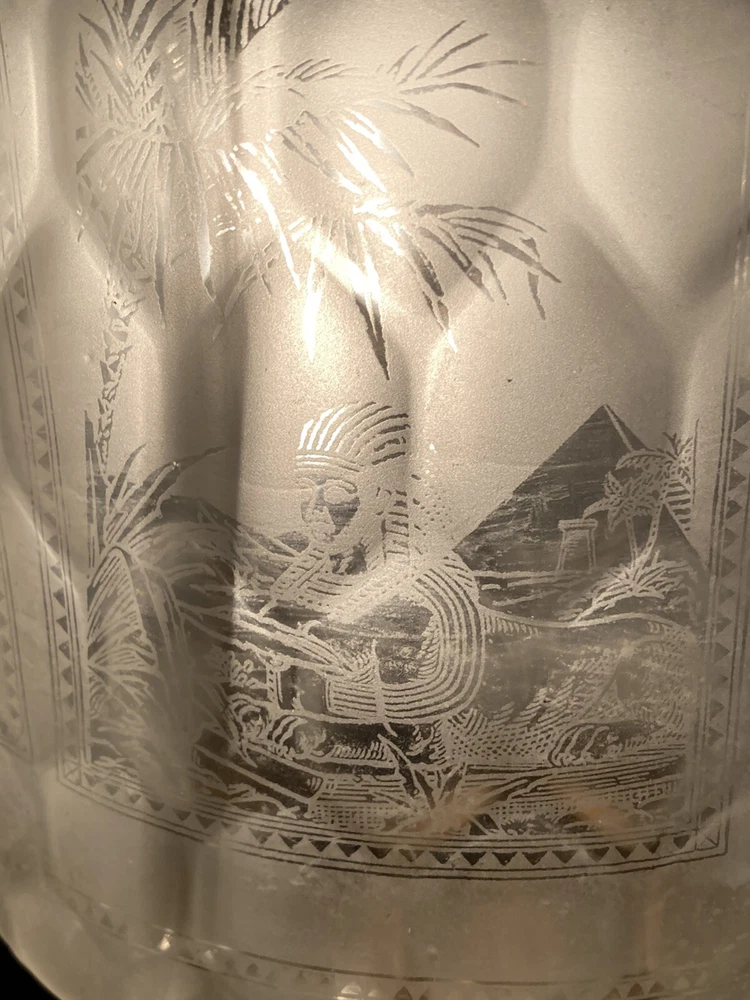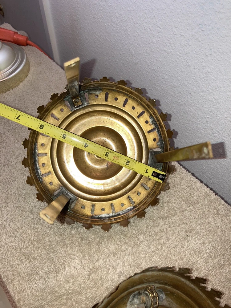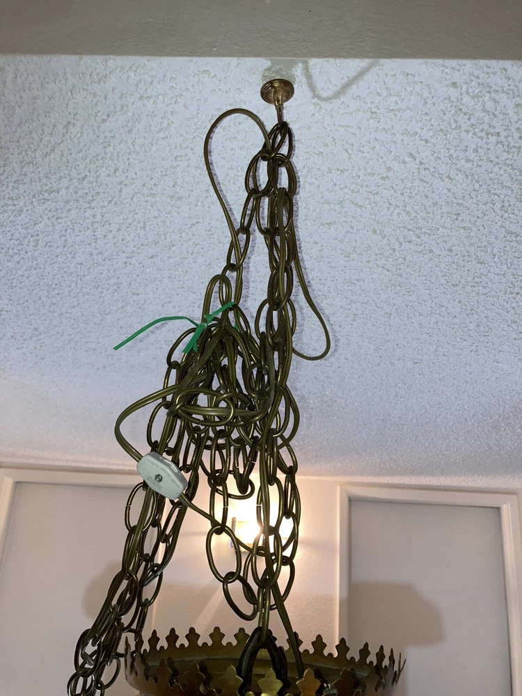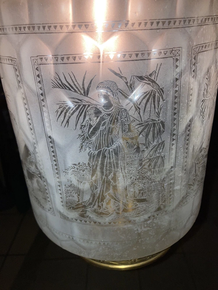 **No original pieces of this lamp have been altered for the "conversion" to accept electric. Cord was simply fed through an existing hole. Antique Hanging Oil Hall Lamp, Brass with Finger Lamp, Etched Shade with non-intrusive electric conversion. Brass is a beautiful floral design (tulips?) with flower shaped finger screws to complete. Brass has no peeling or rust and the rise & fall does work. Electrified without any structural modification to lamp that can easily be reversed. (Original 8 in chain still present too.) Chain/cord approximately 20' long total with inline switch. Frosted shade has BB sized hole on top with local 1" hairline crack. Etching of sphinx, pyramid, woman repeats once around glass. Shade itself is 8 inches wide and 10 1/2 in (showing) tall. Clear glass finger oil lamp has no chips or cracks and has an Eagle Burner (takes 3" chimney not included) / "P&A Mfg Co Waterbury CONN Made In U.S.A." on dial that works as it should. Elongated bulb included but longevity unpredictable. Glass will be removed for safe shipping...3 boxes inside of one. No international orders. Please review all actual item pictures to further describe condition and to show any other imperfections. Comes from a smoke free, pet free home. Along with "recycling" items of yesteryear, I emphasize the importance of environmental safety and not abusing our Earth's natural resources. Recycled materials may be used when packing merchandise and will not compromise the integrity of safe delivery. 16#23x22x15