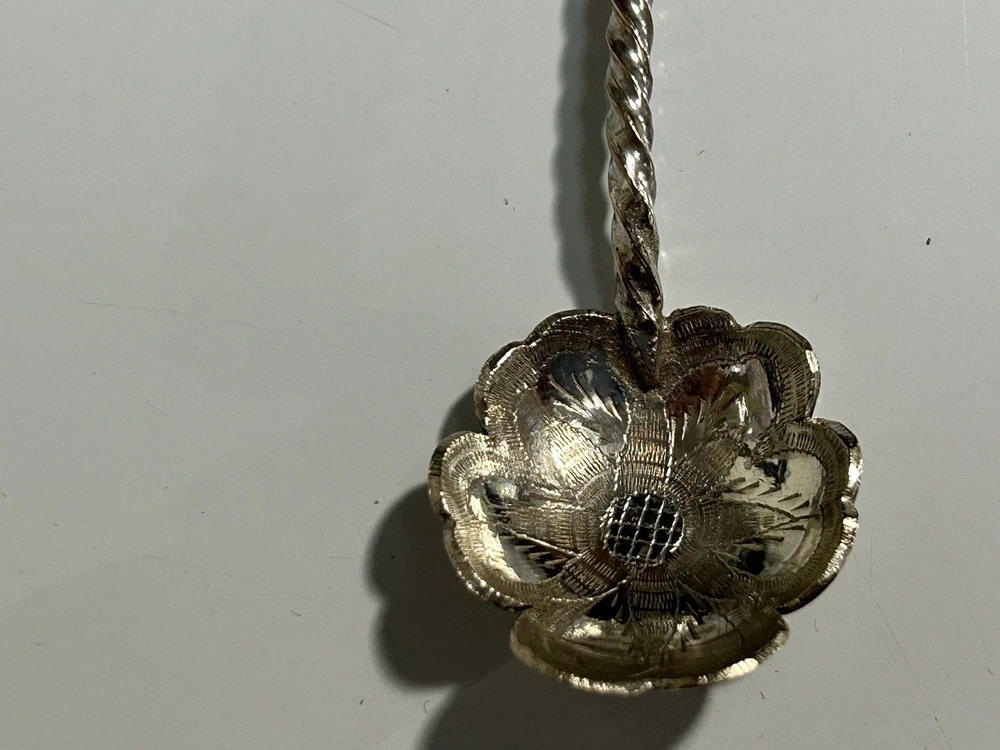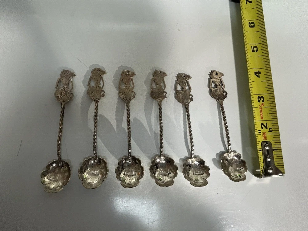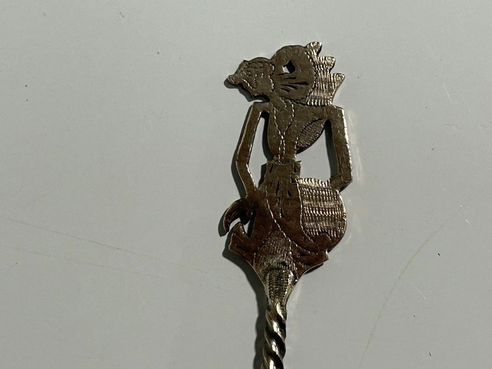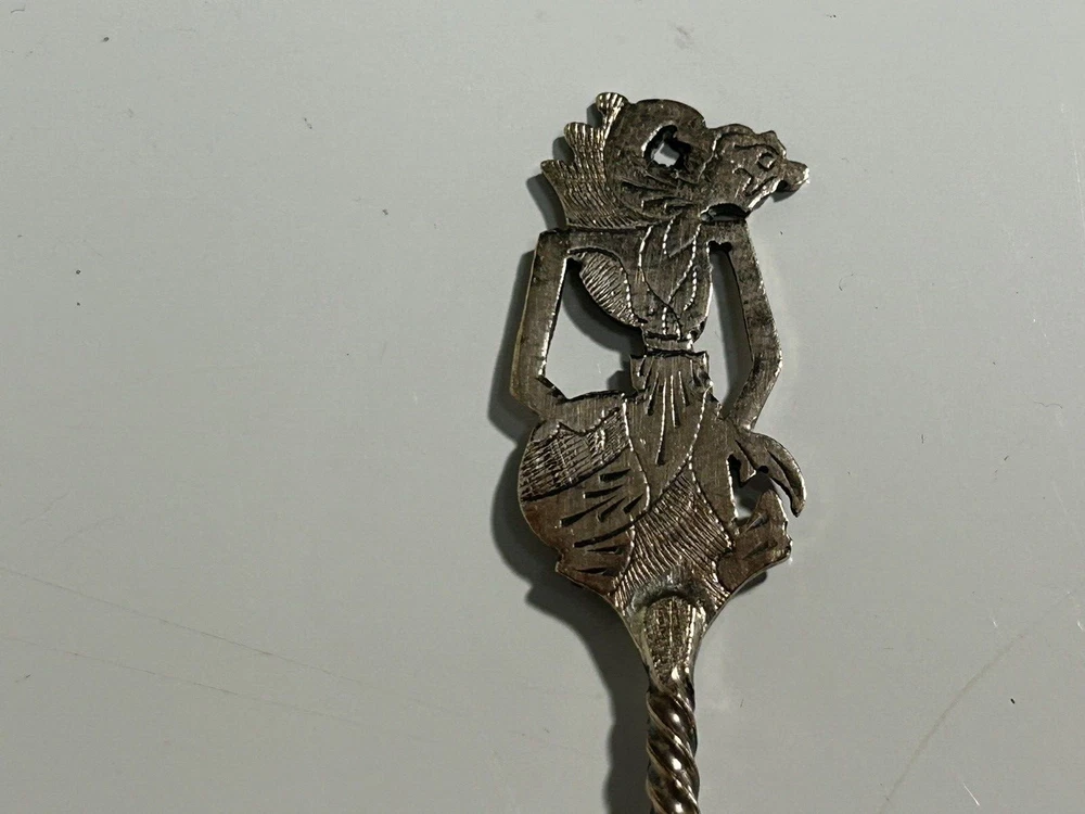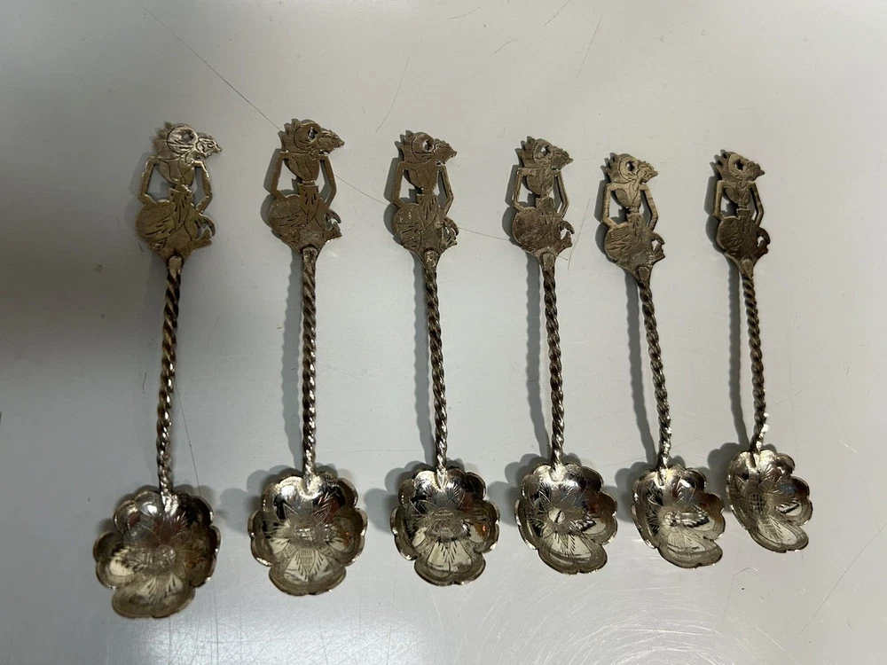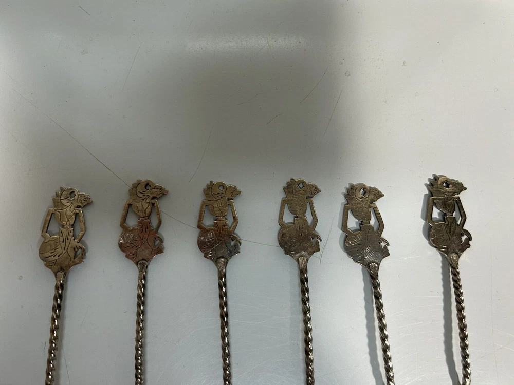 Antique Indonesian sliver plated teaspoons, 4Inches in length, set of 6. Wayang shadow puppet handle, etched floral design on spoon bowl, used.