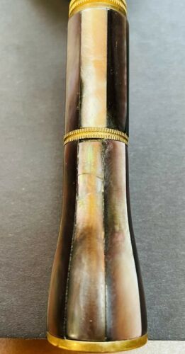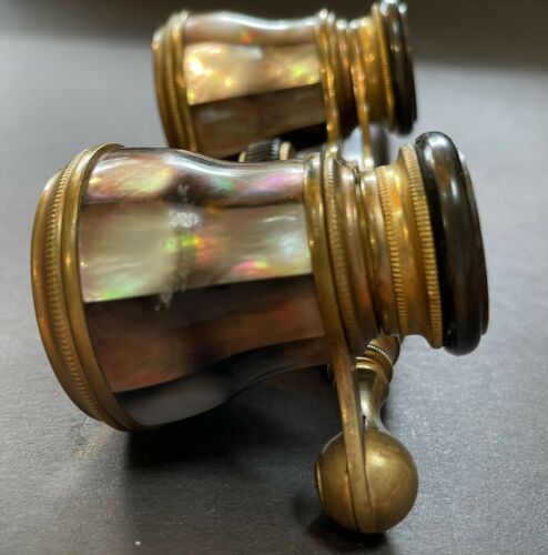 Beautiful pair of mother of pearl telescoping opera glasses with handle, made by La Vouge Paris. These are really pretty with a dark purple/black hew to them. The handle comes apart, and internal metal rod comes out and can be screwed and reconfigured to telescope--does take a few attempts if you are not familiar with them. These would make a great statement piece to your collection. Lens dials to zoom turn smoothly. Measures: Handle fully extended with telescope 8.5" With Handle not extended 4.5" Binoculars are 4" across. Excellent estate found condition. Glasses do have an area on the handle where the mother of pearl has cracked but is still present. Small area on one of the monocle mother of pearl where it is cracked but still present. I did not see any areas of pearl loss. One of the side of the lens frame was dropped at some point in its history and has a very small area that is missing the frame and is white surface staining-- please see photos very minor imperfection but still present. There is some sticker residue on one of the monocles mother of pearl ares--could easily be removed by new owner I am selling as is. They are marked La Vouge Paris on lens frame. As a general disclaimer, all items are sold as is where is. They are vintage estate found and all items run the risk of having the following defects which are, but not limited to: age spots dark or light, scratches, paint loss, fading, signs of age, signs of use, signs of general wear and tear, signs of storage. These defects are assumed to be present in all items--but as stated above I try to describe all items in complete accuracy. Additionally, seller is not responsible for any color deviations-- each users computer/smart phone displays colors differently based on user preferences, these preferences may make colors appear brighter/darker/muted/lighter ect. Buyer accepts this upon purchase of item. If you require additional photos to double check colors please let me know, I am happy to provide any needed. If you have a question, are unsure, or require additional photos please do so prior to purchase, as I do not accept returns. I am happy to answer any questions, and provide additional photos as needed. In the rare occasion a return is accepted by this seller, buyer agrees to all return shipping charges and upon purchase of this item further agrees to a 35% restocking fee being deducted from their refund.
