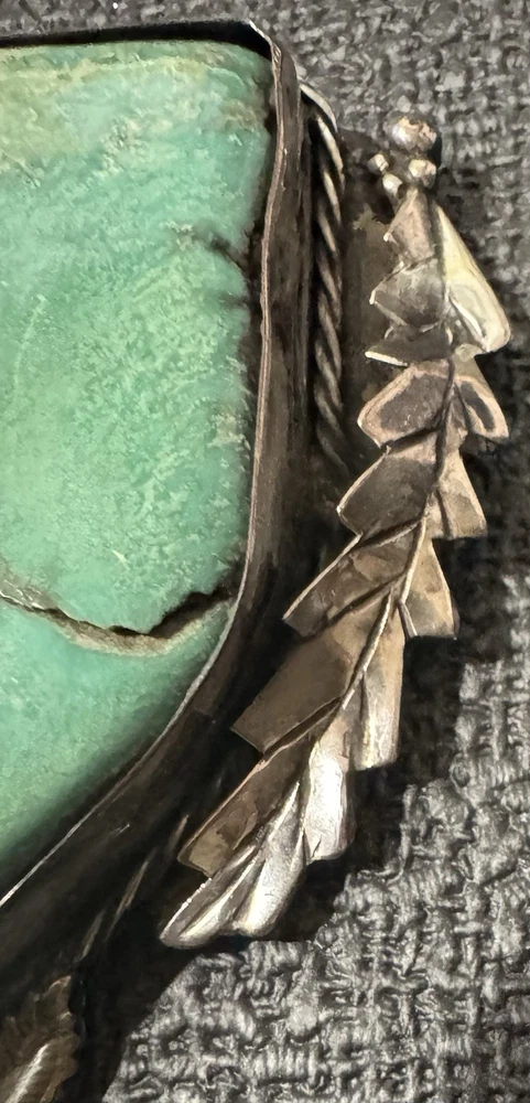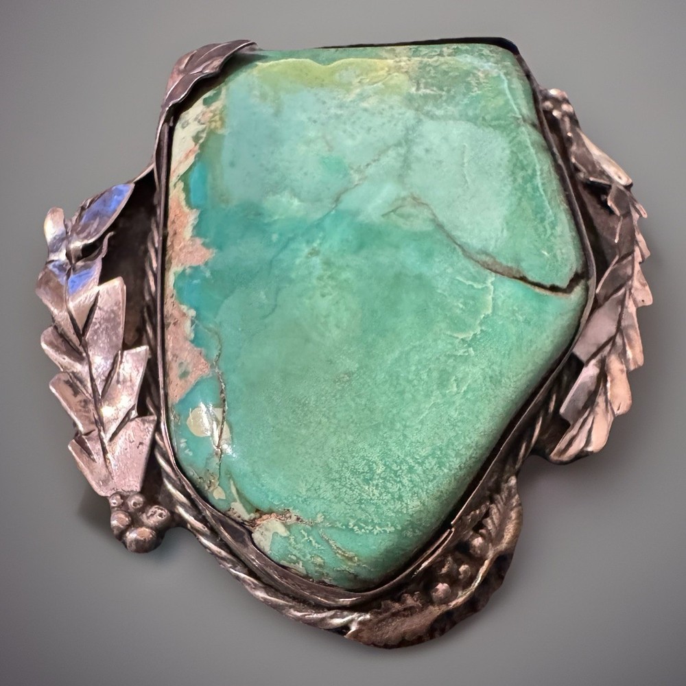 Antique Large Navajo Sterling Silver Turquoise Pendant Solid Mount 3” O Ring Solid with hallmark/stamp. OOAK Weight- 99 grams/3.2 oz Color grade-Blue Green O ring on top of setting. Laurel Leaf/Feather/Roping surround on setting. Backing of mount is closed with sterling Silver with Hallmark
