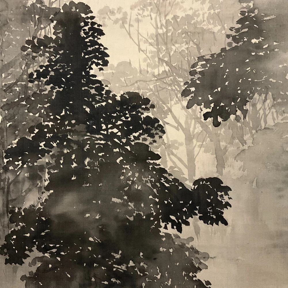 The Antique Late 19th Century Meiji Period Japanese Original Ink on Silk Landscape Scroll Painting "Forest Mountain After Rain" , Signed By Artist Mochizuki Gyokusen ( Japanese, 1834-1913 ) with Seal in Lower Right. The Painting Depicts the Extremely Poetic Scenery of the Forest Mountain in the Early Morning After the Rain. The Dense Forests and Temple Tower in the Misty Clouds, and the Birds Soar Freely in the Sky. The Mountains are Stacked, From Dark to Light, Gradually Moving Away. Large Areas of Pine Forests are Painted with Heavy Ink to Support the Painting, which is Both Real and Lively. The Ink Color of the Painting Blended, Emphasizing the Dark and Wet Layers of Blur, and the Brush and Ink are Free Between Romance and Reality to Seek Change. In A Natural and Gentle Painting Method, It Creates A Harmonious and Peaceful Atmosphere and A Bright and Fresh Mood. The Painting Shows Minor Toning, Crease, and Wear on the Scroll Mat Consistent with Age, In Good Condition. About Artist: "Mochizuki Gyokusen (望月玉泉) (1834-1913) was a Japanese painter and active from the Meiji to Taishō eras of Japan as well as the fourth generation principal of Mochizuki school. He studied the painting technique under his father, Mochizuki Gyokusen (望月玉川). In 1845, while serving to Kikutei family at the age of 13, he roamed around outside provinces including Ise Province and Suruga Province. While he had a great regard for sketching, he assimilated the painting styles of Maruyama school and Shijō school so that he became well-known with his paintings of landscapes and flowers & birds in the Kyoto painting world. In 1852 he succeeded the principal position of the school at the age of 18. The Mochizuki family was serving to the Imperial Palace from generation to generation. For example, it drew fusuma-e (images drawn or painted on fusuma door) when the Kyoto Imperial Palace was built newly in 1855, and then devoted the works such as folding screens at the occasion of the enthronement of the Emperor Meiji. He exhibited “Fugakuzu (Figure of Mt. Fuji)” and awarded the Bronze prize with the piece of work at Paris Exposition in 1889. And, he received the honor of the purchase by Ministry of Agriculture and Commerce at World’s Columbian Exposition in 1893. He was active in national industrial exhibitions in japan as well. In addition, he established Kyoto Prefectural School of Painting with Kōno Bairei to contribute to foster the younger generations. In 1904, he was appointed to be an Imperial Household Artist. He dedicated his life in his last years to focus on painting of flowers & birds. Kawai Gyokudō was a disciple studied under him and Mochizuki Gyokukei (望月玉渓) was a son of him." Title: "Forest Mountain After Rain" Artist: Mochizuki Gyokusen ( Japanese, 1834-1913 ) Time Period: Late 19th Century Medium: Ink on Silk Condition: Good Condition Scroll Size: 74" By 16-1/2" Painting Size: 41-1/2" By 12-1/2" Available For Domestic Shipping and International Shipping. Thanks!