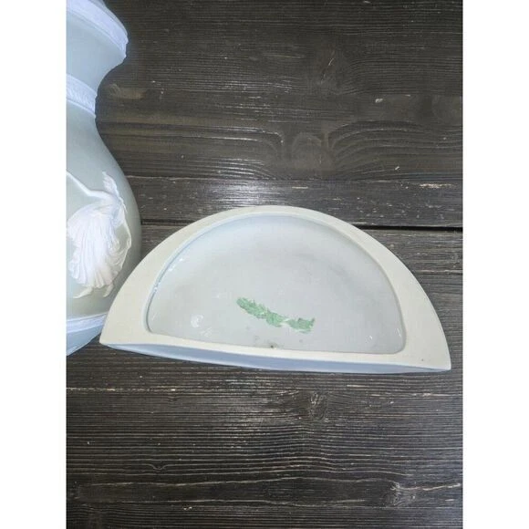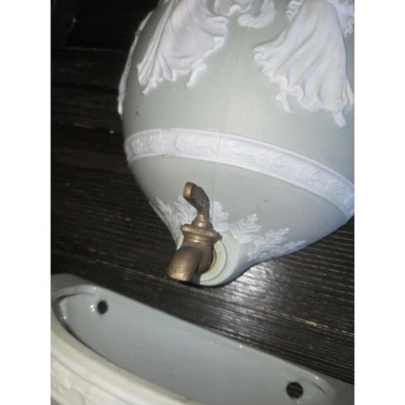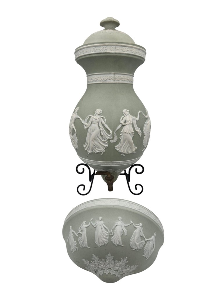 Elegant antique water dispenser and basin set featuring exquisite relief work depicting classical dancing figures in white against a soft sage background. Perfect for creating a sophisticated focal point in a powder room, garden room, or covered patio. The decorative wall-mounted design adds both functionality and artistic charm, ideal for entertaining spaces or creating an old-world European ambiance. Repair shown in photos on lid. Keywords: vintage water dispenser, ceramic wall fountain, neoclassical decor, wall mounted basin, grecian relief art, antique bathroom accessories, decorative water vessel, classical wall decor, vintage bathroom fixture, sage green ceramic