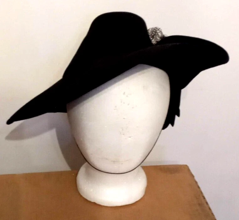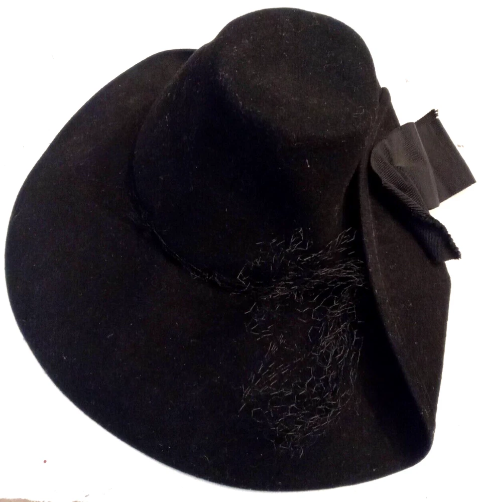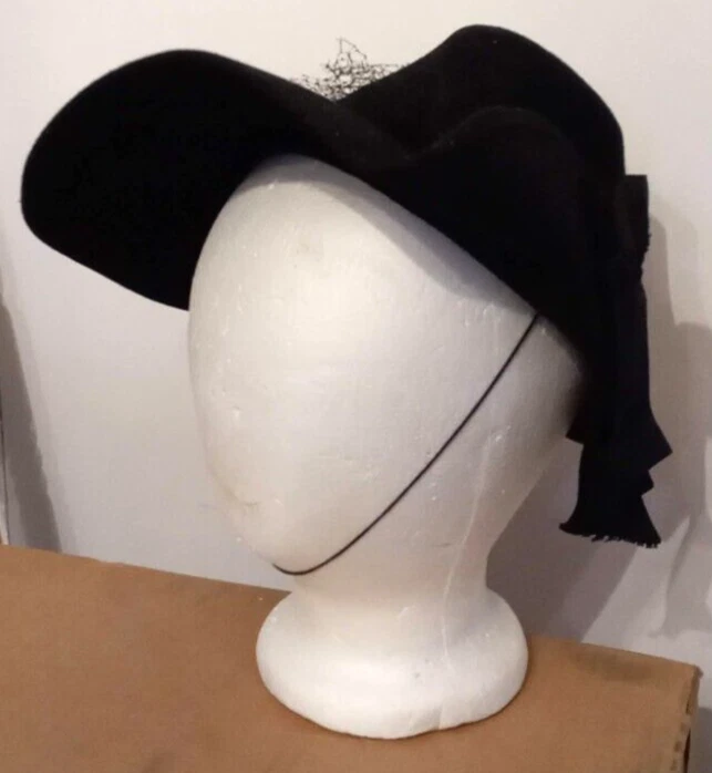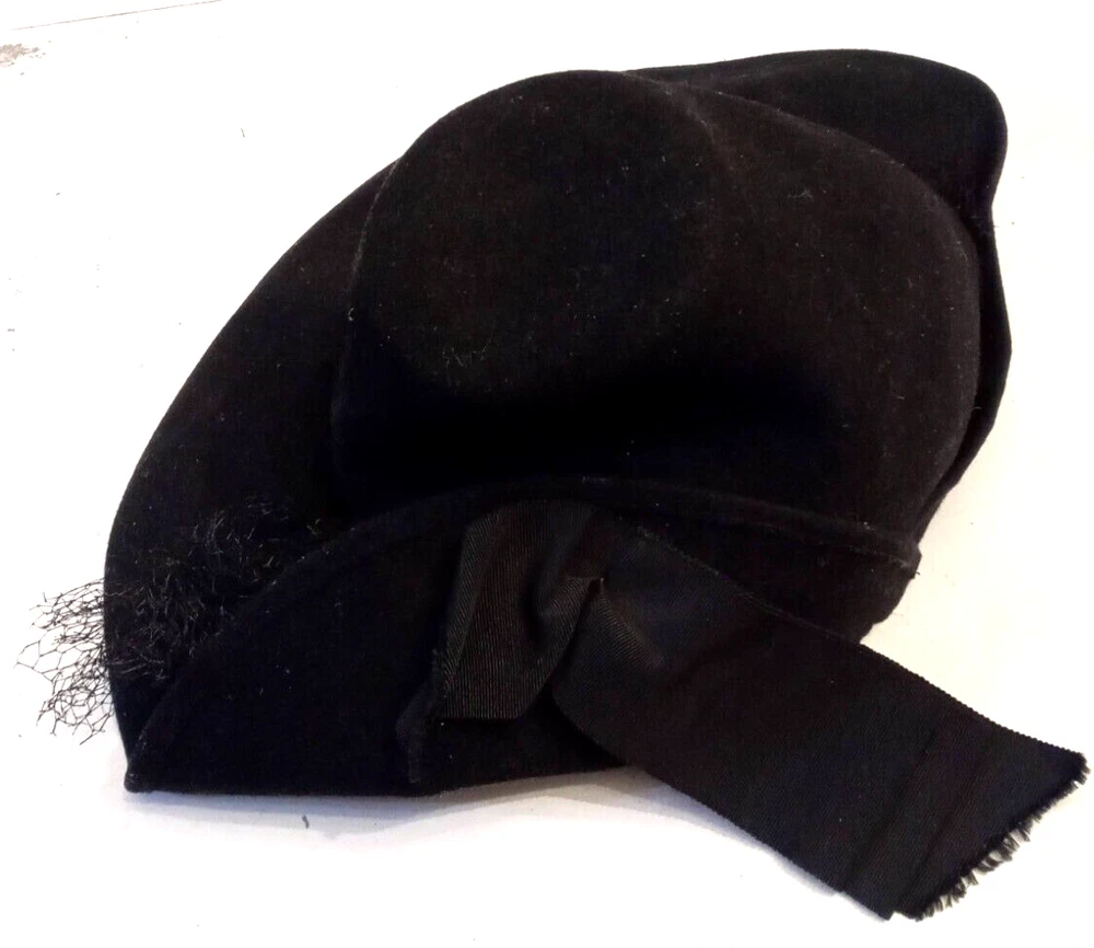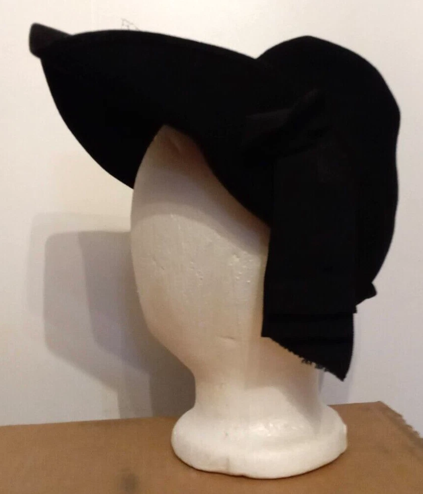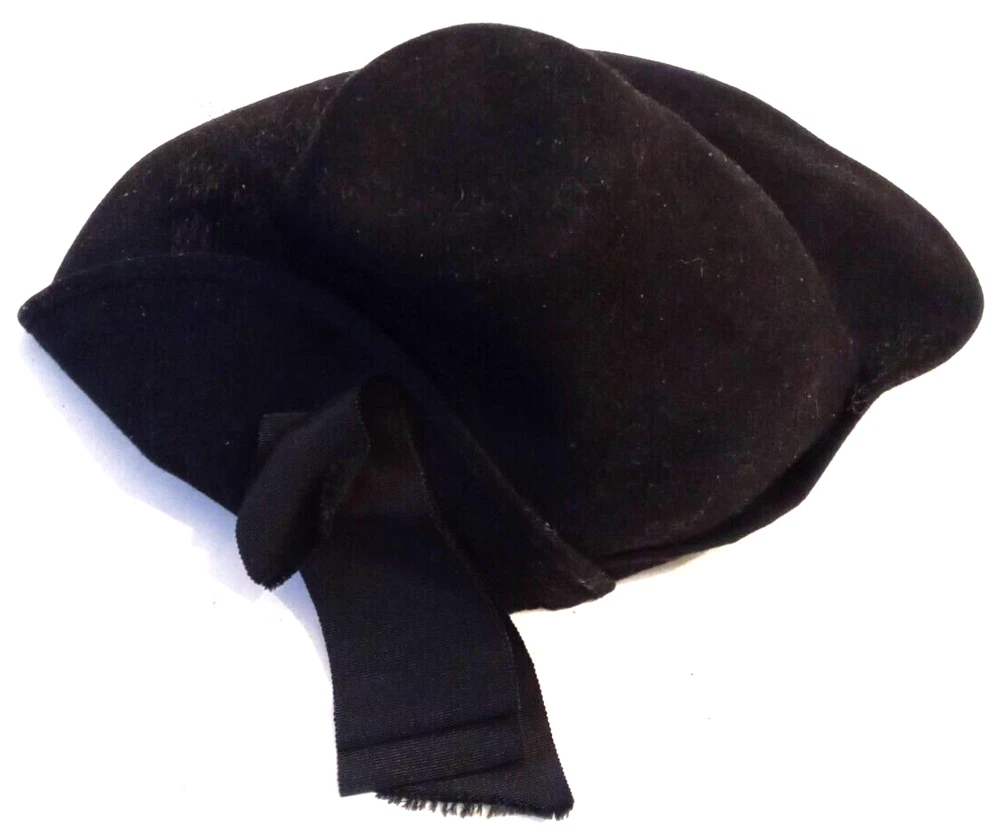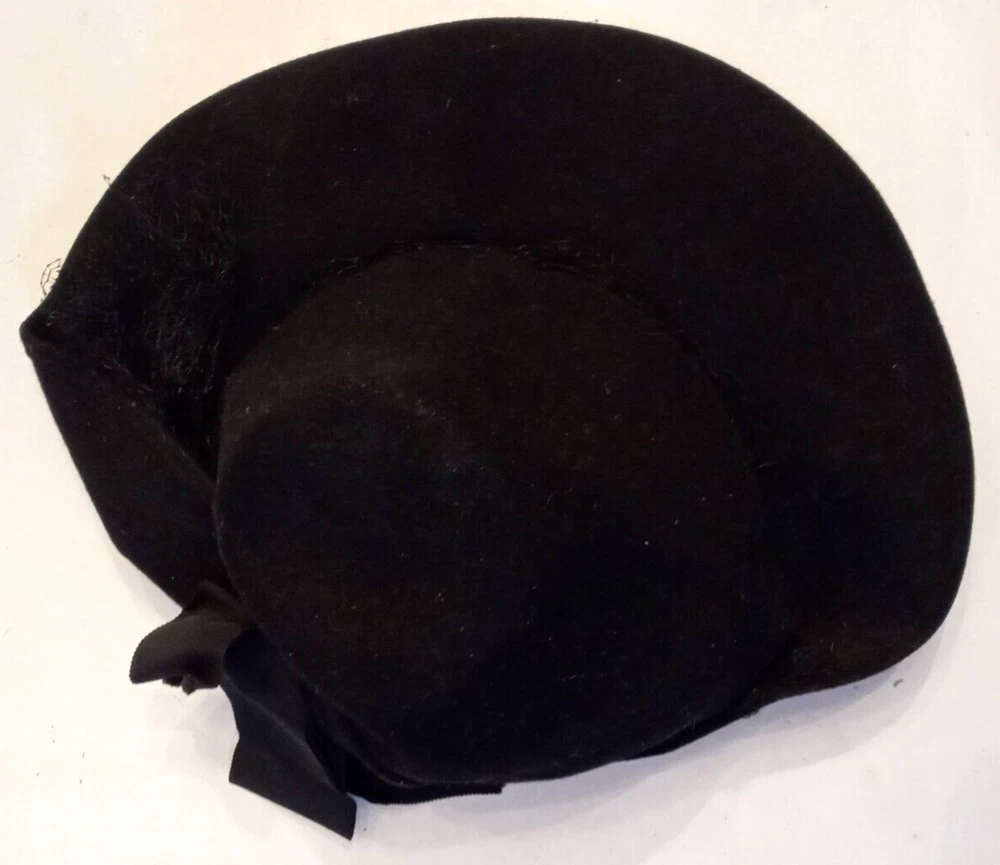 This Victorian Era Unicorne hat by Merrimac Hat Corp is a black wool hat featuring a grosgrain ribbon and bow accent. Nice Antique Condition, but most of the original netting appears to be missing. Made in the USA, this hat is perfect for historic or cosplay events, or parties and other special occasions The hat is crafted from felted 94% wool and 6% casein materials and has an elastic chin strap that still stretches. This beautiful unicorne hat is a stylish accessory for women looking for a unique addition to their historic clothing collection. Ships quick from a Smoke Free Home. Combined Shipping Discounts Available. Please use the add to cart button feature in the listings to shop my store and combine your purchases.