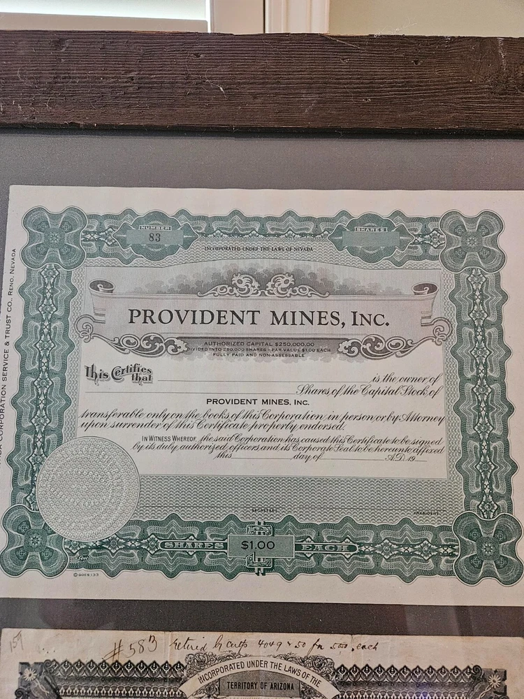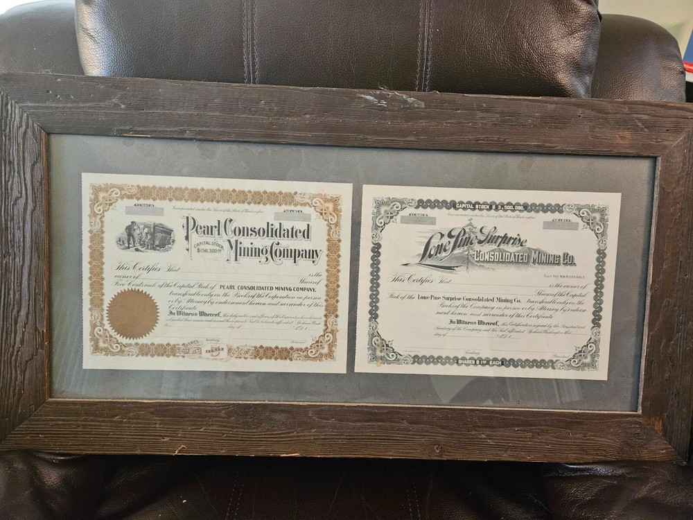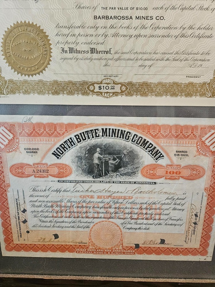 This antique collection features stock certificates from the oil and mining industry, with a total of (8) framed and mounted certificates. The certificates showcase various designs and colors, all from the United States. Each certificate has its own unique history and story to tell, making them a great addition to any collection or investment portfolio. Some of the certificates are circulated and have signatures, while others are blank. Some are dated. This collection is perfect for anyone interested in mining, stocks, and bonds, or for anyone who appreciates the historical significance of these documents. Particulars are: Unsigned certificates from Provident Mines, Forest Oil Company (12/12/1933), Barbarossa Mines Co (1/11/1930), Lone Pine Surprise Consolodated Mining Company, and Pearl Consolodated Mining Company. Signed Certificates: North Butte Mining Company, One hundred shares issued to Thomas Hayes Bartholomew, with four (4) corporate signatures, undated Coarse Gold Gulch Mining Company, two corporate signatures, dated January 11, 1930 Atlanta Mines Company, issued to C.S. Rolph, one thousand shares with two corporate signatures, Canceled documentation. Two of the framed items are 31" x 18" one is 27.5" x 17" $60 has been added to this listing as it has been professionally packaged, and shipping will be estimated after sale, shipping ONLY to the lower US states.