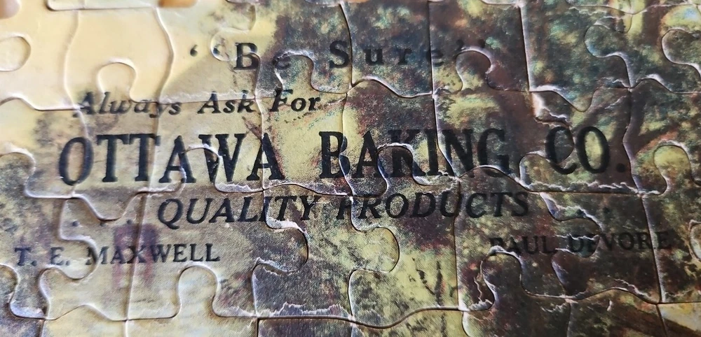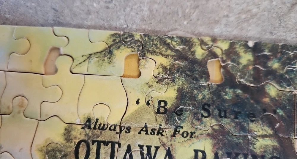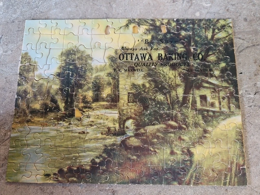 This antique 150 piece jigsaw puzzle was made by Royal Jig Saw Puzzles for Ottawa Baking Co. The Baking company gave them out as a promotion when you collected a certain number of bread wrappers. Approx 9" x 7" finished size and comes with it's original envelope. 4 pieces have a torn off missing corner as shown.