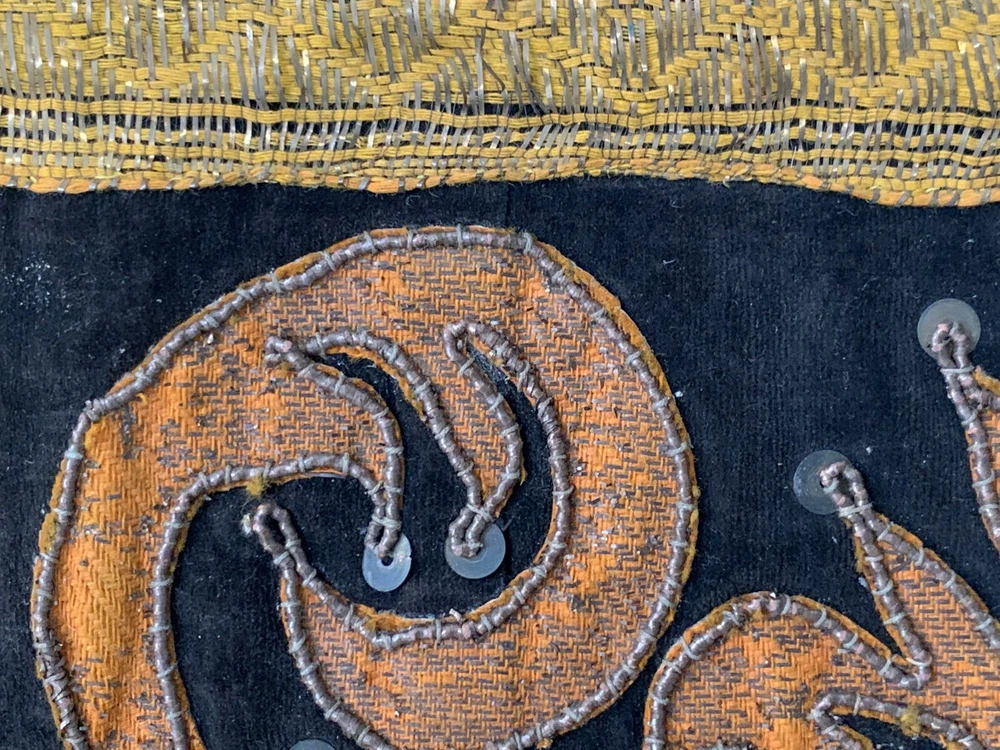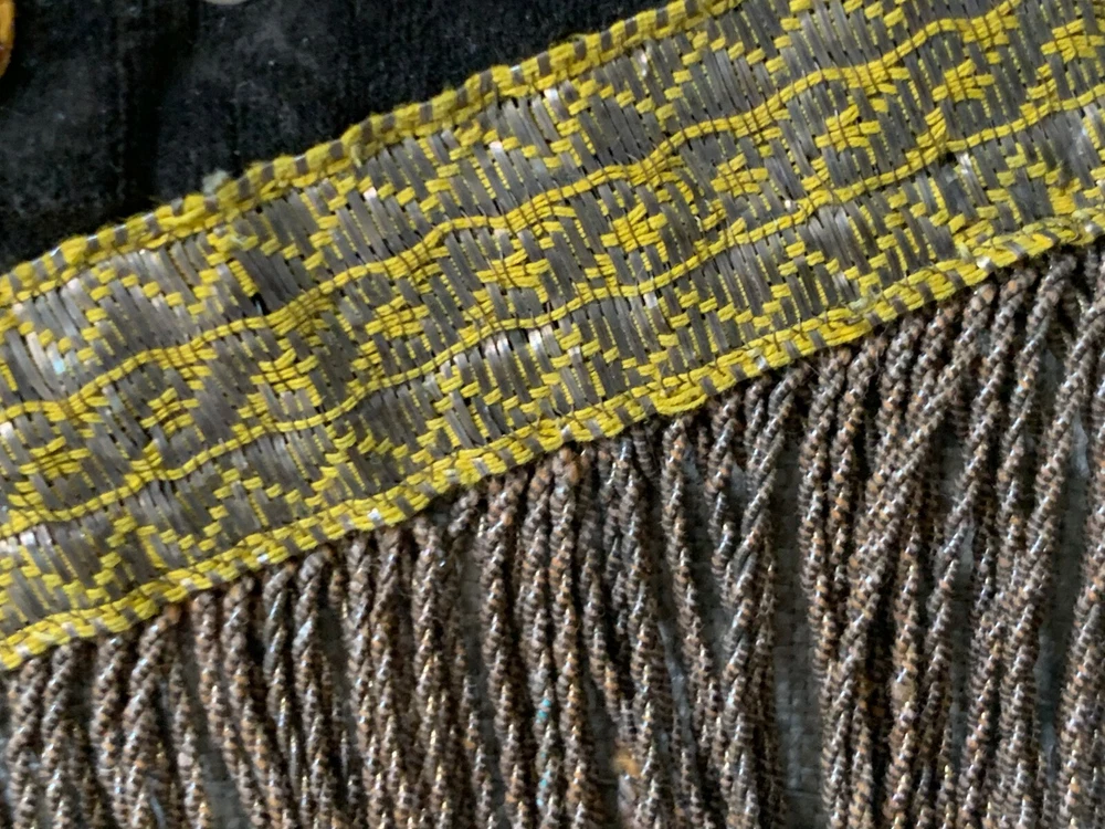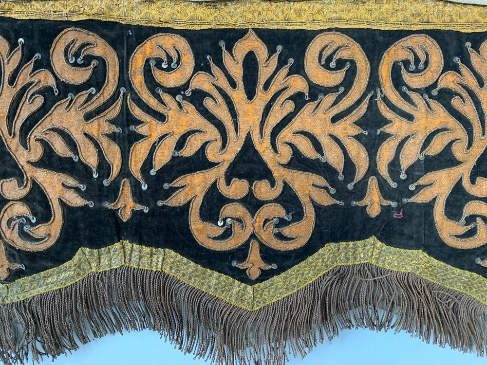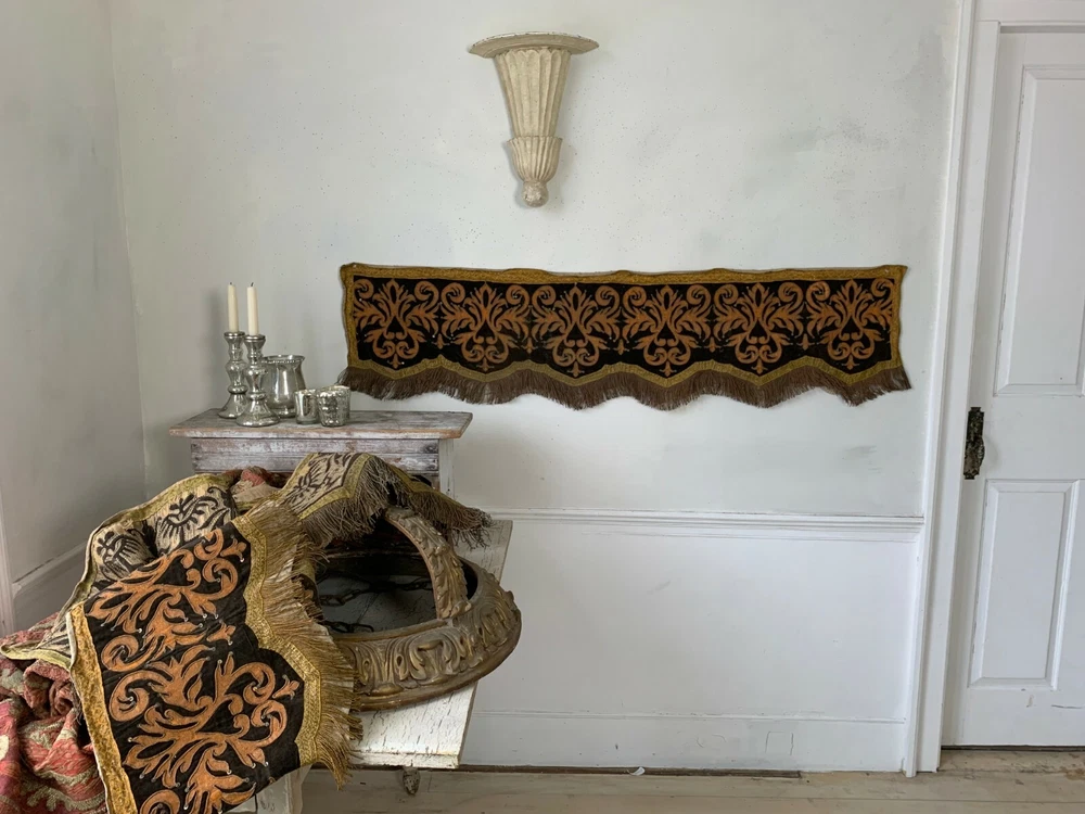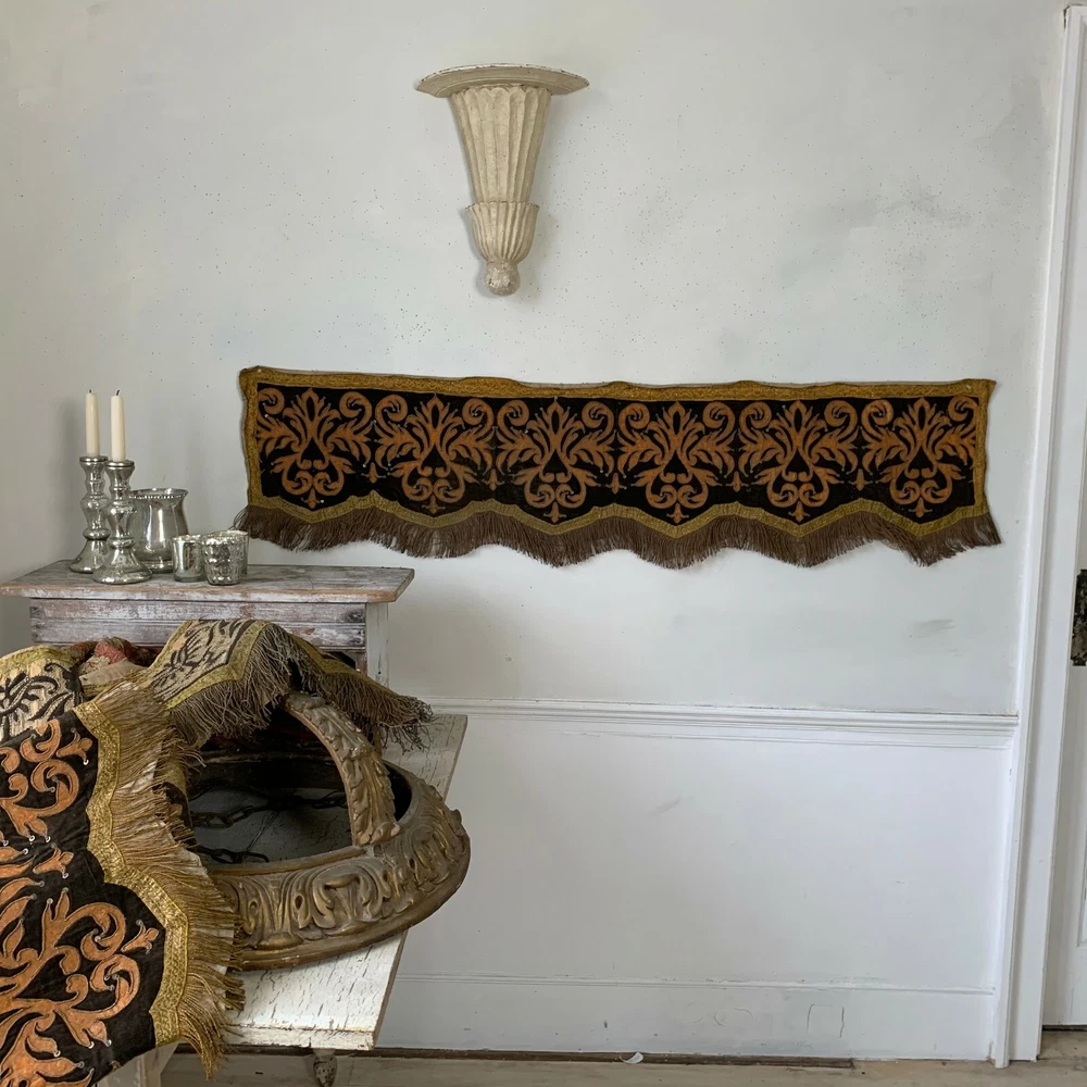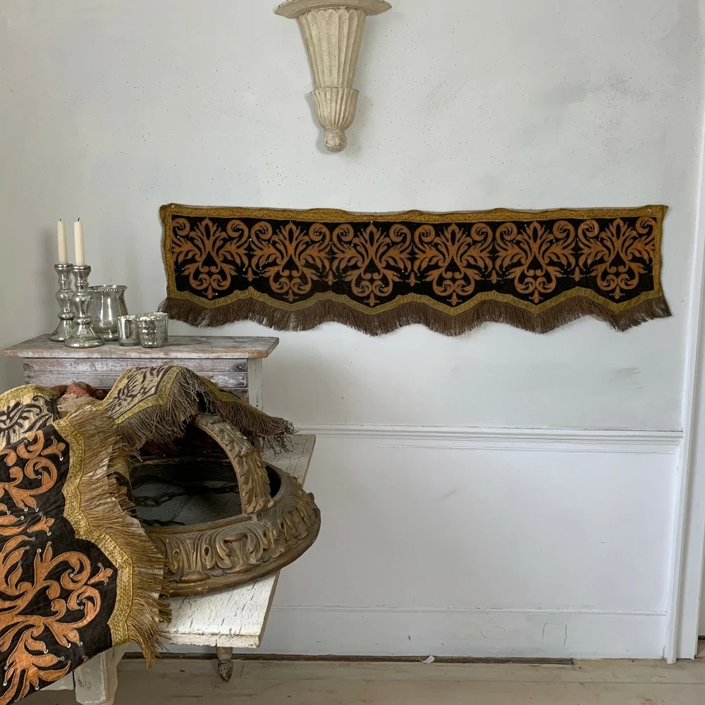 ~*~ Hello and Welcome to The Textile Trunk! Please follow us on Instagram @textiletrunk ~*~ We are so incredibly fortunate to have acquired a remarkable collection of beautiful 18th century Portuguese brocade and appliqué panels! (Please visit my store category called “1700s Brocade Appliqué” to see additional pieces in our collection!) Exquisite and rare, these textiles date from approximately 1725-1750. These pieces were found lovingly stored in a convent but are not religious; in the 18th century (and prior), when expensive textiles became unfashionable the aristocracy would often donate pieces such as these to the church as a way of gaining favor with God. Thankfully, due to being so carefully stored, they remained in the state in which they were donated! Due to their bold, large-scale designs, we can deduce that most likely these incredible pieces would have hung in a large, grand (and no doubt opulent!) room. The back of these textiles often have inventory stamps from throughout the years of being stored and cataloged through time. This listing is for ONE valance; this textile is a remarkable, hand worked combination of Genoa velvet with hand stitched woven brocade designs. The brocade appliqué was backed in paper before being hand stitched in place. They are trimmed in a hemp cording that was first wrapped in a metallic thread that used linen and possibly some silk. It is a remarkable find, ideal for any collector or museum. This textile would also make beautiful wall hangings or decorative table runners, or these could be deconstructed for the fabric – they would incredible made into pieces such as decorative pillows. MEASUREMENTS: This textile measures approximately 13 inches long at the side and 14 inches long at the deepest point (including the 2.5 inch long metallic fringe) by 58 inches wide CONDITION: This piece has been kept in the original, as found condition, and has not ever been laundered. This textile is over 270 years old and is in remarkable condition for its age. There will be flaws on this textile commensurate with age. Some of the brocade and velvet are fragmenting, which is totally and utterly expected for the age of this piece. It’s in good condition for its age but is not without the signs of time and use. There may be some voiding in the velvet, some unraveling of the stitching for the applique, and/or some marks on the back where it once hung on a cold stone wall. Please note the importance of viewing the photographs carefully (and using the zoom feature) to view the condition of each piece in detail, as that is the best guide to be sure it’s right for your project or use. Please do feel free to email me with any questions about a specific piece; we are always here to help and are happy to answer questions! inv #: P58