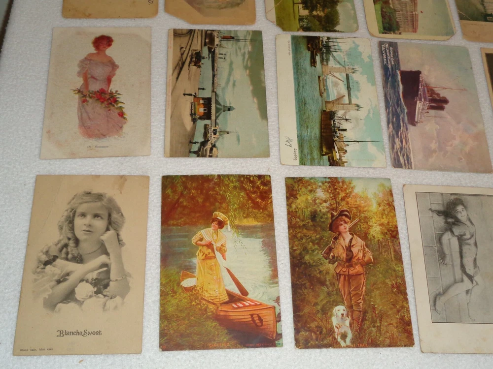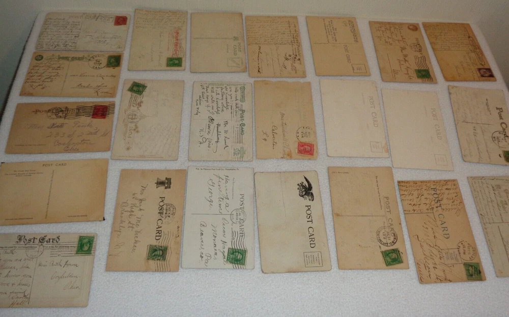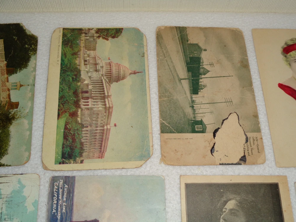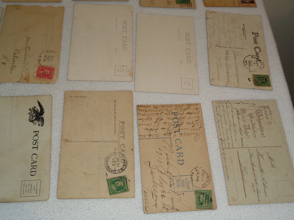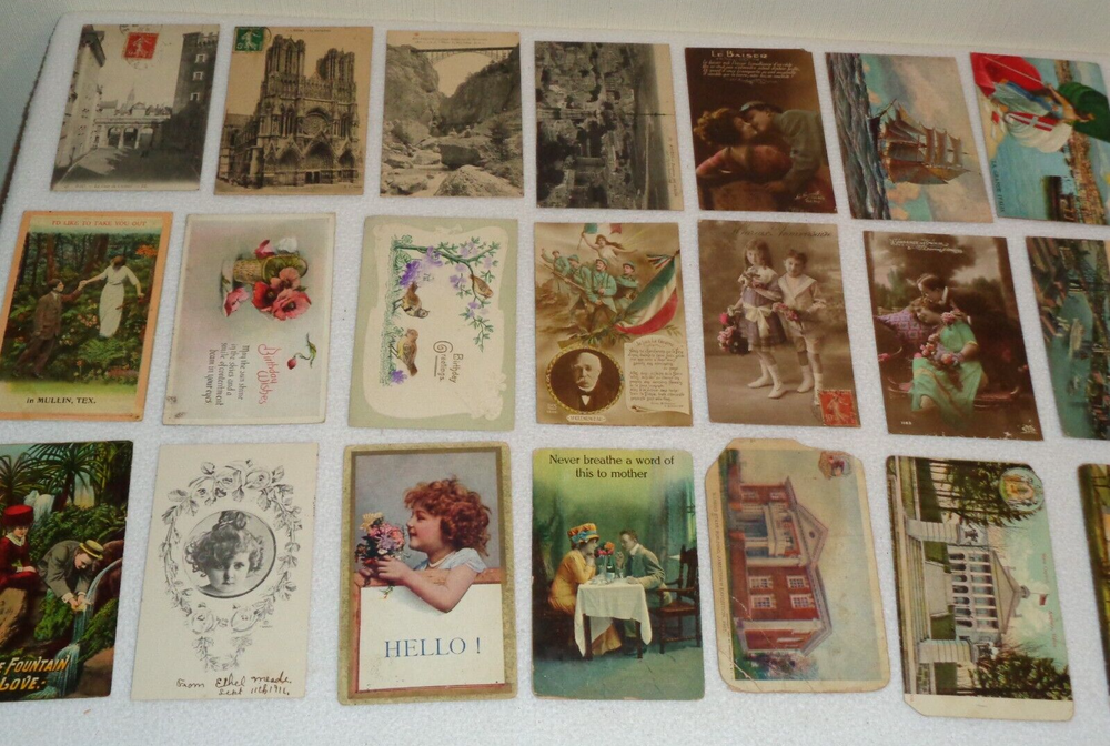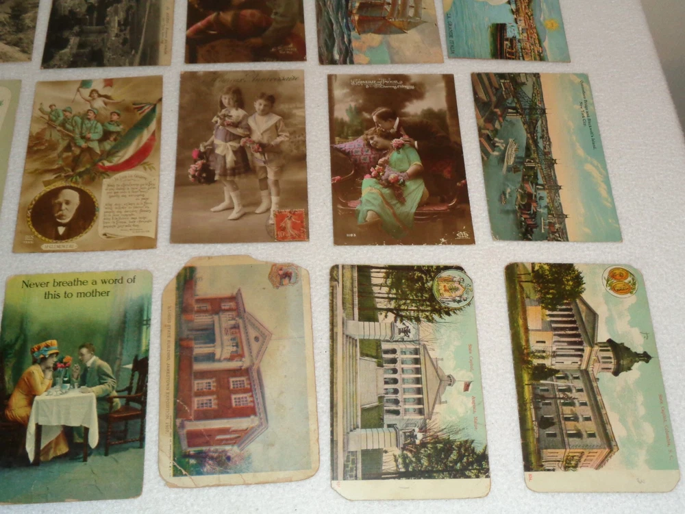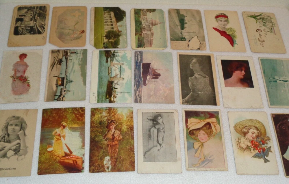 Postcard Lot - Over 80 Post Cards - Antique Victorian Vintage Collection Approximately 86 total postcards in this collection. Postcards are in used condition with missing corners, edge tearing, chipping, creasing, discoloration, marks and other wear. Some postcards having writing on them and were mailed, while others are without ink. Some of them may have been removed from cardstock paper and have paper (or parts of paper) affixed to the reverse side. A few have heavy tearing and are missing segments of the postcard itself. Some postcards appear to have been trimmed along the edges, and are smaller in size than the typical postcard. I noticed some have paper affixed to the corners. A few have heavier creasing or folds as well. One has heavy surface tearing, as shown in the last photo. Please see photos for more information on condition and ask any questions you may have.