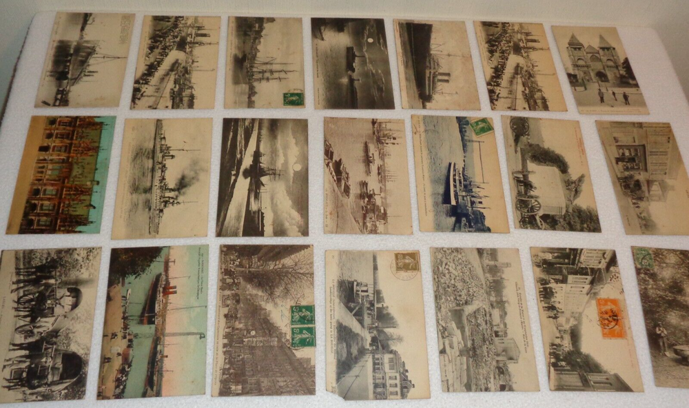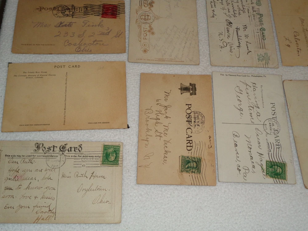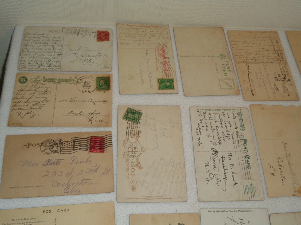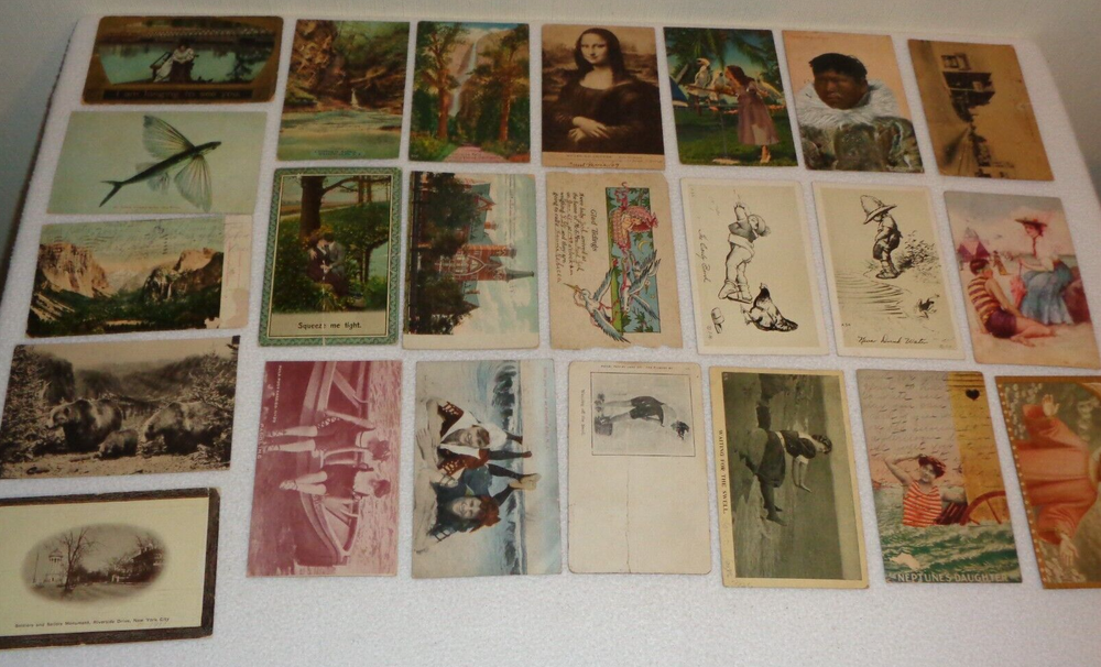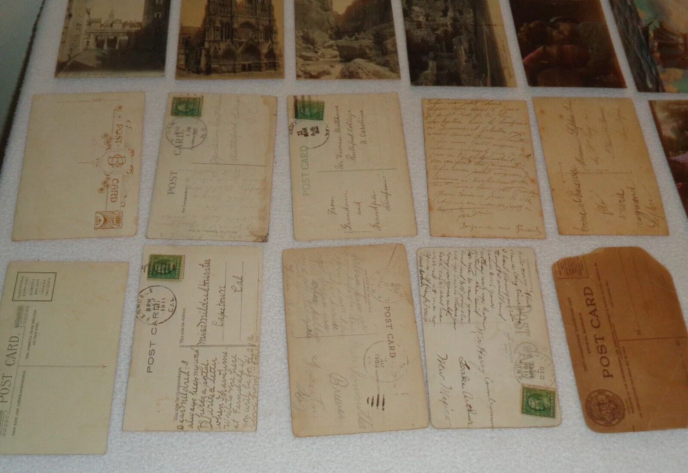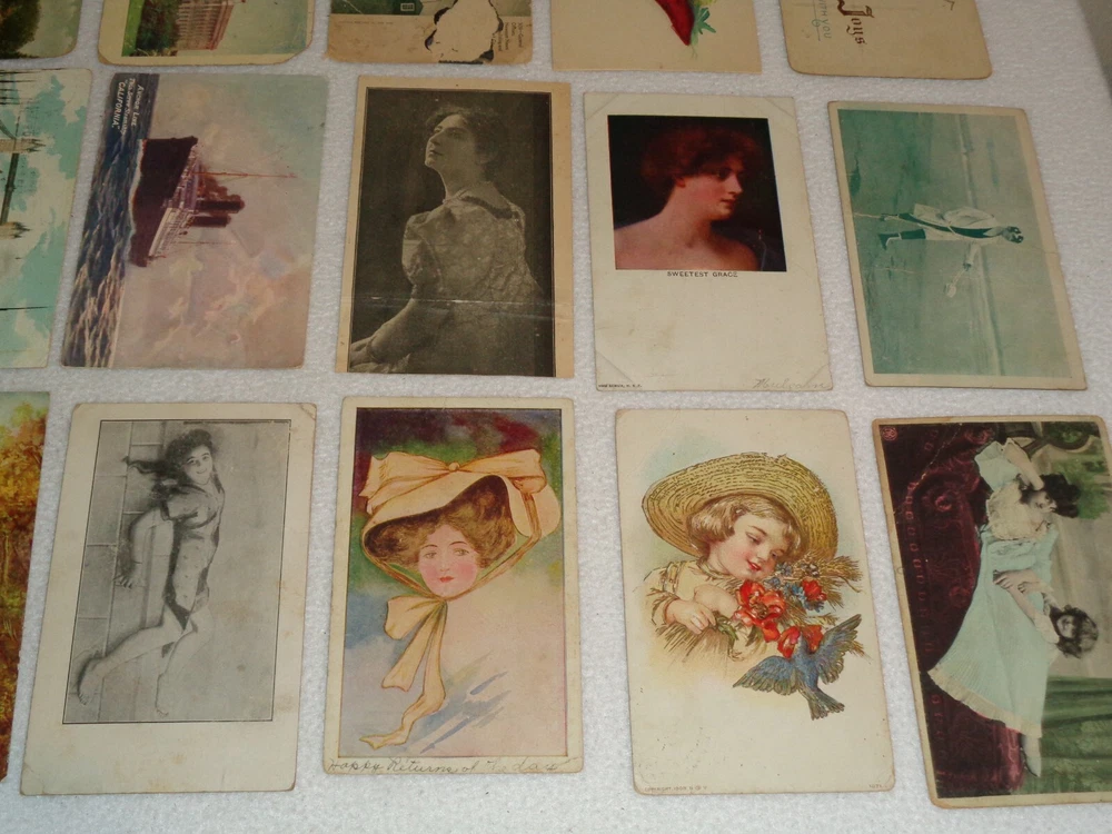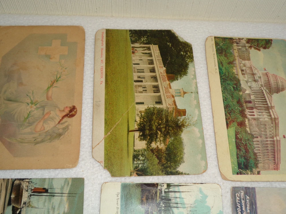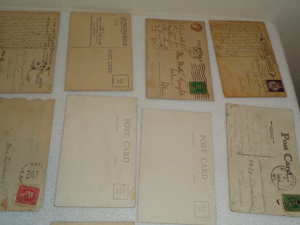 Postcard Lot - Over 80 Post Cards - Antique Victorian Vintage Collection Approximately 86 total postcards in this collection. Postcards are in used condition with missing corners, edge tearing, chipping, creasing, discoloration, marks and other wear. Some postcards having writing on them and were mailed, while others are without ink. Some of them may have been removed from cardstock paper and have paper (or parts of paper) affixed to the reverse side. A few have heavy tearing and are missing segments of the postcard itself. Some postcards appear to have been trimmed along the edges, and are smaller in size than the typical postcard. I noticed some have paper affixed to the corners. A few have heavier creasing or folds as well. One has heavy surface tearing, as shown in the last photo. Please see photos for more information on condition and ask any questions you may have.