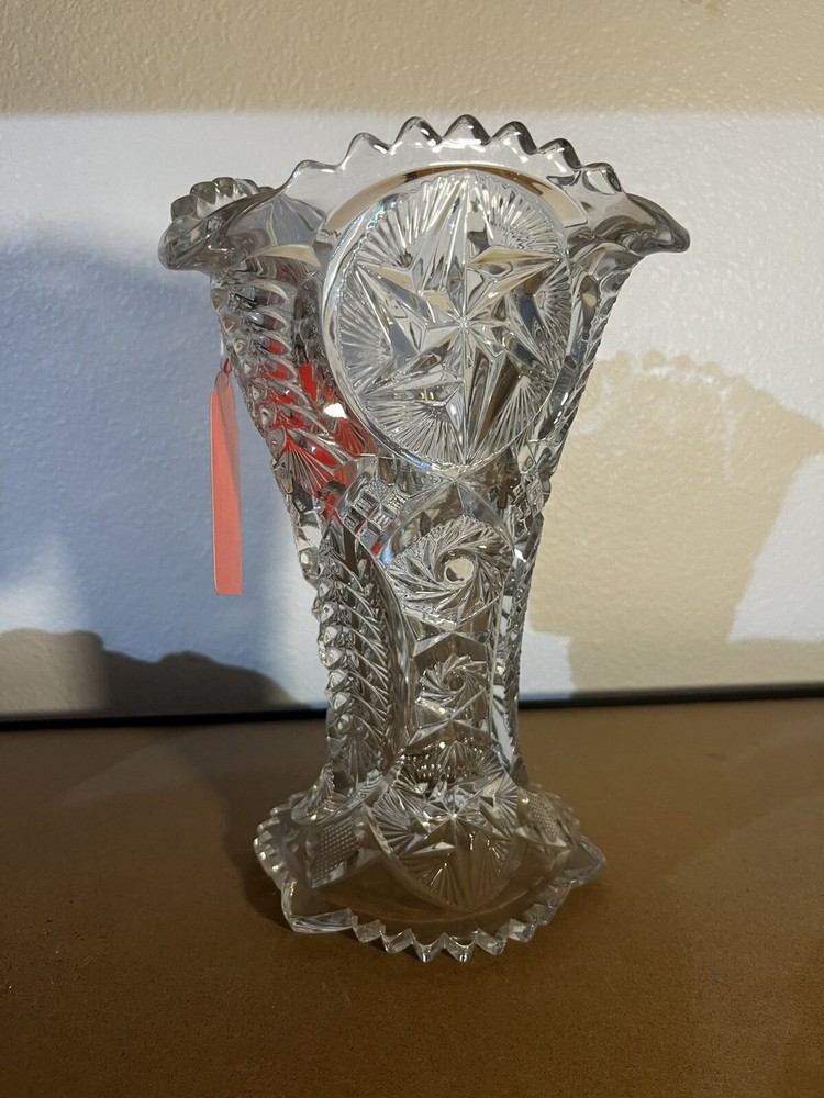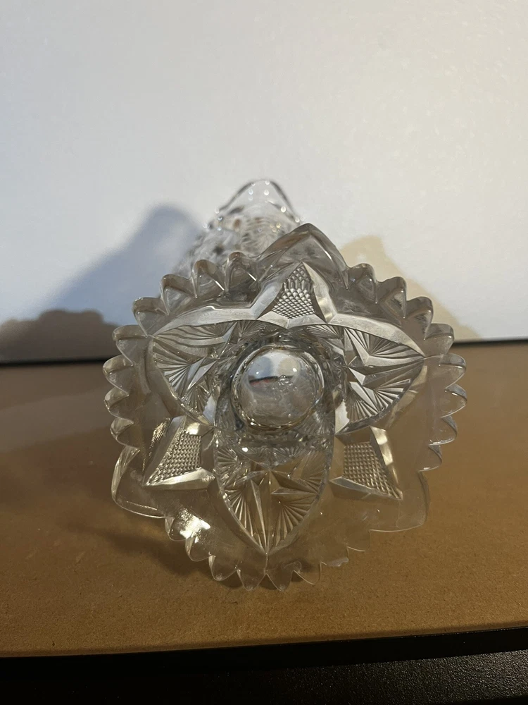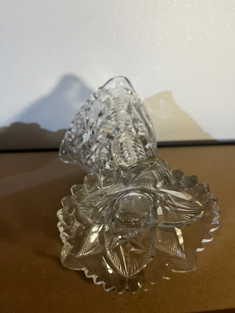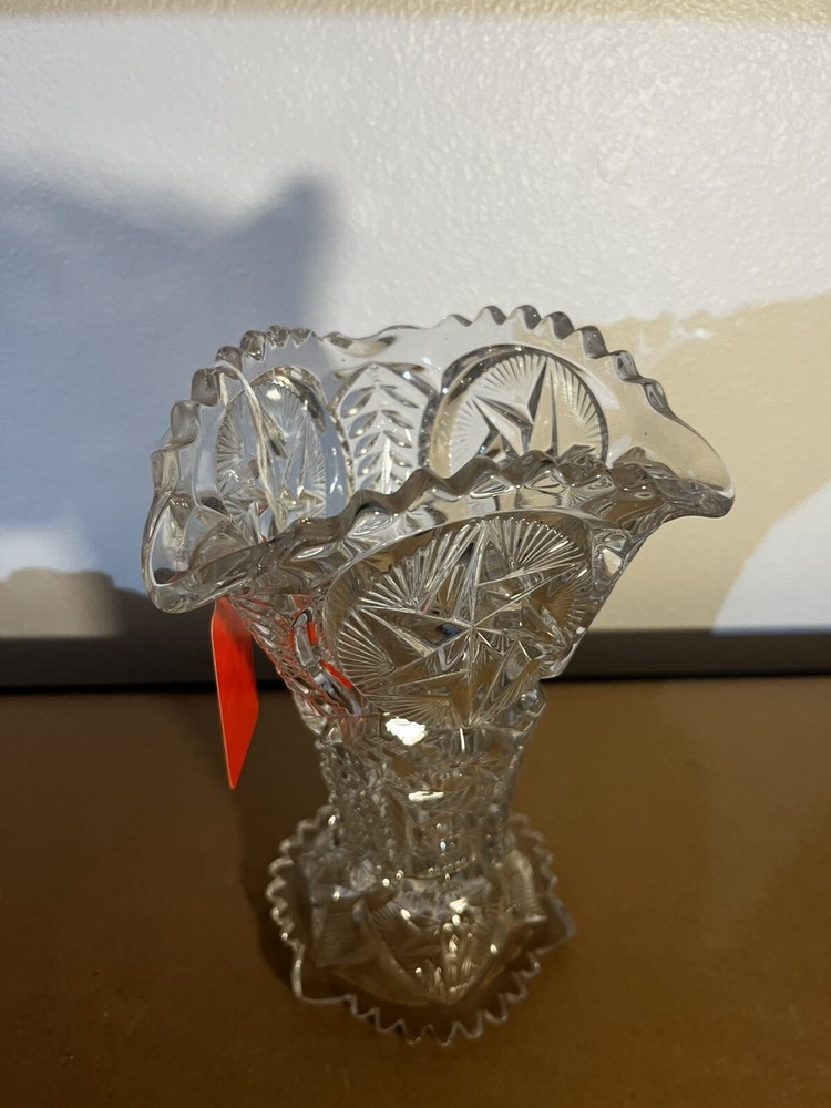 The Vintage Pressed Cut Glass Vase is a decorative collectible made of glass. It features a classic design with intricate pressed cut detailing. Perfect for displaying flowers or as a standalone decor piece, this vase adds a touch of vintage charm to any space.