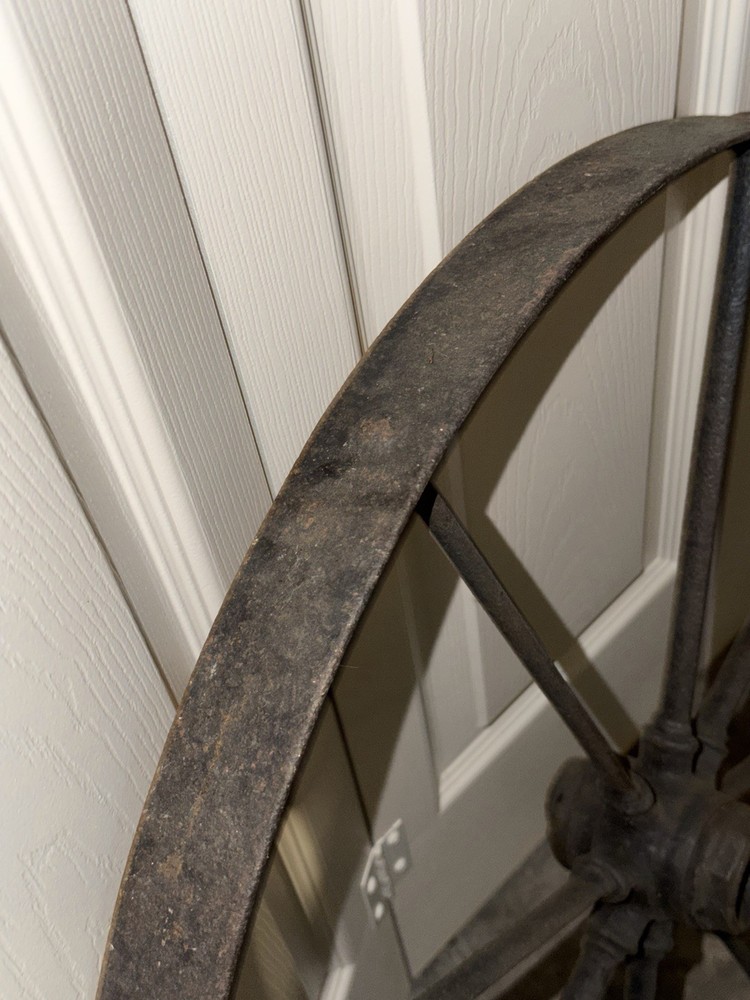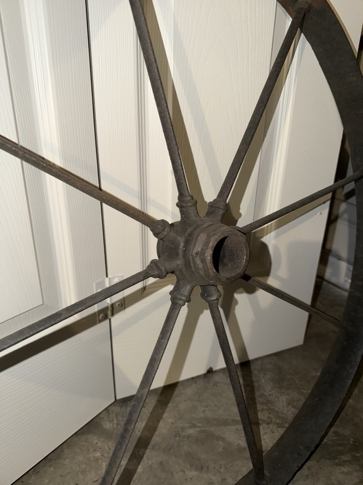 26” wheel size. The product is an antique primitive metal wagon wheel, featuring a large size of greater than 30 inches. This farm equipment piece is made of metal and showcases a primitive style, with a brown color finish. Despite being unsigned, it still exudes a rustic charm that would make it a unique and striking addition to any antique collection or rustic decor setting.