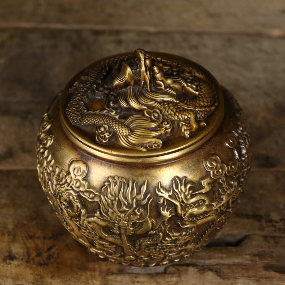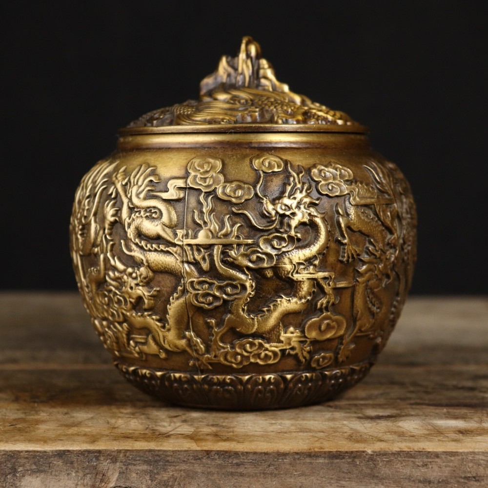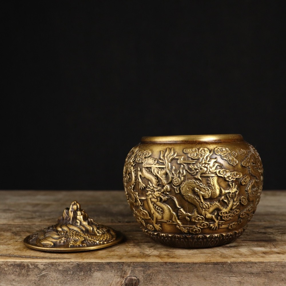 Product Description; Antique Pure Copper Tripitaka Paper Colored Nine Dragon Jar This dragon jar is made of refined copper casting, with nine auspicious dragons. It is hand polished and has the color of hidden scripture paper. The carving is exquisite and lifelike, with delicate polishing and a heavy hand feel. This dragon jar has the meaning of attracting and receiving wealth, Caliber: 9cm Abdominal diameter: 12cm Height: 12.8cm Weight: Approximately 1050g; 01jxlf Payment Delivery details Terms of sales About us Contact usPaymentWe only accept PayPal paymentDelivery detailsUnited States: By China post 7-15 working days delivery! Other countries Regular AirMail Takes 25-40 working days If you need to quickly get it, you need to pay extra shipping costs All items will be shipped within 1-7 days upon receipt of cleared payment.Terms of sales Communication can solve 100% of problems, we care every single customer. If you have any questions please do not hesitate to contact us , We will give you an answer and give you the best price within 24 hours Non-professional photography. As the light of reason. Pictures anditems may have a little color difference. Please understand About usAll items sold by us are being described to the best of our abilities, as accurate as possible, and with utmost conscientiousness on our part. However, to avoid any potential oversights, I respectfully request your assistance in helping us to make this a mutually satisfactory transaction by thoroughly reviewing item description and photos, and asking all questions PRIOR TO BIDDING. Please Note that size and color representation are subject to manufacturing variance and may not be exact. Also note that monitor settings may vary from computer to computer and may distort actual colors. Please read these terms thoroughly before placing your bid.Contact usMy goal is to try our best to fulfill your satisfaction. If you are not satisfied with our products, please contact us, we will give you a satisfactory answer!Thank you very much!!!!!!