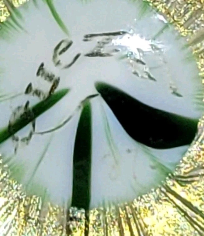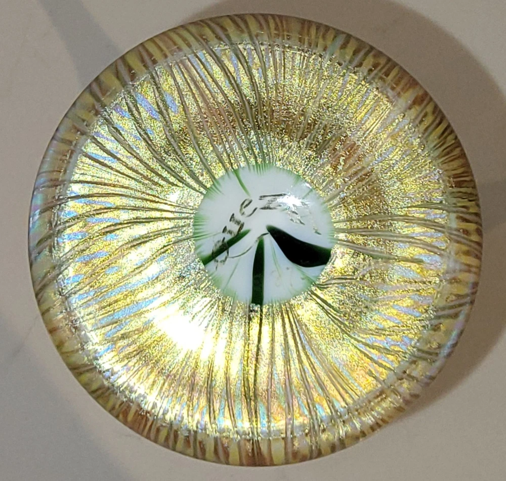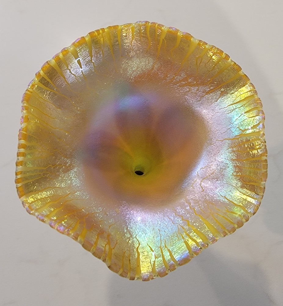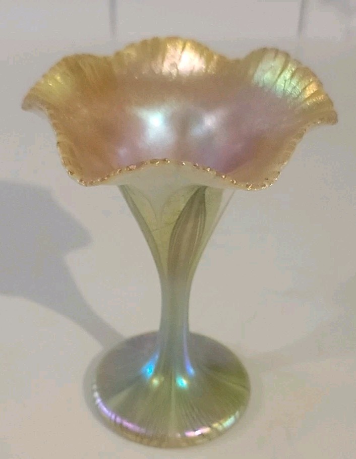 A beautiful authentic Art Nouveau iridescent glass vase by the famous Quezal Art Glass and Decorating Company. This piece features a graceful Floriform design, mimicking the elegant opening of a flower. Design & Artistry: ☆Style: Floriform (symmetrical flared rim). ☆Pattern: Classic green and gold "Pulled Feather" motif on an opal white body. ☆Luster: The wide, scalloped rim features a brilliant gold iridescent finish with striking pink and purple highlights. ☆Signature: Signed "Quezal" on the bottom (see photos). Condition: The vase displays beautifully with exceptional color. ☆☆☆NOTE: A very thin hairline is present on the stem. It remains a stunning display piece for any collector.☆☆☆