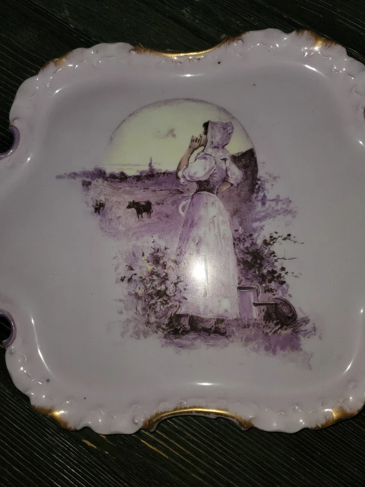 This antique bread plate features a beautiful design of a girl in a field, made by Rosenthal during the time period of 1850-1899 in Germany. The plate is made of ceramic material and has a stunning purple color. It would make a great addition to any collection of decorative cookware, dinnerware, or serveware. The plate is pre-owned, but has been well-maintained and is in great shape for its age.