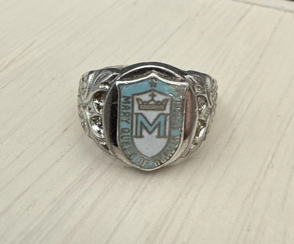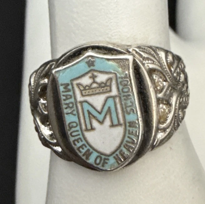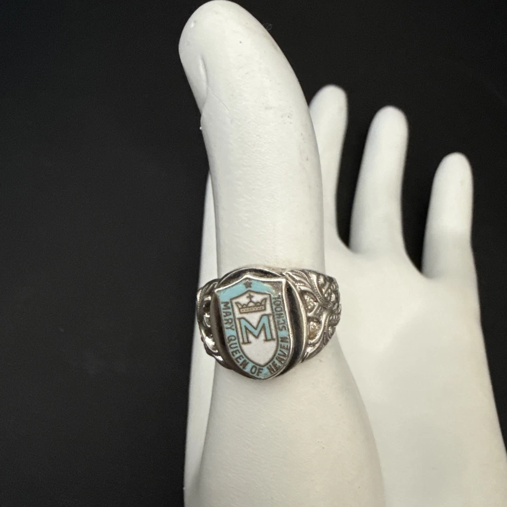 Antique Ring SK & F Sterling Mary Queen Of Heaven School Class Ring (1969) Size 6.5 Some of Turquoise Enamel is Faded; otherwise in good vintage condition. See Photos (5470)