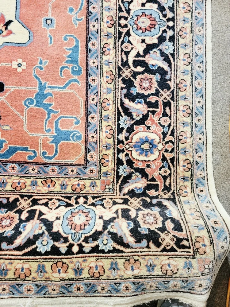 The product is a unique Antique Serapi Style Sultanabad Rug, hand-knotted with wool and measuring 10x14 feet. This multicolor rug features a traditional medallion pattern, typical of Sarabi-Serapi designs. Handmade and originating from the Asian culture, this antique rug is a timeless piece that can add a touch of elegance to any room. Its hand-knotted weave and high-quality material make it a durable and stylish addition to any home décor.