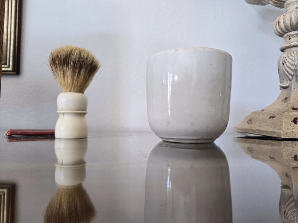 Antique shaving items includes US Army Gillette shaver with original blades, straight edge shaver with what looks like an ivory handle. Hone in original box, two boars hair shaving brushes, shaving mug, leather razor strop and other blades.