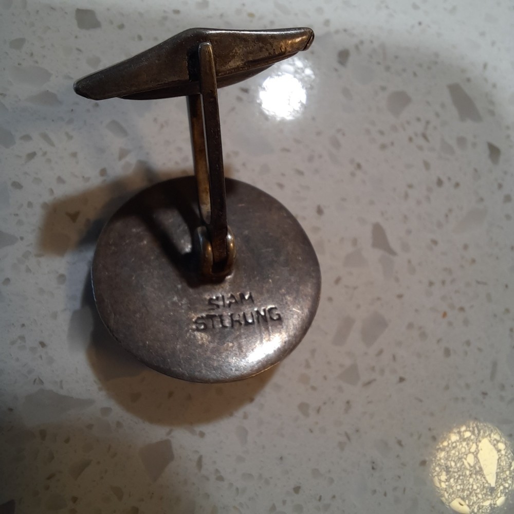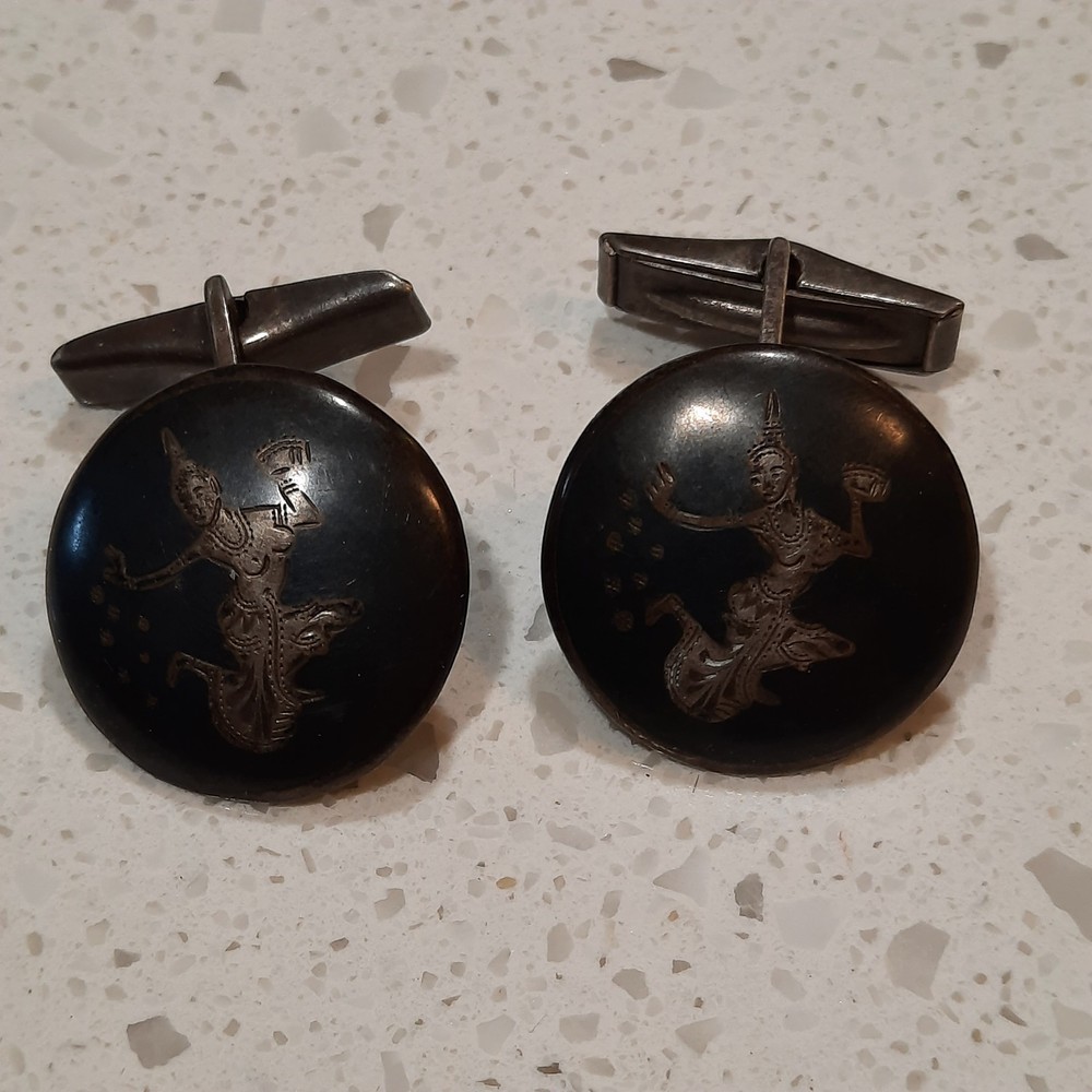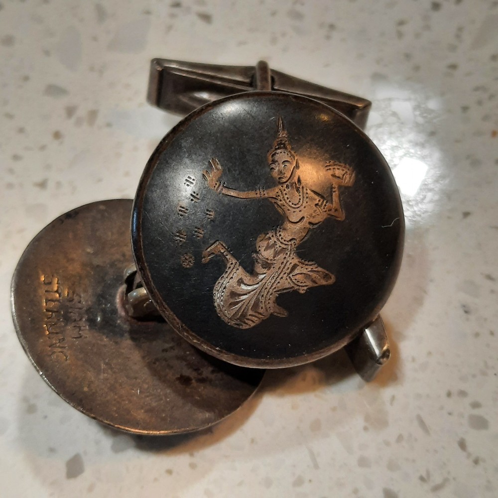 The product is a set of antique Siam sterling silver niello carved cufflinks, featuring the goddess of lightning. These vintage cufflinks are signed by the maker and are made of 925 sterling silver. The intricate design and craftsmanship reflect the beauty and artistry of the Siam culture, with a theme that includes lightning, signs and symbols. Perfect for men who appreciate unique and ethnic-inspired accessories, these cufflinks are a timeless piece of jewelry with a touch of history and tradition.