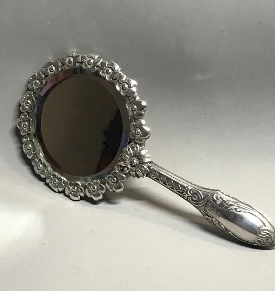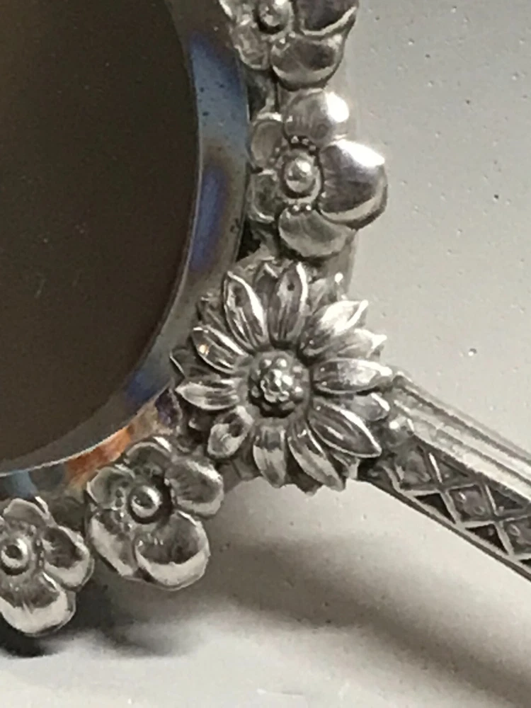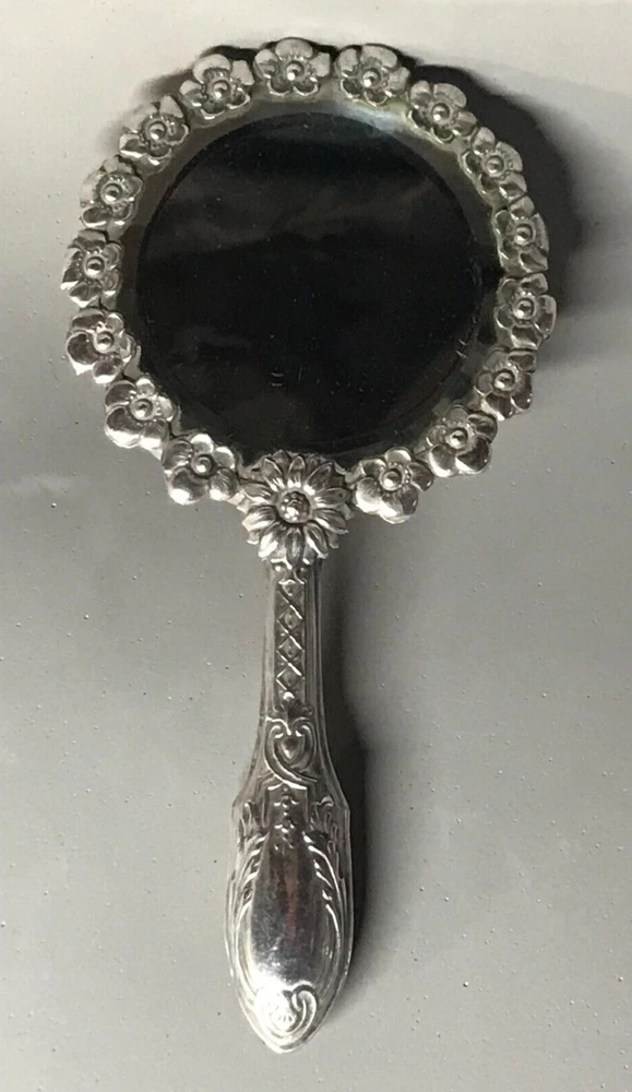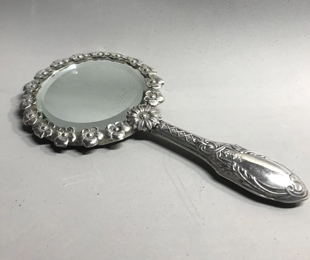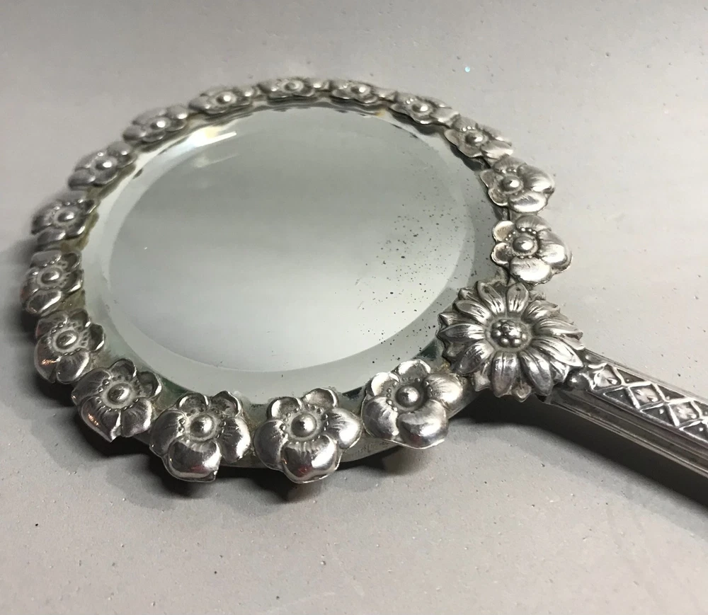 FROM MADEIRA WITH LOVE....! Found in an estate liquidation on the island of Madeira in Portugal, that of a retired antiques dealer. Small scaled antique Portuguese silver hand mirror. Portuguese silver has a purity of 830 / 870. Made of silver, fitted with a beveled glass mirror and a wooden backing. A circle of flowers encapsulate the mirror. The handle with repousse scrolls and leaves. More like a play size or purse mirror, it measures 6 1/2 inches end to end while the mirror component measures 3 1/4 inches in diameter. It has survived in good condition. Some age related spotting on the mirror as well as the kinds of use abrasions one would always find on any used estate silver will be found. The wood backing has a few nicks and scratches as well. There is a Portuguese hallmark on the back of the collar. The handle is free of dents or distortions. I have inserted a standard size playing card in one photo as a reference for size. MUCH OBLIGED
