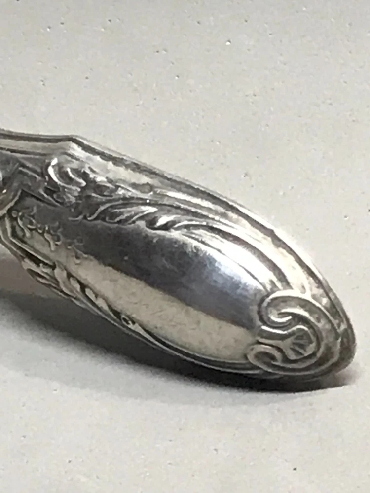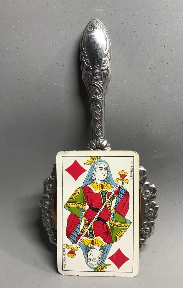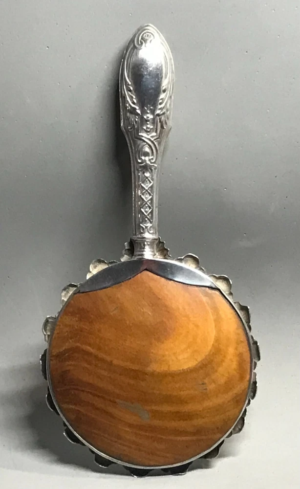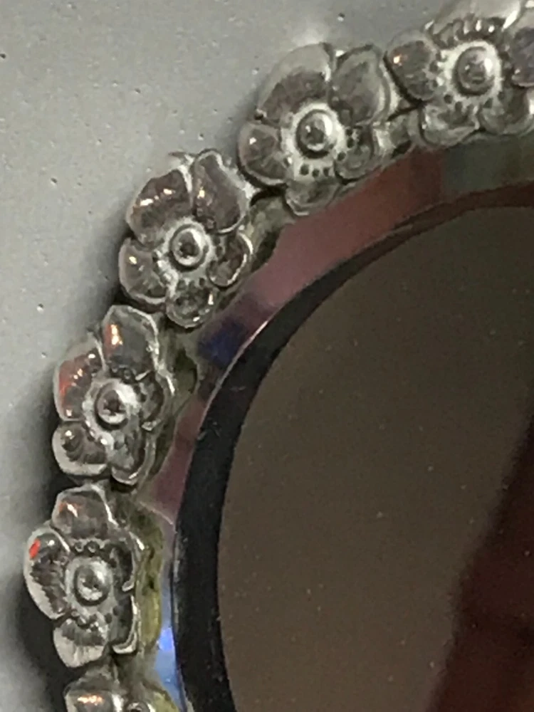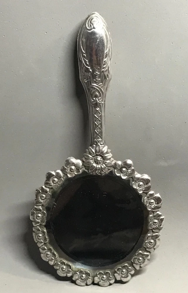 FROM MADEIRA WITH LOVE....! Found in an estate liquidation on the island of Madeira in Portugal, that of a retired antiques dealer. Small scaled antique Portuguese silver hand mirror. Portuguese silver has a purity of 830 / 870. Made of silver, fitted with a beveled glass mirror and a wooden backing. A circle of flowers encapsulate the mirror. The handle with repousse scrolls and leaves. More like a play size or purse mirror, it measures 6 1/2 inches end to end while the mirror component measures 3 1/4 inches in diameter. It has survived in good condition. Some age related spotting on the mirror as well as the kinds of use abrasions one would always find on any used estate silver will be found. The wood backing has a few nicks and scratches as well. There is a Portuguese hallmark on the back of the collar. The handle is free of dents or distortions. I have inserted a standard size playing card in one photo as a reference for size. MUCH OBLIGED
