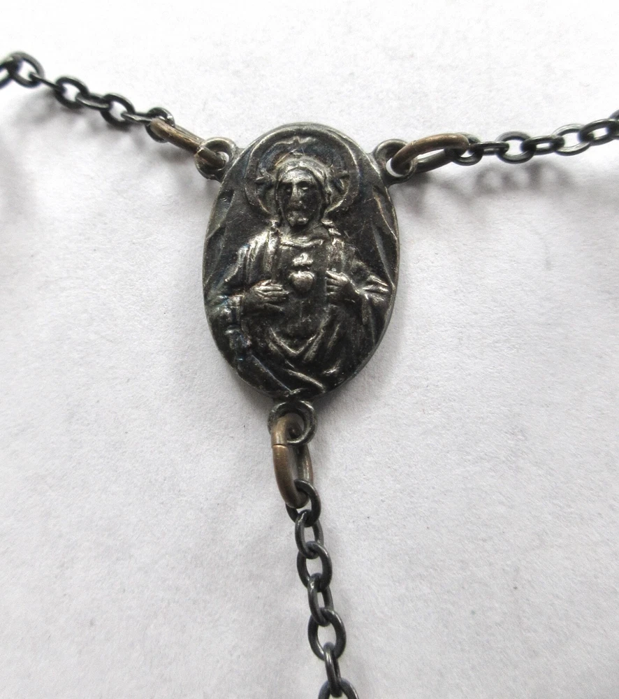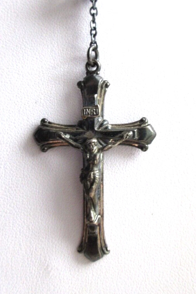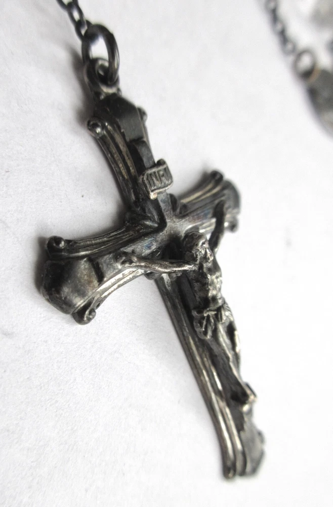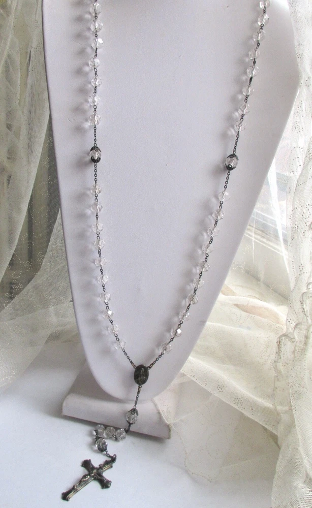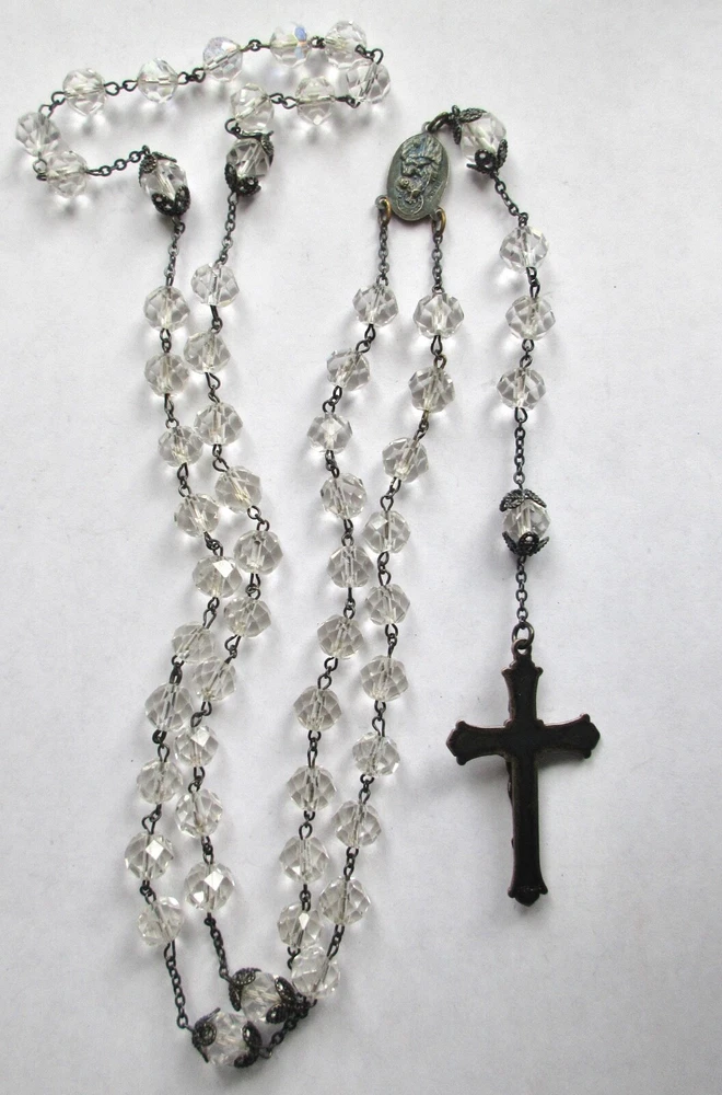 Sterling Silver CRYSTAL BEADS ROSARY Pre-1930 Unsigned Antique rosary with faceted clear transparent crystal beads. Beads vary slightly in size due to early bead manufacturing process. Some faceted edges may have nicks/bites. No major breaks or cracks. Crucifix and oval station both marked, "STERLING." Original patina left unpolished. CRUCIFIX: 1 7/8" Long x 1 1/8" Wide ROSARY LENGTH: 24" Long top to bottom (Long enough to wear around neck.) Sellers items are all in as-found, used vintage/antique conditions. Please contact seller w/any questions/concerns BEFORE bidding.