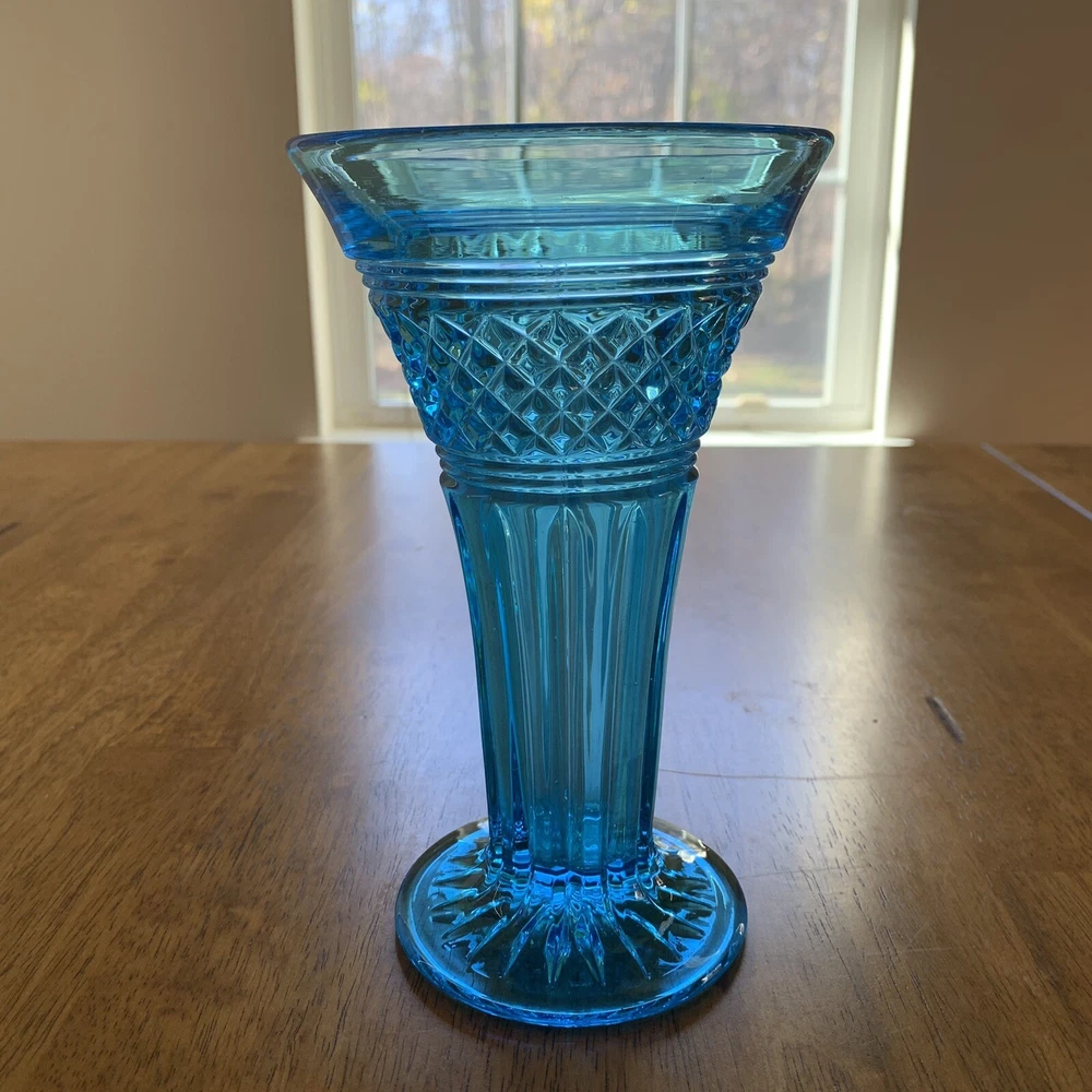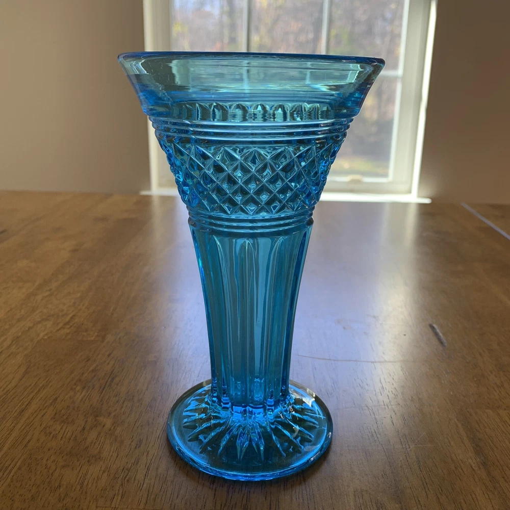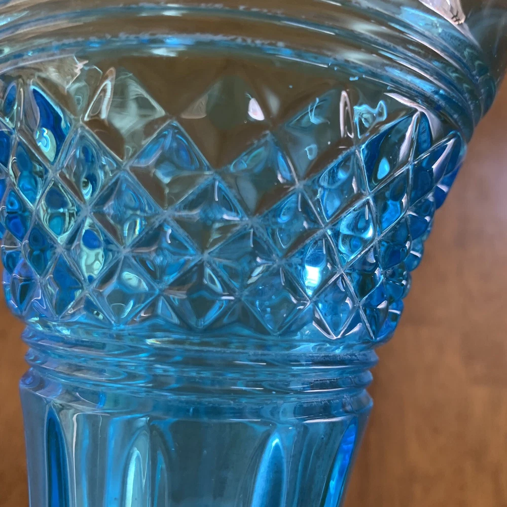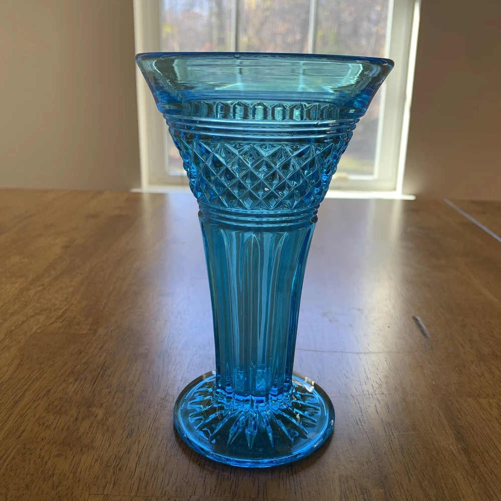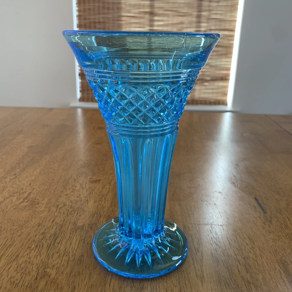 Model: Tiffin-Francisan Baronial Item Height: 7 5/8 inches Origin: United States Country/Region of Manufacture: United States Era: Early 20th Century (1911-1940) Year Manufactured: 1920 Production Style: Art Glass Type: Vase Item Width: 4 1/2 inches Wide At Top Material: Glass Finish: Glossy Antique: Yes Brand: Tiffin-Francisan Pattern: Diamond and Crisscross Item Weight: 1 lb 7.1 ounces Features: Decorative Time Period Manufactured: 1920-1929 Color: Blue